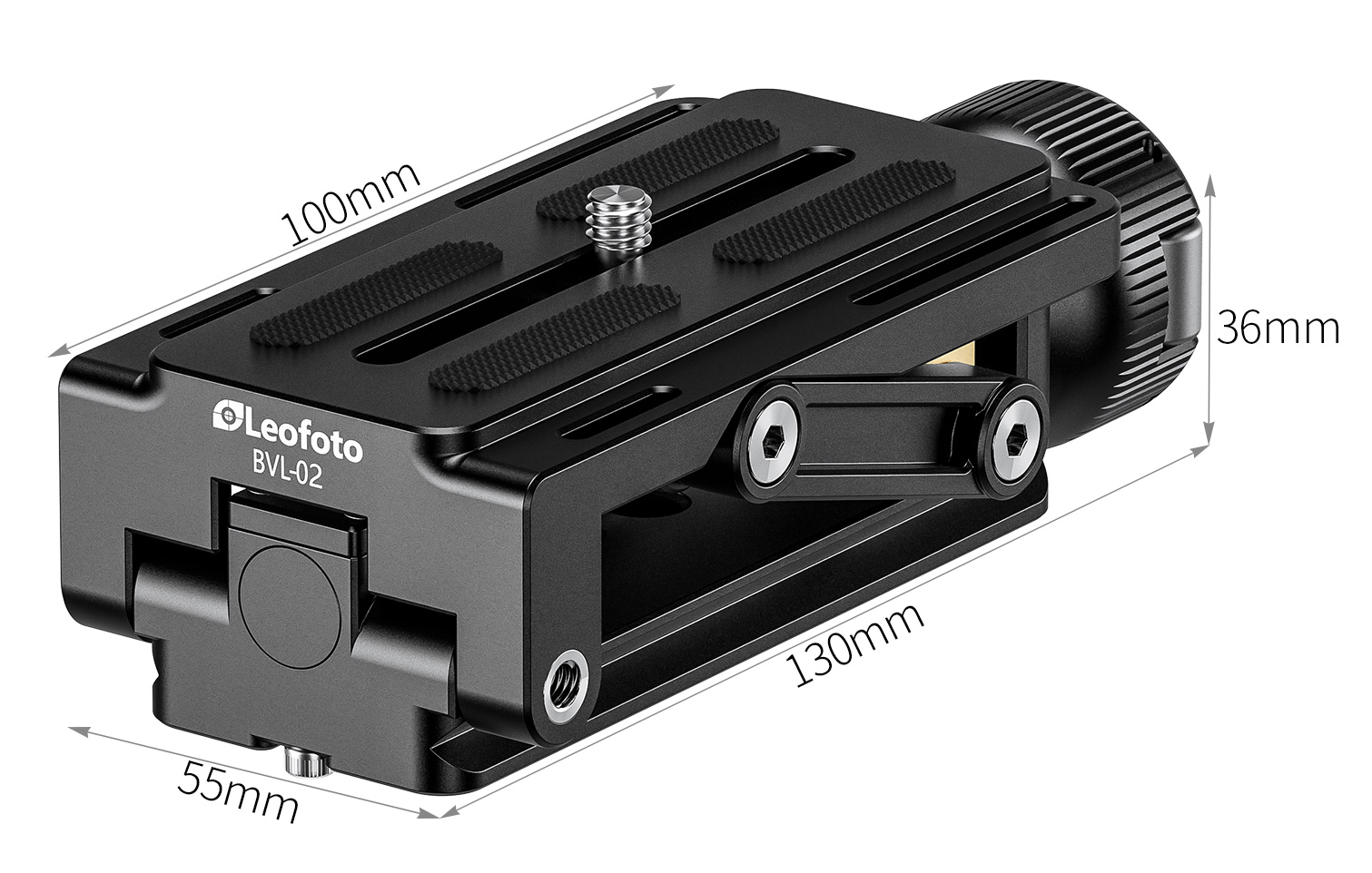 The base includes an Arca-Swiss-style dovetail mount for quick attachment to tripod heads, plus both 3/8″ and 1/4″ mounting threads for direct connection to tripods.