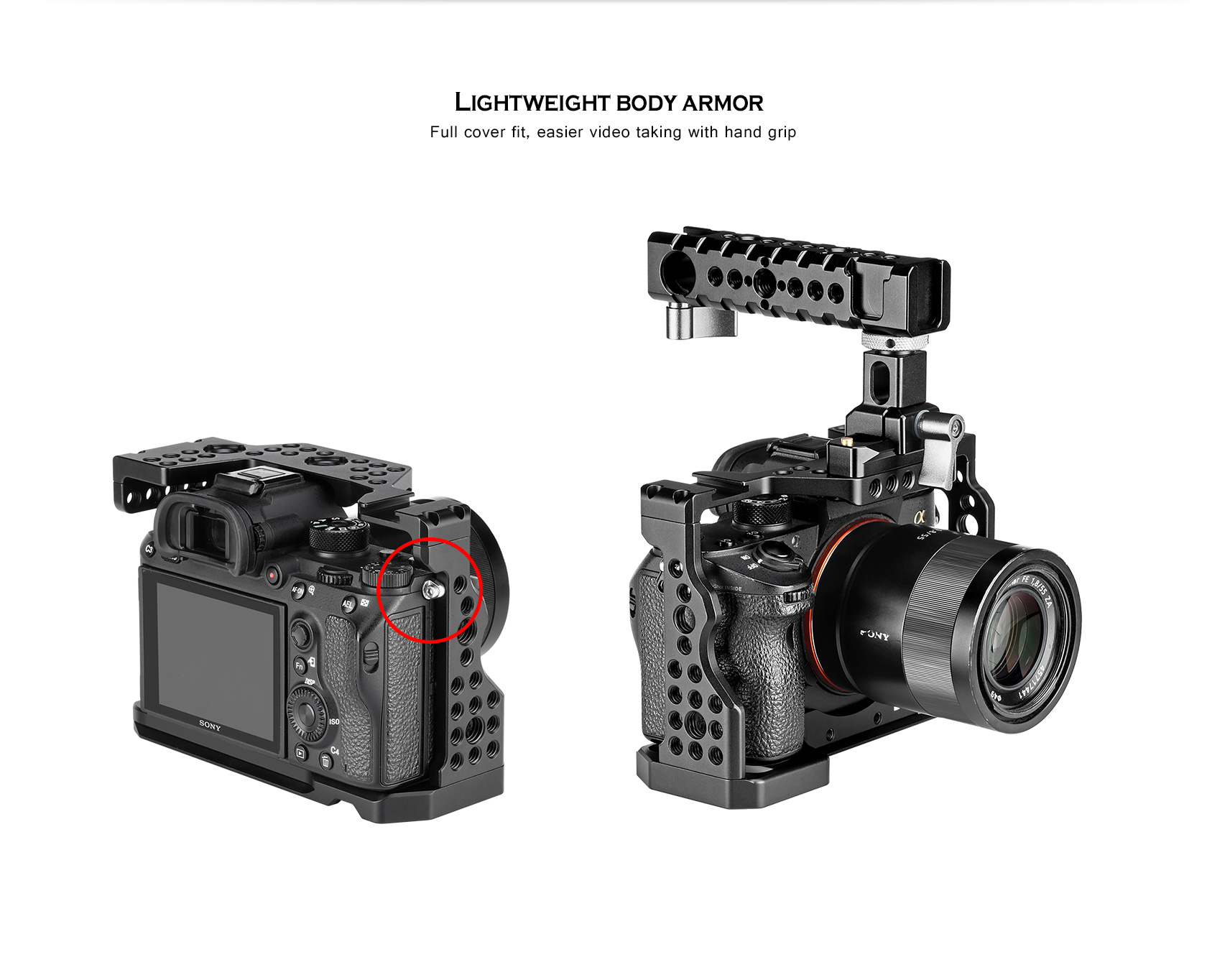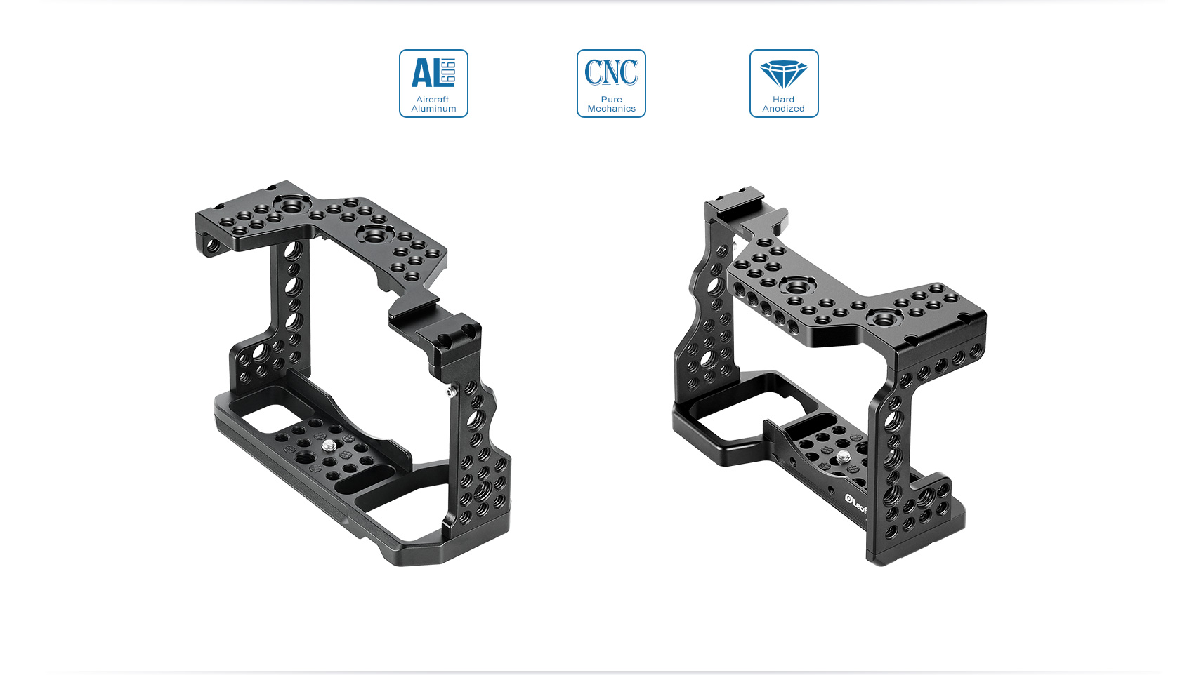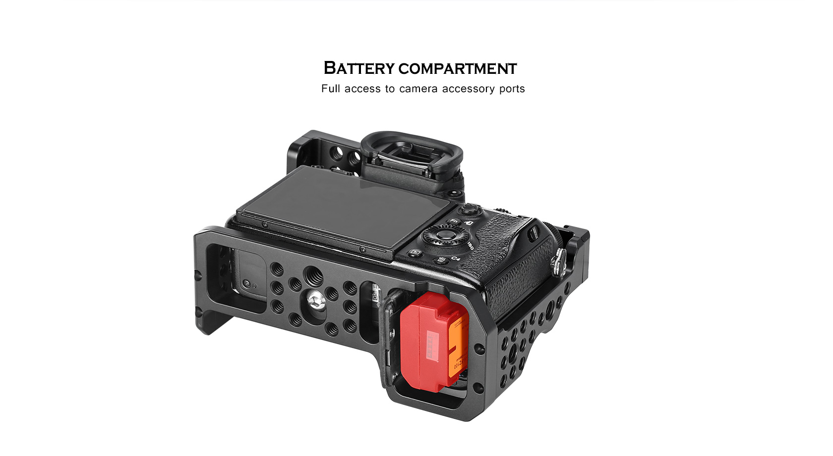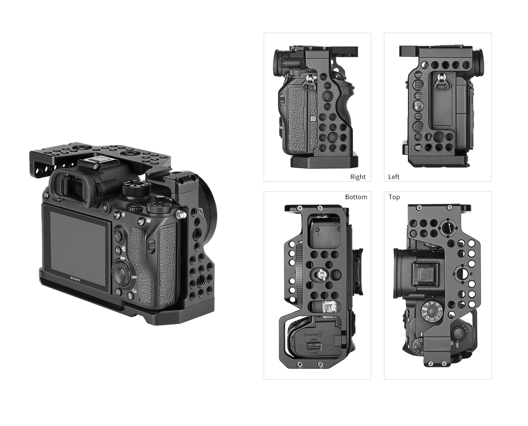 This formfitting anodized aircraft-grade aluminum cage maintains access to the camera’s controls and features a variety of mounting options. A raised front plate prevents your camera from twisting in the cage and has tapped holes for mounting optional accessories such as lens supports.