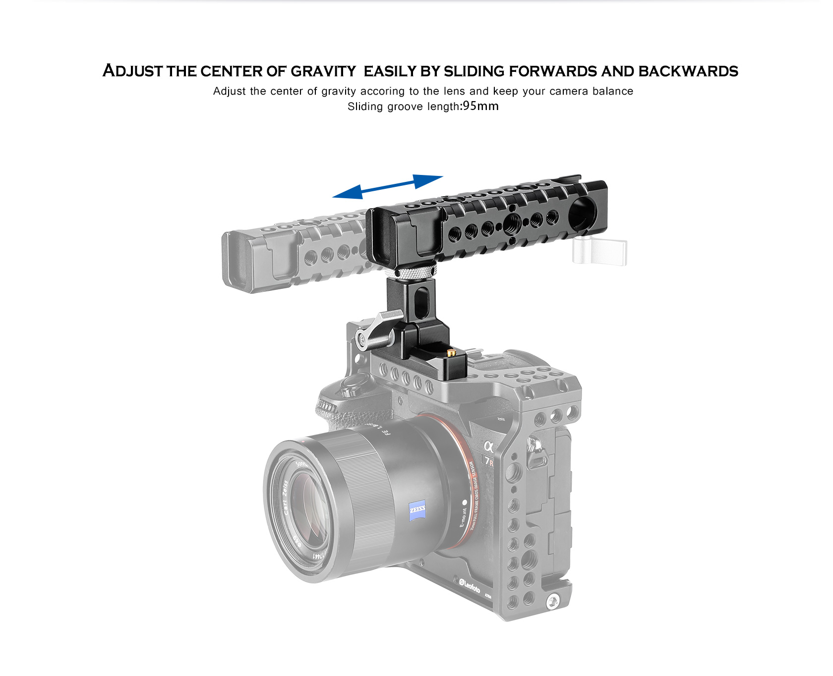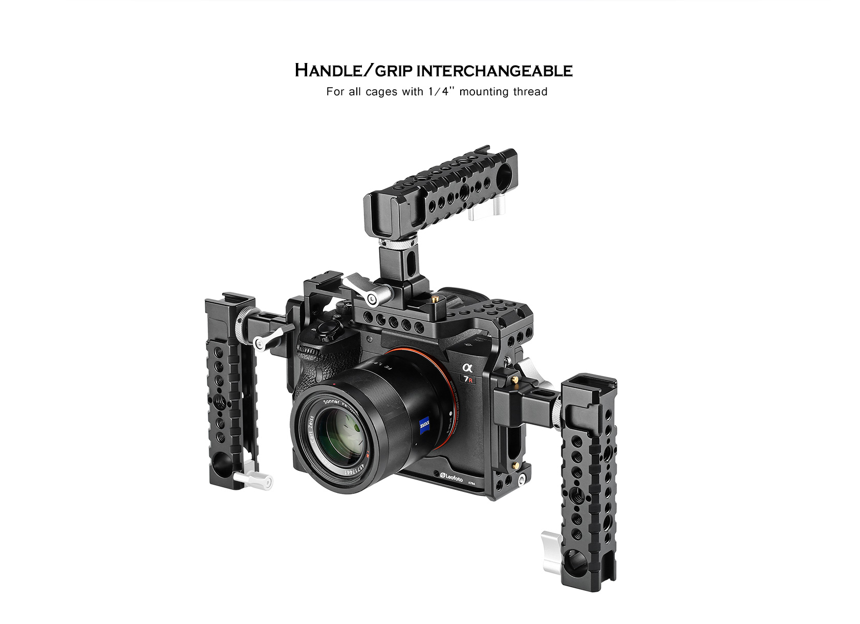 The handle is CNC machined from 6061-T6 aluminum and hard anodized making it light weight and durable. It features various mounting sockets along the handle that allow simultaneously mounting microphone, LED light, monitor, and other accessories. Overall, the lightweight and practical handle can provide a wide range of mounting points and an excellent shooting experience.