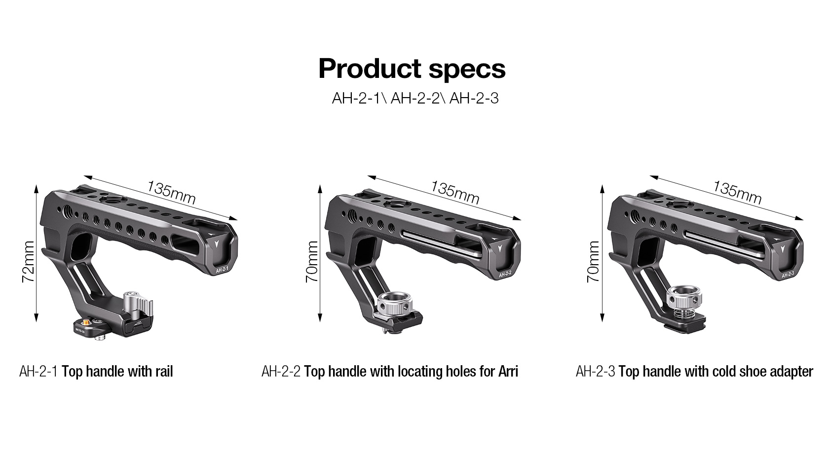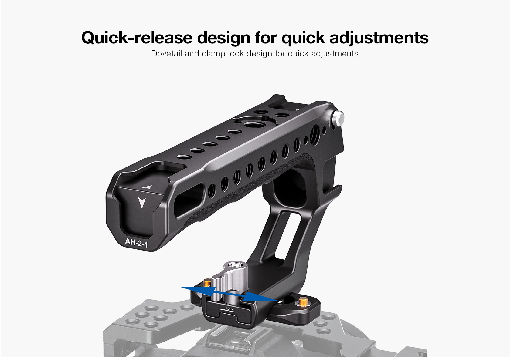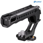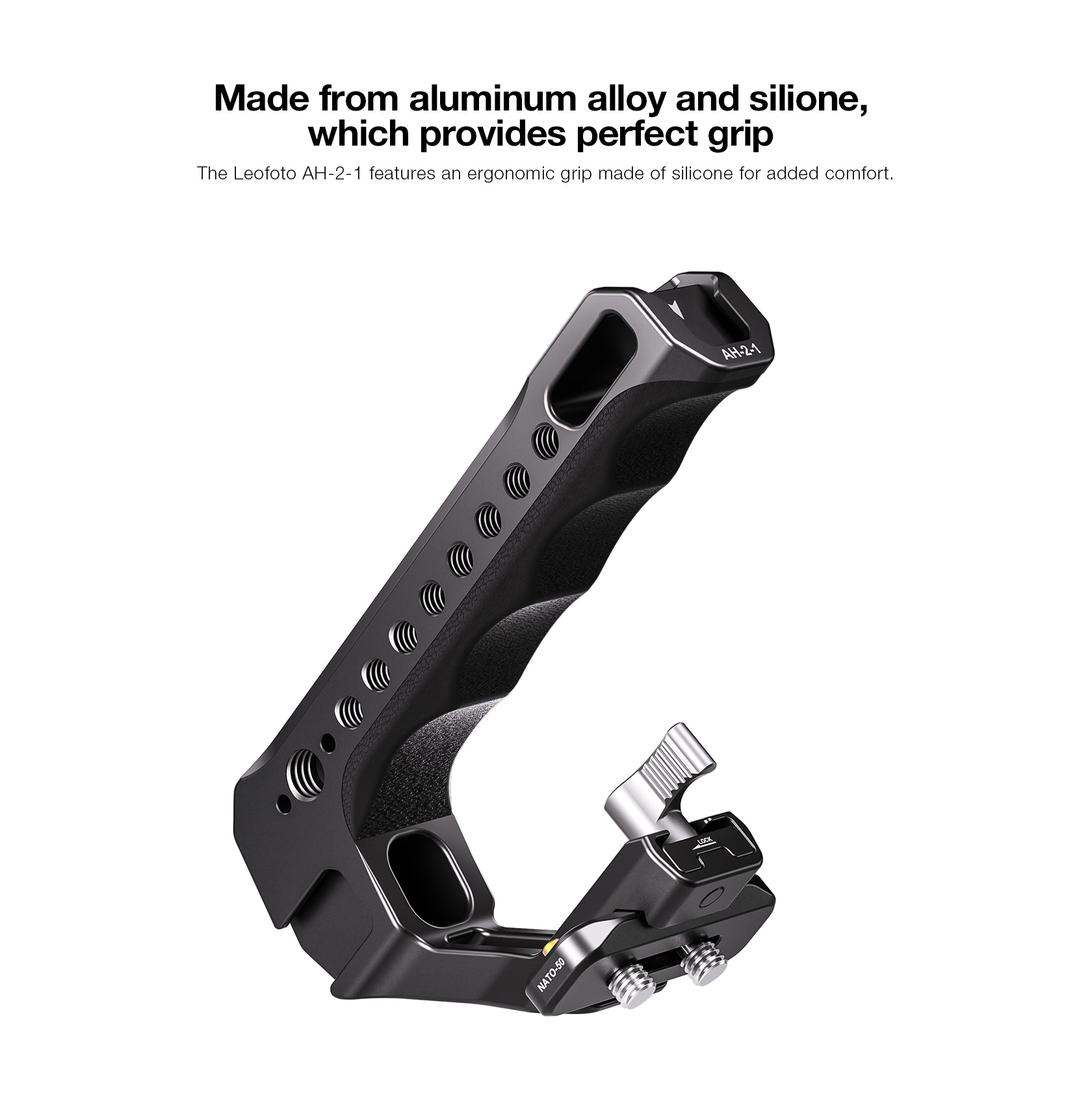 The Leofoto AH-2-1 Top Handle with NATO/Picatinny Rail is designed to facilitate low-angle shot and reduce burdens on arms. The handle is CNC machined from 6061-T6 aluminum and hard anodized making it light weight and durable and has an ergonomic silicone grip for added comfort. It features various mounting sockets along the handle that allow simultaneously mounting microphone, LED light, monitor, and other accessories. Overall, the lightweight and practical handle can provide a wide range of mounting points and an excellent shooting experience.