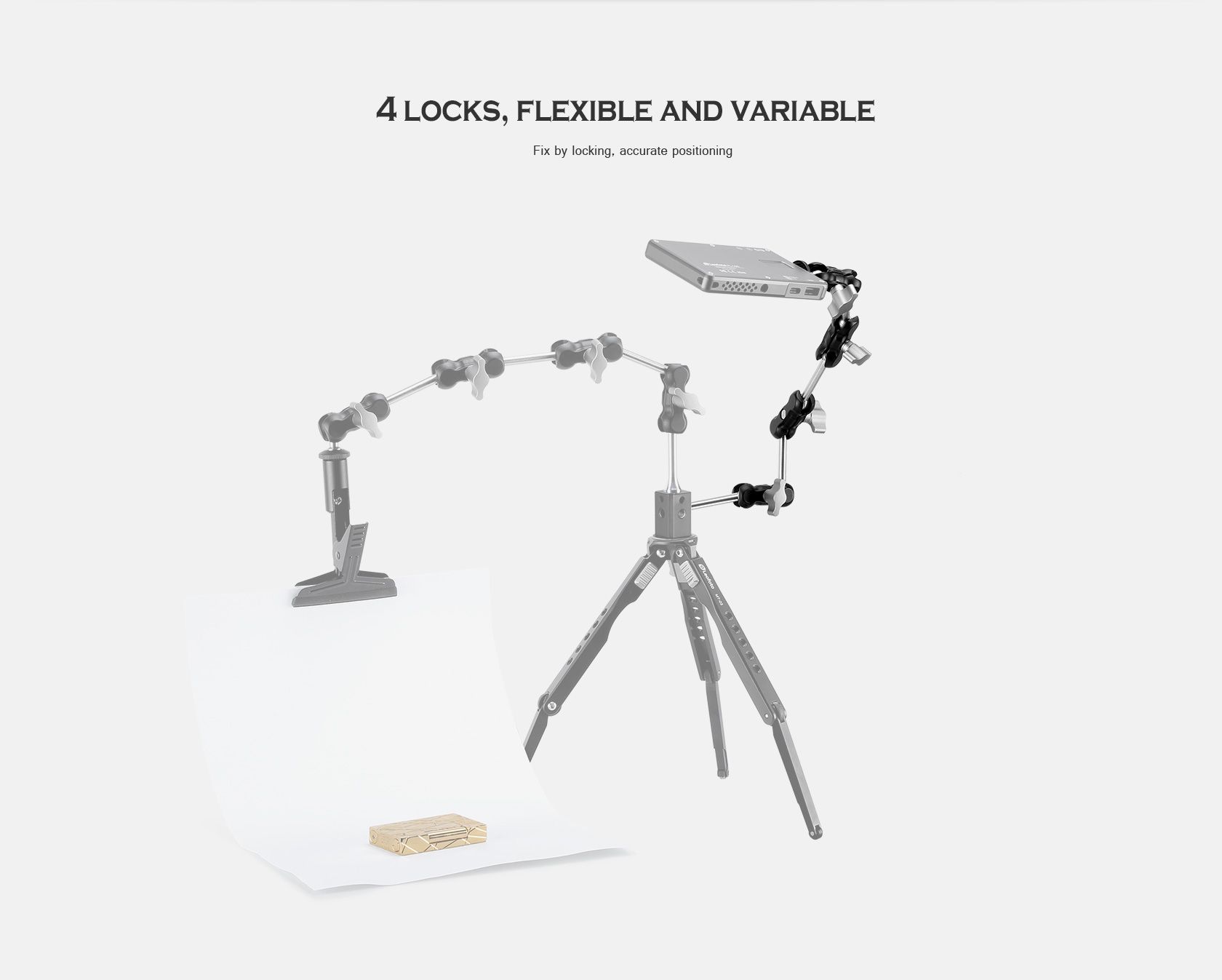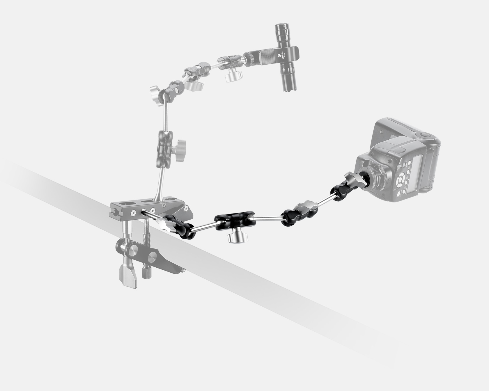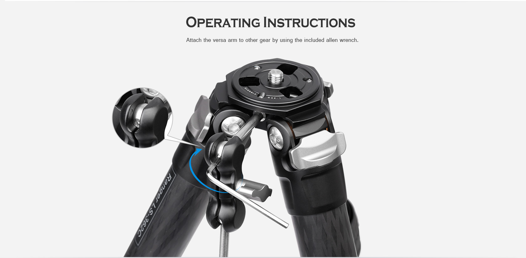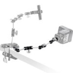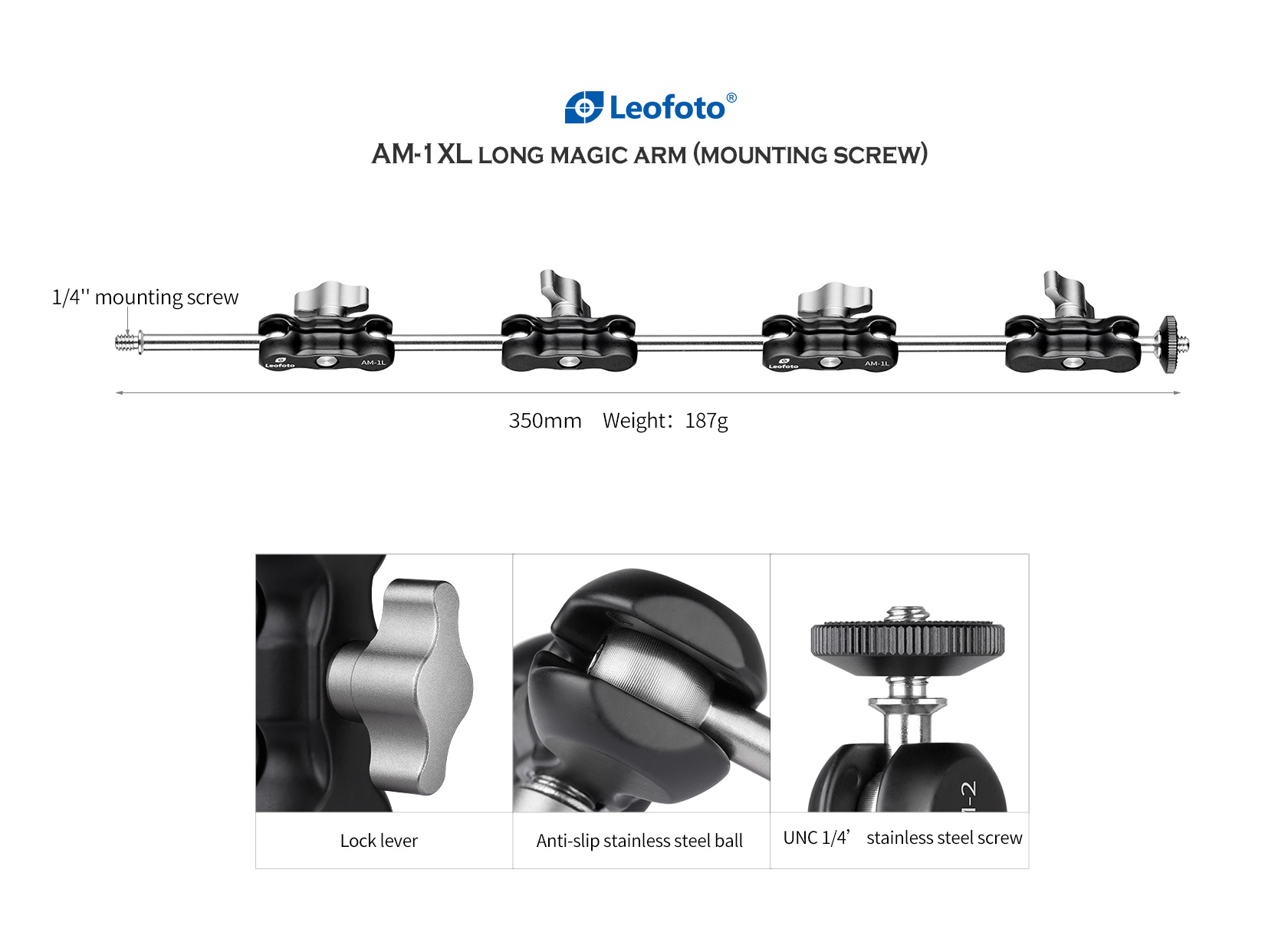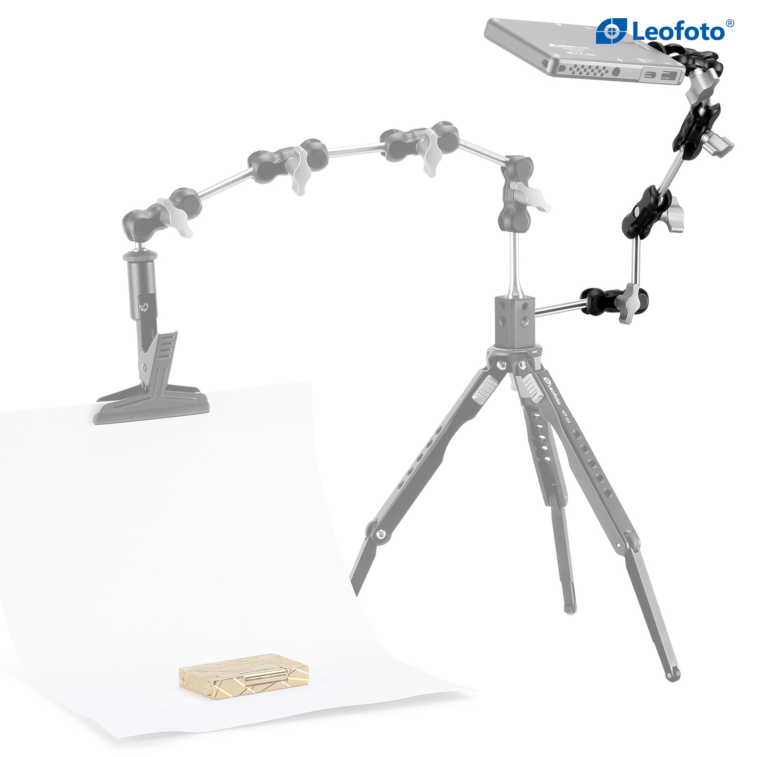 The Leofoto AM Series “Heavy-Duty” Versa Magic Arm is a multi-purpose tripod accessory that attaches to the leg of select Leofoto tripods, or other tripods and camera brackets with a 1/4″-20 accessory slot. Each end of the magic arm features a ball-and-socket joint that rotates 360°, and the center elbow joint locks in any position.