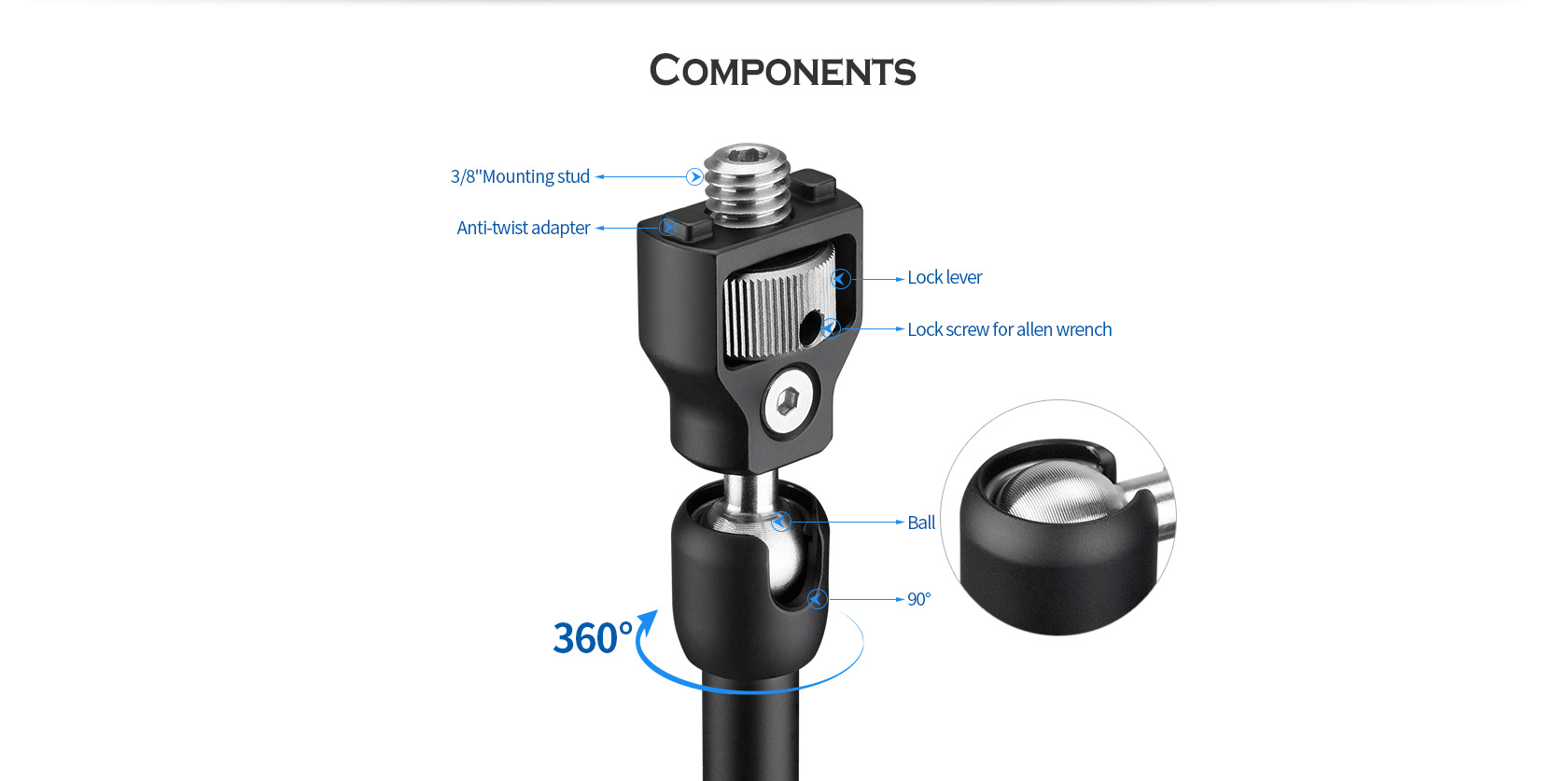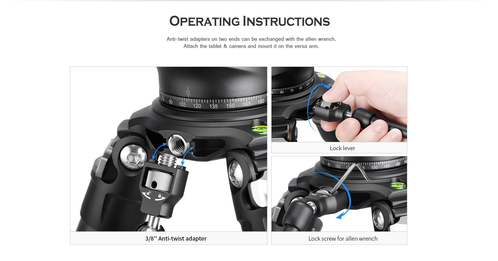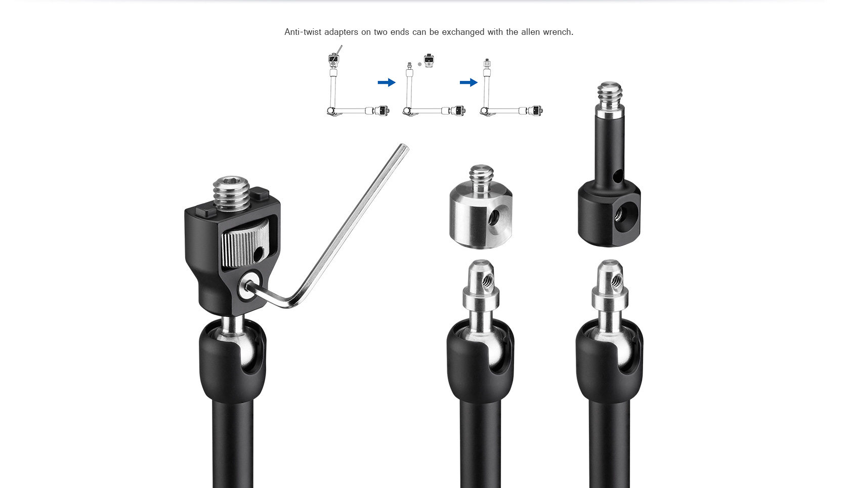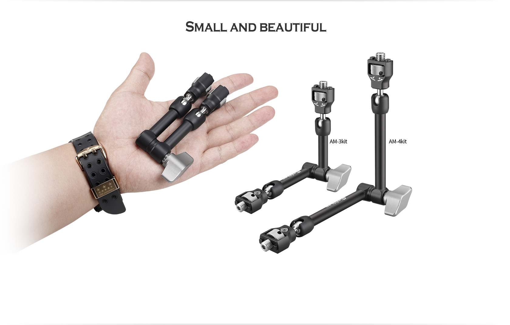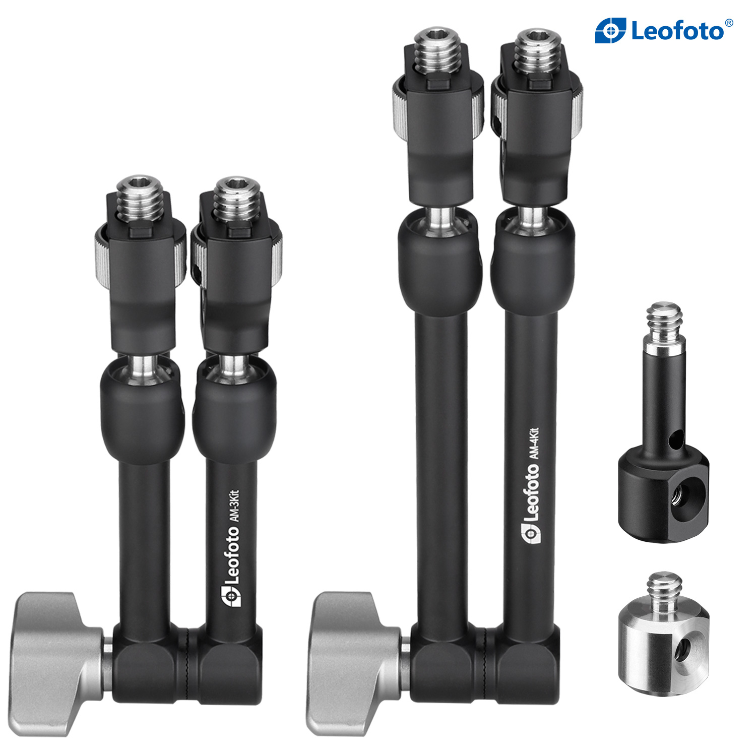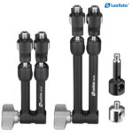 The Leofoto AM Series Versa Magic Arm Kit is a multi-purpose tripod accessory that attaches to the leg of select Leofoto tripods, or other tripods and camera brackets with a 3/8th threaded hole. The magic-arm allows a light, microphone, monitor, smartphone, tablet, or even an additional camera to be affixed to a camera rig without the added bulk of a clamp. Each end of the magic arm features a ball-and-socket joint that rotates 360°, and the center elbow joint locks in any position. The large, easy-to-grip center knob locks all three movements simultaneously for quick and easy setup and repositioning. The “kit” version features anti-twist lock adapters on either end as well as 3/8th mounting studs.