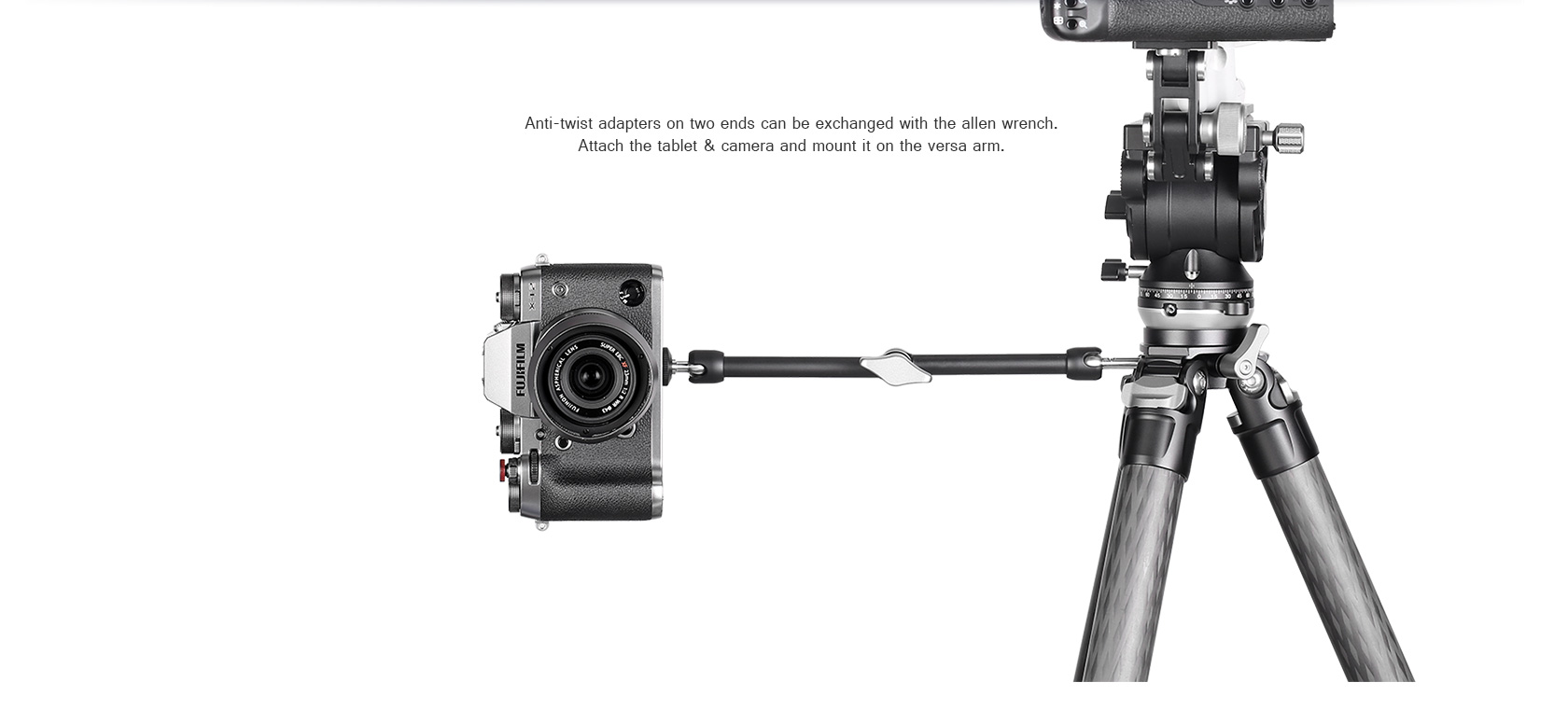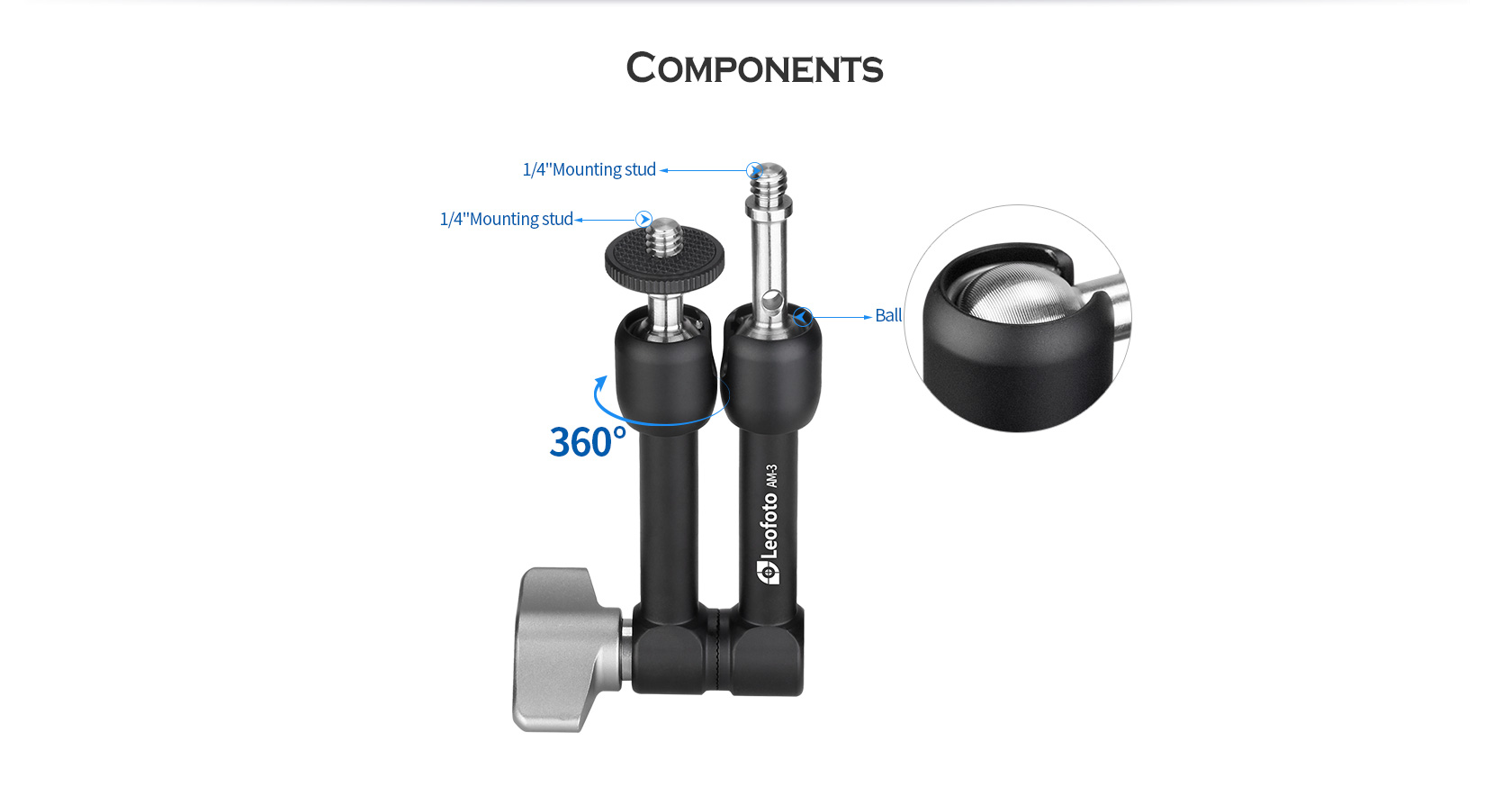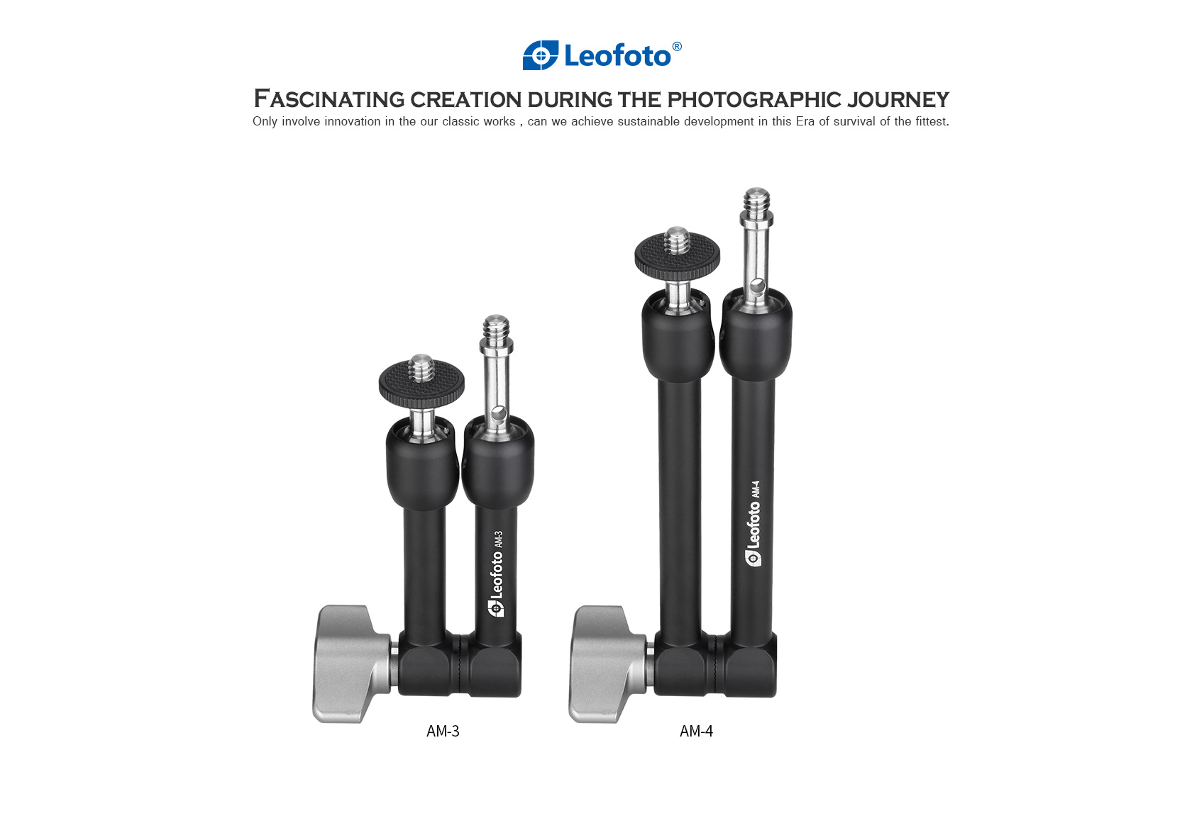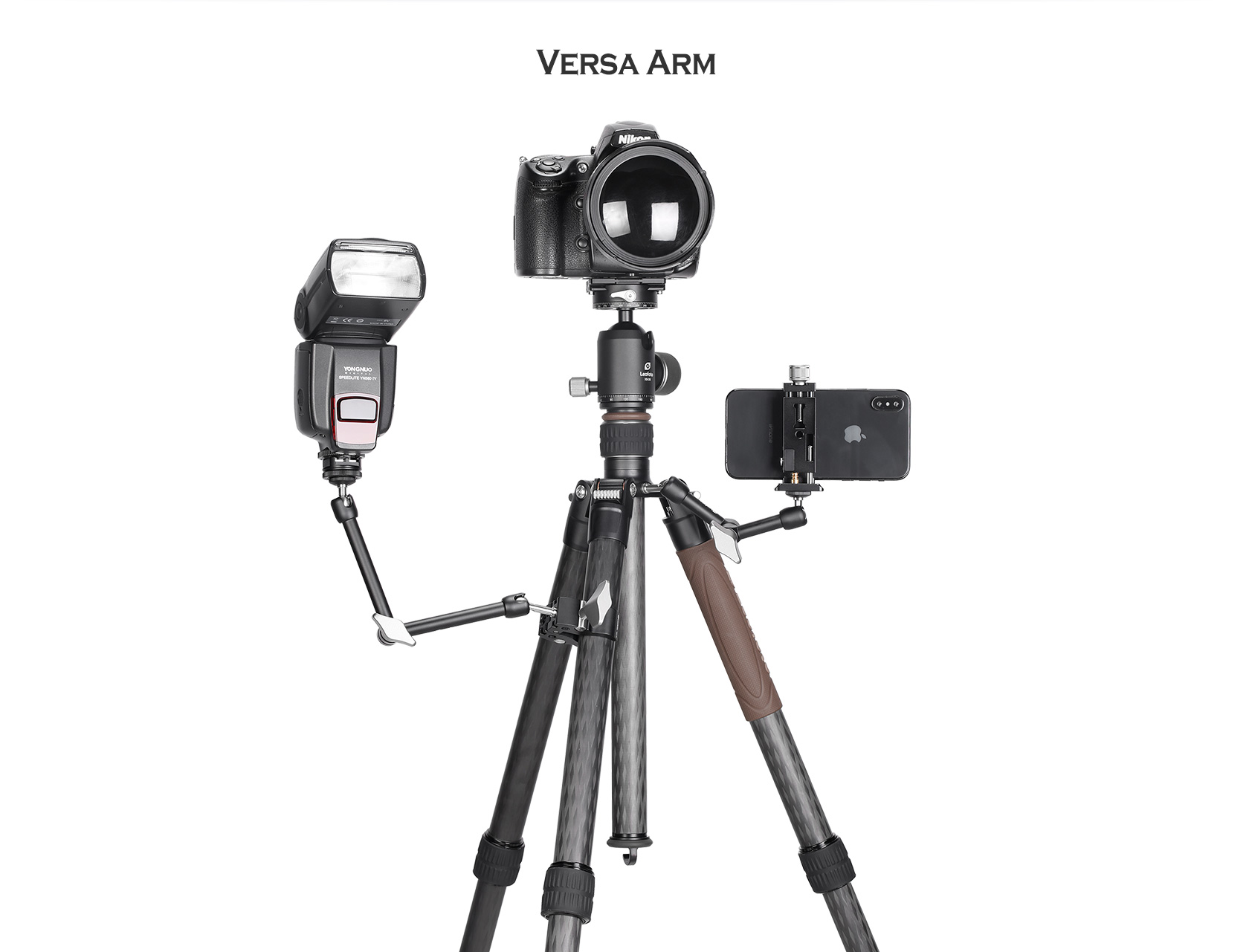 The Leofoto AM Series Versa Magic Arm is a multi-purpose tripod accessory that attaches to the leg of select Leofoto tripods, or other tripods and camera brackets with a 1/4″-20 accessory slot. The magic-arm allows a light, microphone, monitor, smartphone, tablet, or even an additional camera to be affixed to a camera rig without the added bulk of a clamp. Each end of the magic arm features a ball-and-socket joint that rotates 360°, and the center elbow joint locks in any position. The large, easy-to-grip center knob locks all three movements simultaneously for quick and easy setup and repositioning.