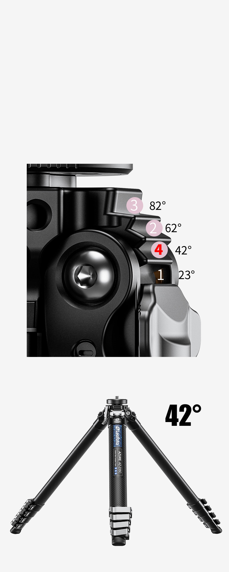 Most of the tripods in the market are with only angles including low, middle and high angles. To help photographers who go windy outdoors for shooting, we add a 42° setting to the tripod to make sure that even in windy outdoors, the shooting can still be stable.