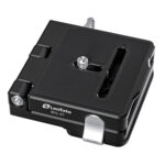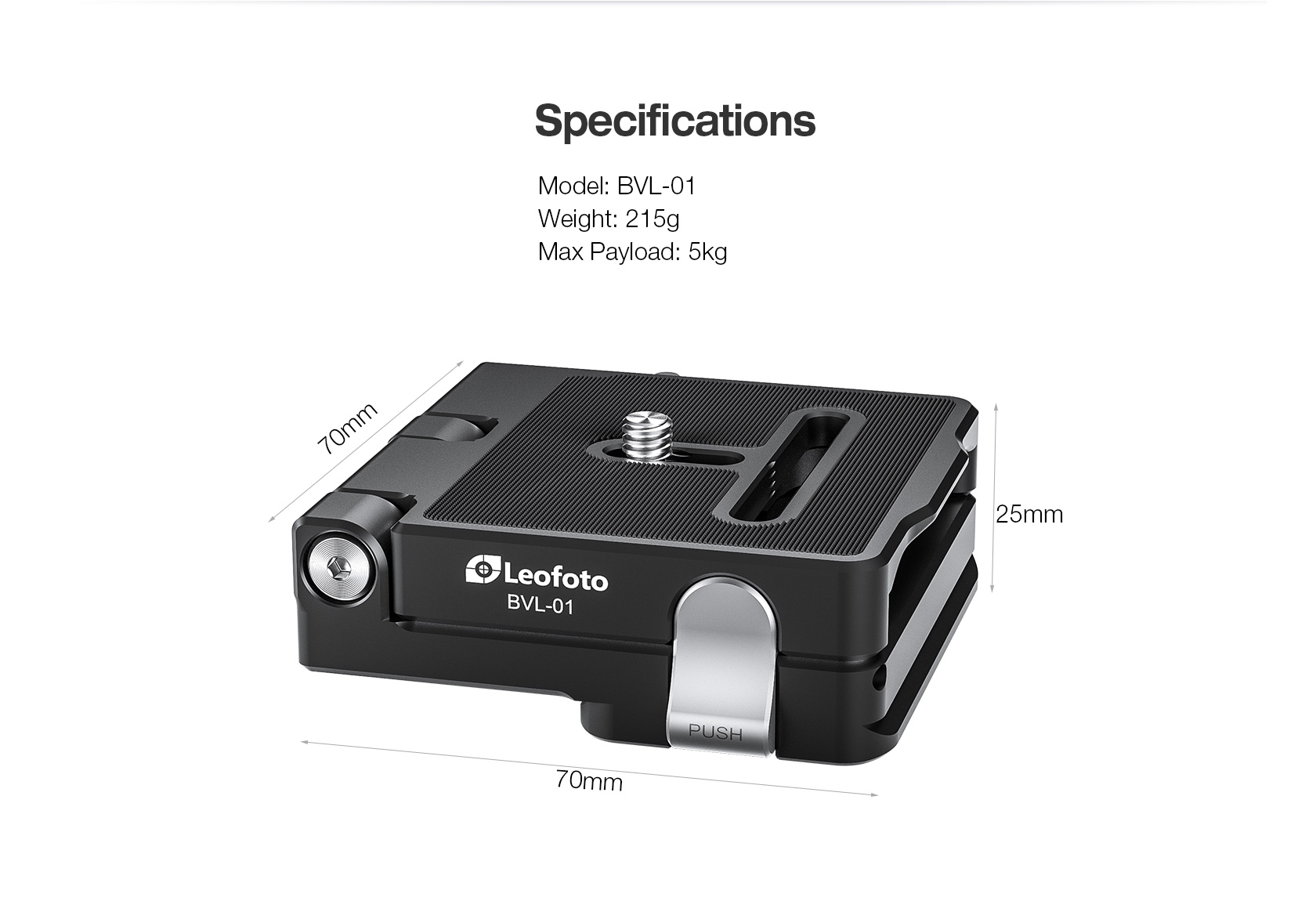 When the plate is tilted 90 degrees, a spring-loaded locking mechanism will lock the plate automatically and securely. An additional safety mechanism is used to prevent heavier equipment from causing the plate to fold up unintentionally. The bottom of the BVL-01 is equipped with threaded holes in 3/8 and 1/4″. The fixing screw on the top is 1/4″ thread.