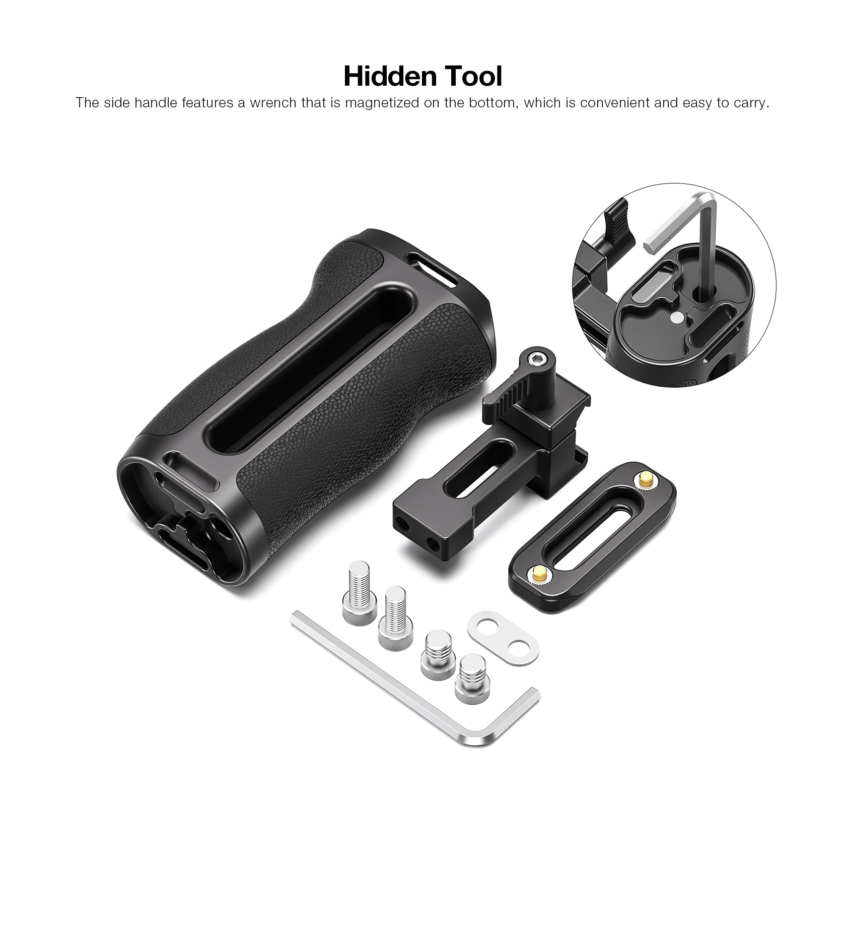 The Leofoto CH-7-1 Side Handle with NATO/Picatinny Rail is designed for mirrorless, digital, and other small cameras to provide a comfortable grip for increased stability with access to accessory mounts for cameramen. It is attached via a NATO/Picatinny clamp to the side of the camera cage. The CH-7-1 features 3/8”-16, 1/4“-20 and cold shoe accessory mounts on top to add a mounting arm, light, mic, strap or other accessories. This side handle is adjustable to fit different cage heights and can quickly switch between left-handed or right-handed orientation with the built-in allen wrench. Made of hard anodized aluminum, this handle features an ergonomic silicone grip to provide filmmakers with a smooth and comfortable shooting experience.