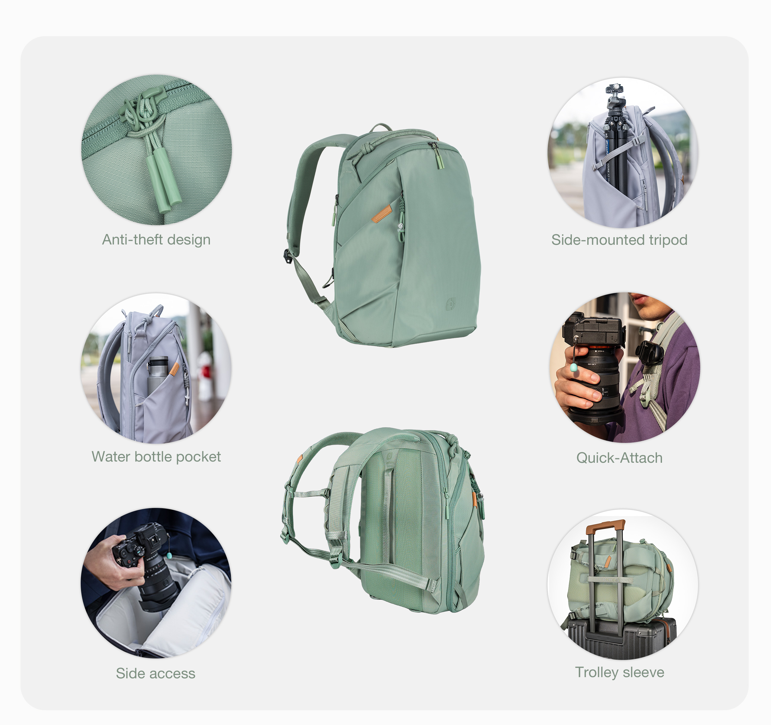 An anti-theft zipper on the main compartment helps protect equipment during travel. A theft-resistant quick-access pocket and a dedicated AirTag pocket provide additional security and tracking support.