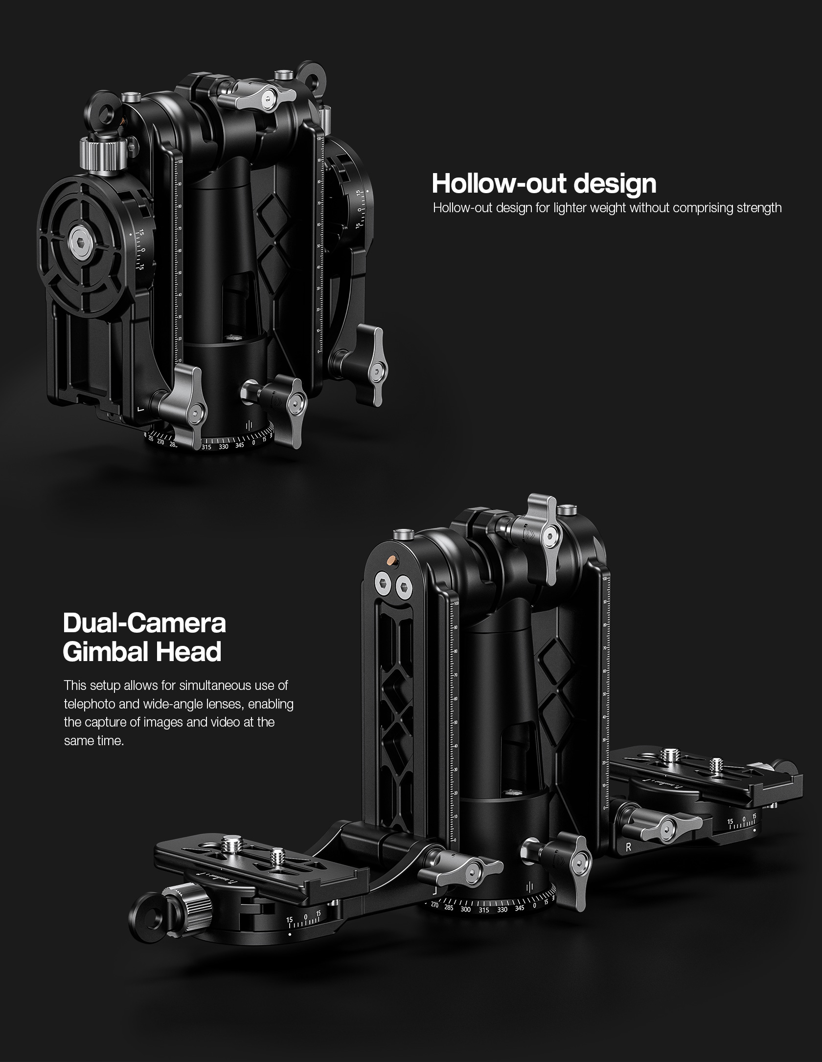 • Dual-Camera Setup: Supports the use of telephoto and wide-angle lenses at the same time or capturing both photos and videos with the same focus point.