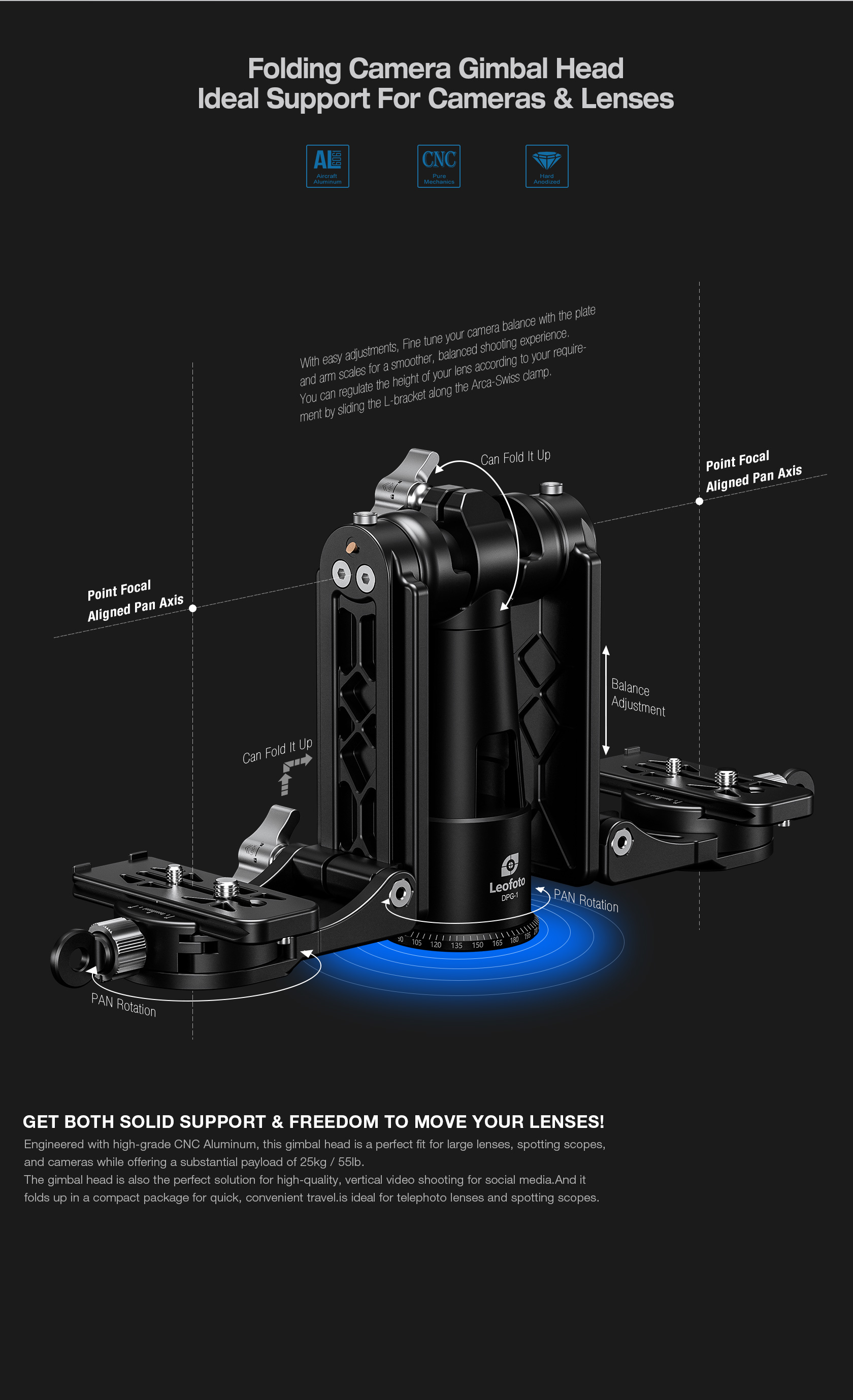 • 15° Adjustable Clamp: The clamp holding the lens can rotate 15° for fine-tuned adjustments. This flexibility allows for precise camera positioning without affecting the focus or balance.