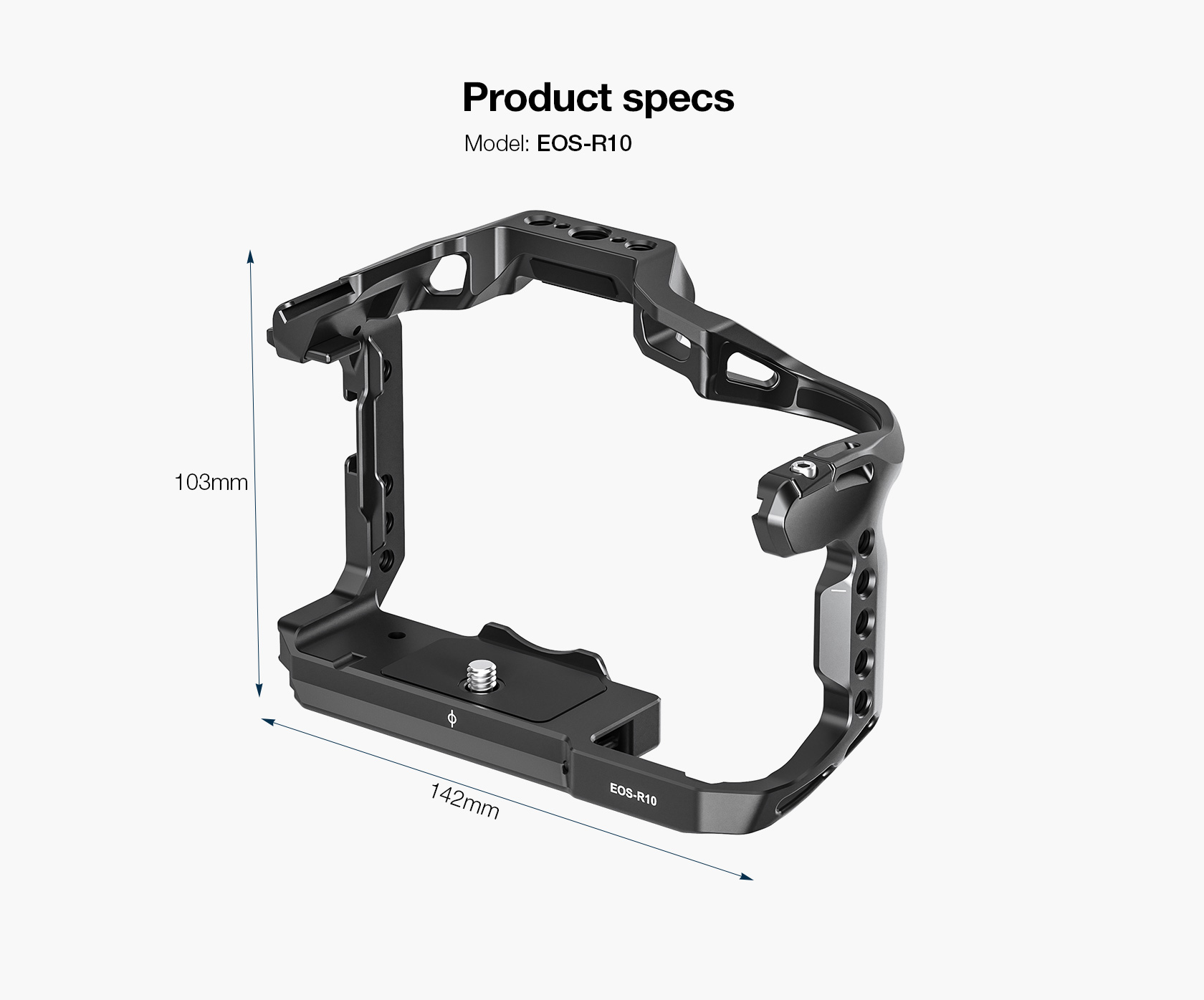 Protect your Canon EOS-R10 from the rigors of the production day while also providing multiple accessory mounting points that won’t stress your camera’s body with this form-fitting  Leofoto EOS-R10 Custom Cage for Canon EOS-R10 Camera. The cage features one cold shoe mount on top of the cage and one on the side, as well as multiple 1/4″-20 and 3/8″-16 threaded accessory-mounting holes. The 3/8″-16 threaded holes feature anti-twist divots.