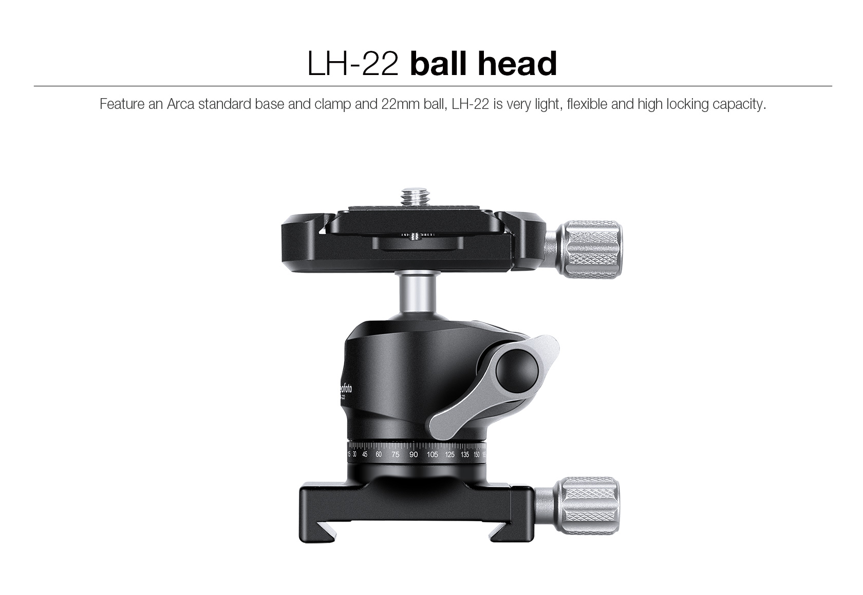The LH-22 Ball Head with Arca Clamp is a versatile and adjustable accessory that is designed to securely hold your spotting scope or camera. With its ability to independently maneuver one of the installed items, it is perfect for tracking moving targets. Please note that this is not a standard LH-22, as it is permanently attached to an Arca clamp, which allows for easy attachment to the rail.