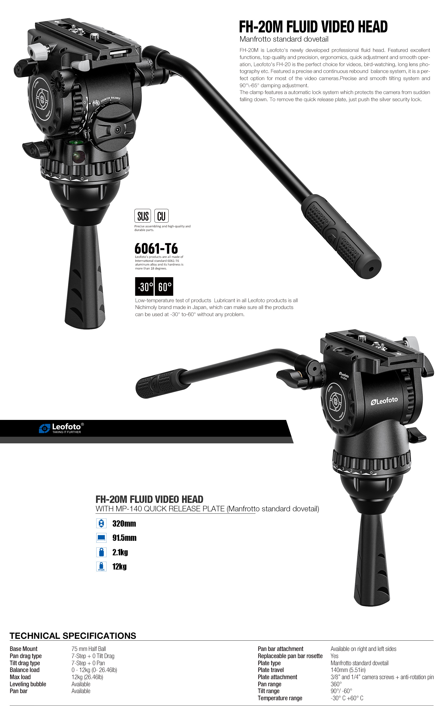 The Leofoto FH-20M(Manfrotto Standard) Fluid Video Head is Leofoto’s most high-end professional offering, engineered for exceptional functionality, precision, and ultra-smooth operation—ideal for professional video production. Designed with ergonomic efficiency in mind, this fluid head excels in a wide range of applications. Its illuminated bubble level ensures accurate leveling in any lighting condition.