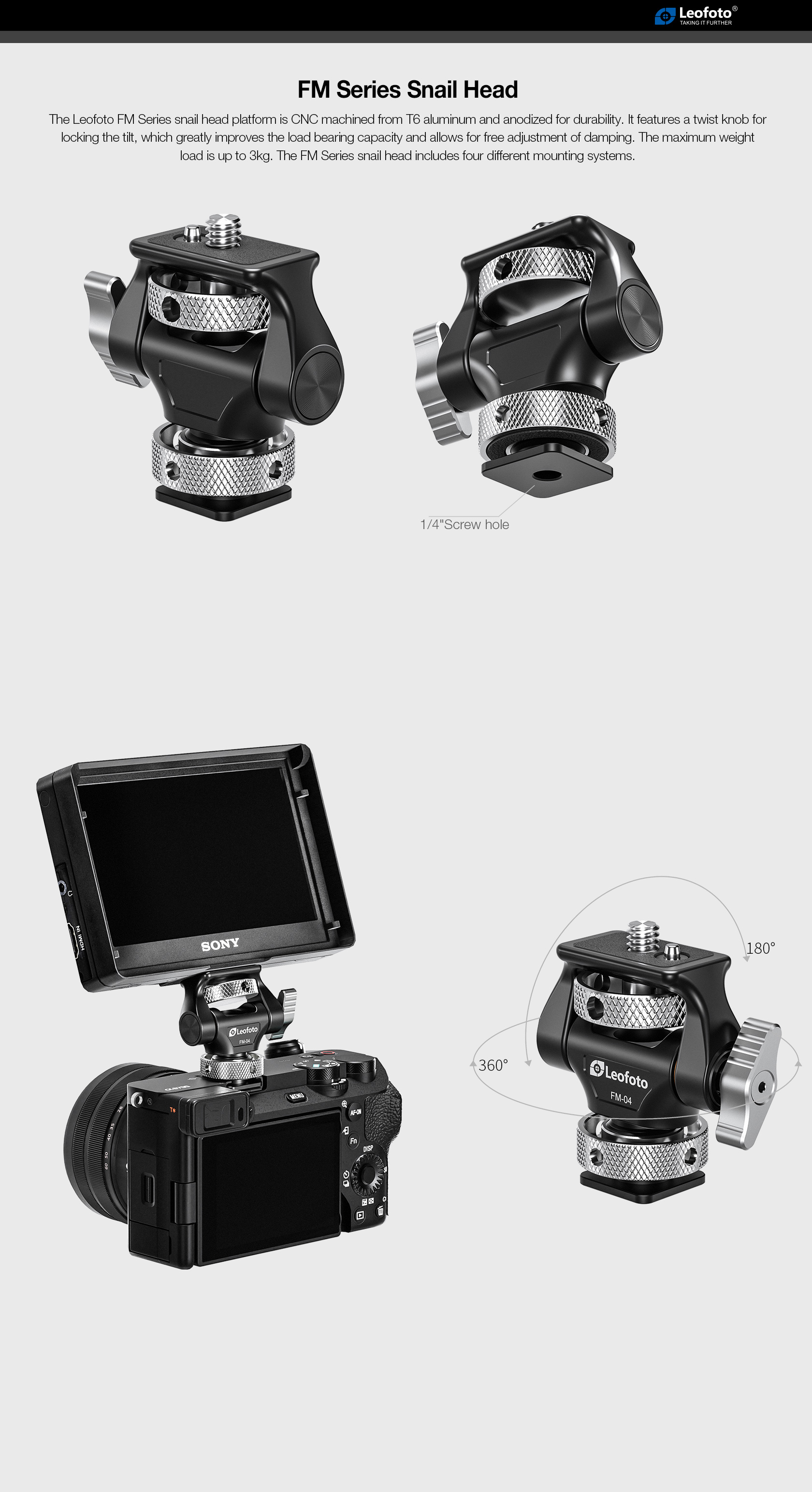 Mount any 5 or 7″ monitor with a 1/4″-20 mounting thread on your camera with the Leofoto FM-04 Swivel and Tilt Adjustable Monitor Mount | Coldshoe. This adjustable mount easily attaches to your camera rig using a cold shoe. It swivels 360°, tilts 180°, and is lockable in any position to establish the best possible viewing angle.