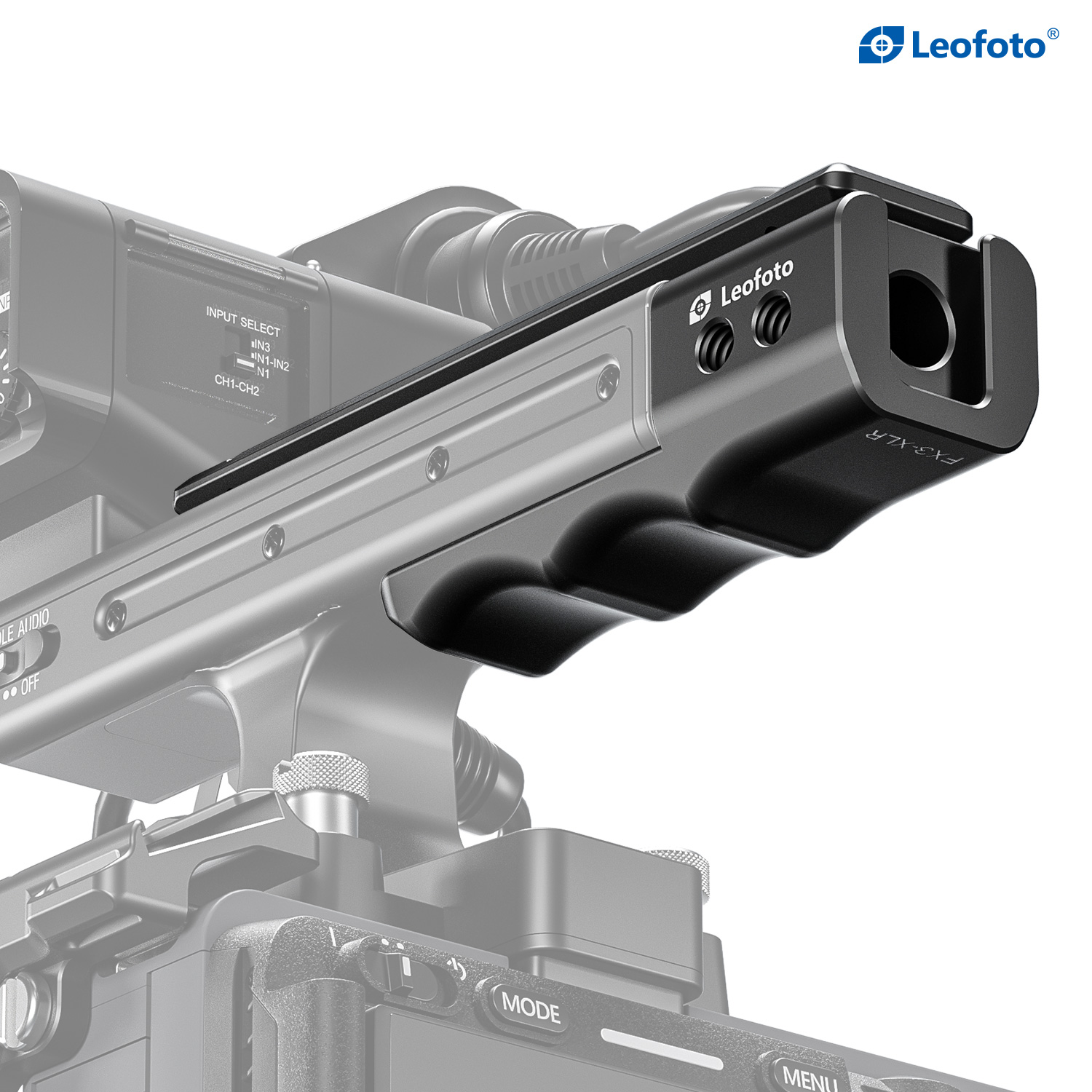 The Leofoto FX3-XLR is an extension for the SONY FX3 XLR handle. There is a top rail to secure the extension in place with various accessory mounting holes. The rail uses two 3/8″ mounting screws to mount directly to the original top handle, while the extension uses one 3/8″ mounting screw to mount to the back of the top handle. This extension allows for a longer grip length as well as ergonomic finger shaped grooves for added comfort while handling the camera.