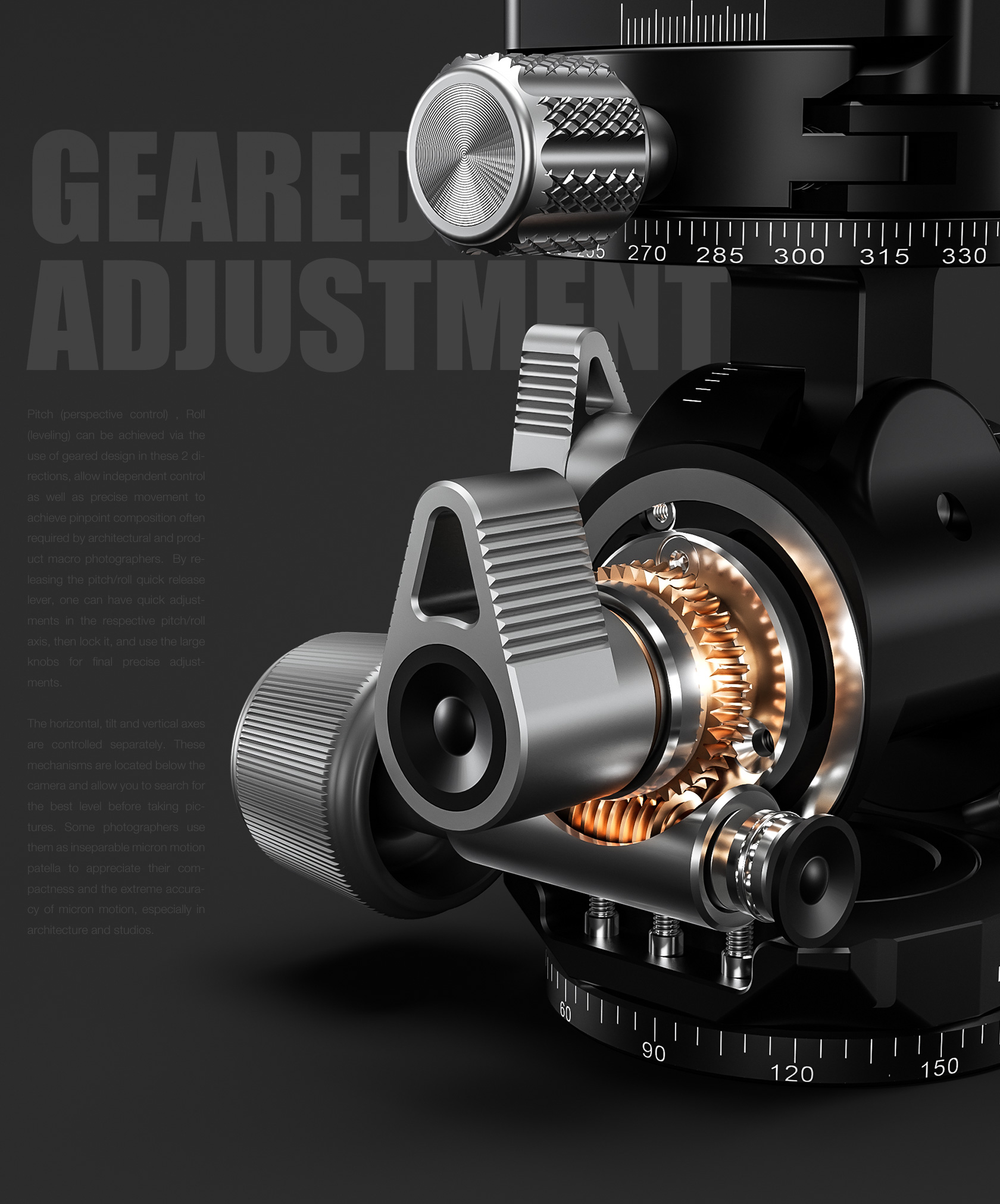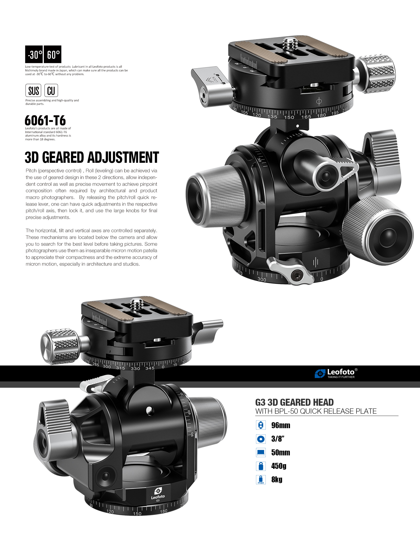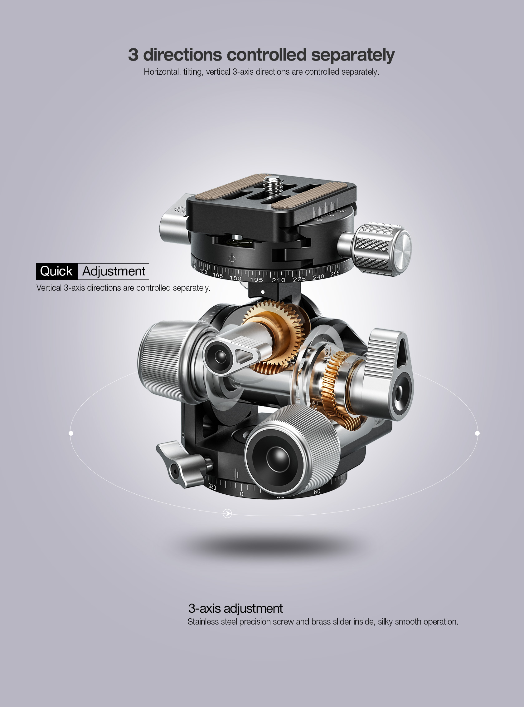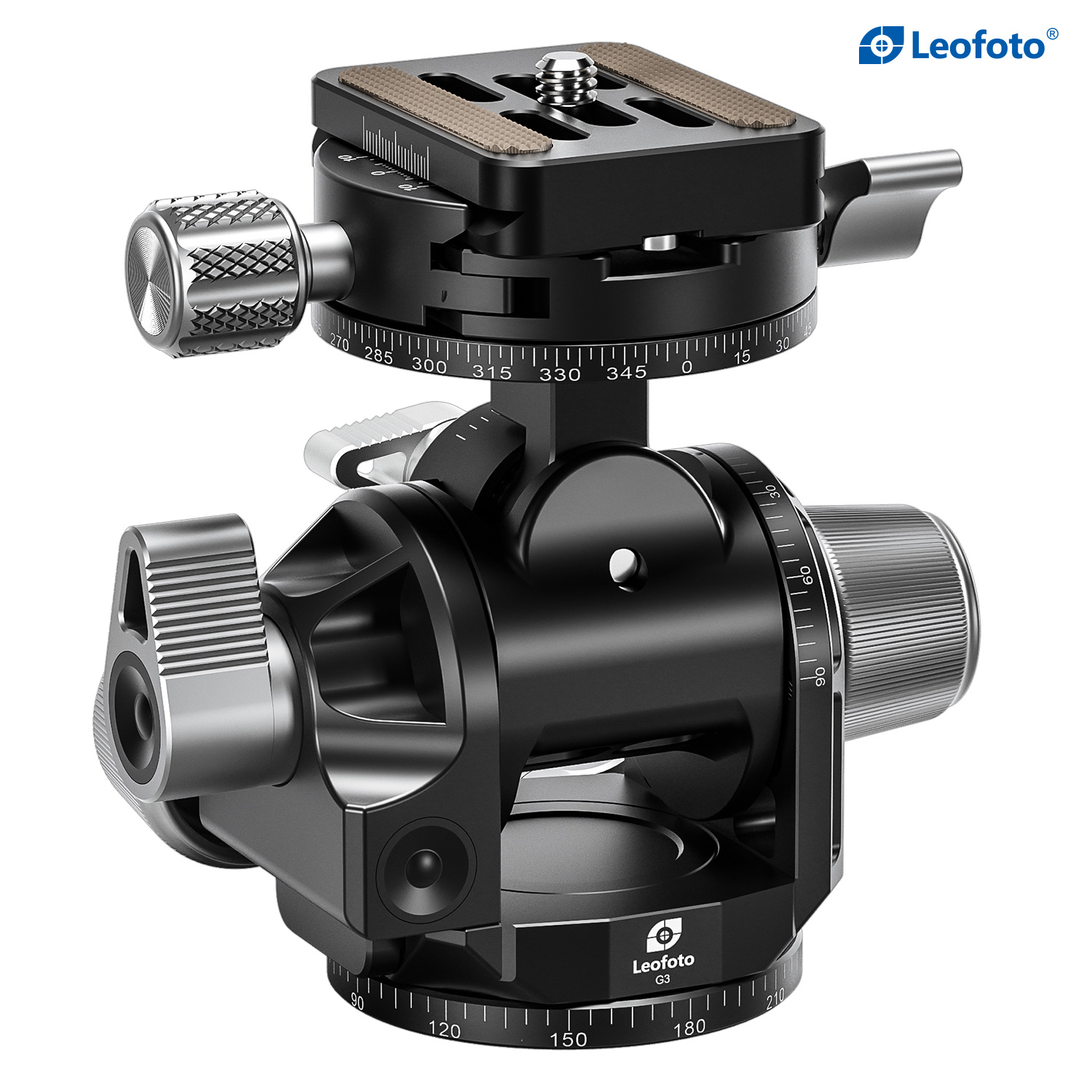 Tilt and pivot your camera in three-dimensional space with the Leofoto G3 Professional Geared Head, which combines the advantages of a ball head and a 3D tilt head in one compact system. When both X- and Y-axes are open, one can move the camera freely but, as opposed to a ball head, the X- and Y-axis movements can also be made individually. If one of these axes is fixed, movements can be performed with even more precision.
