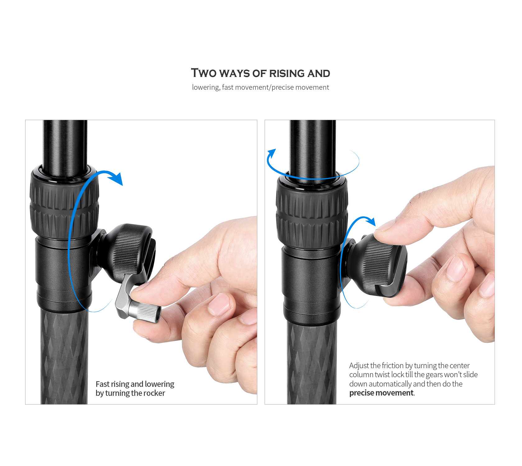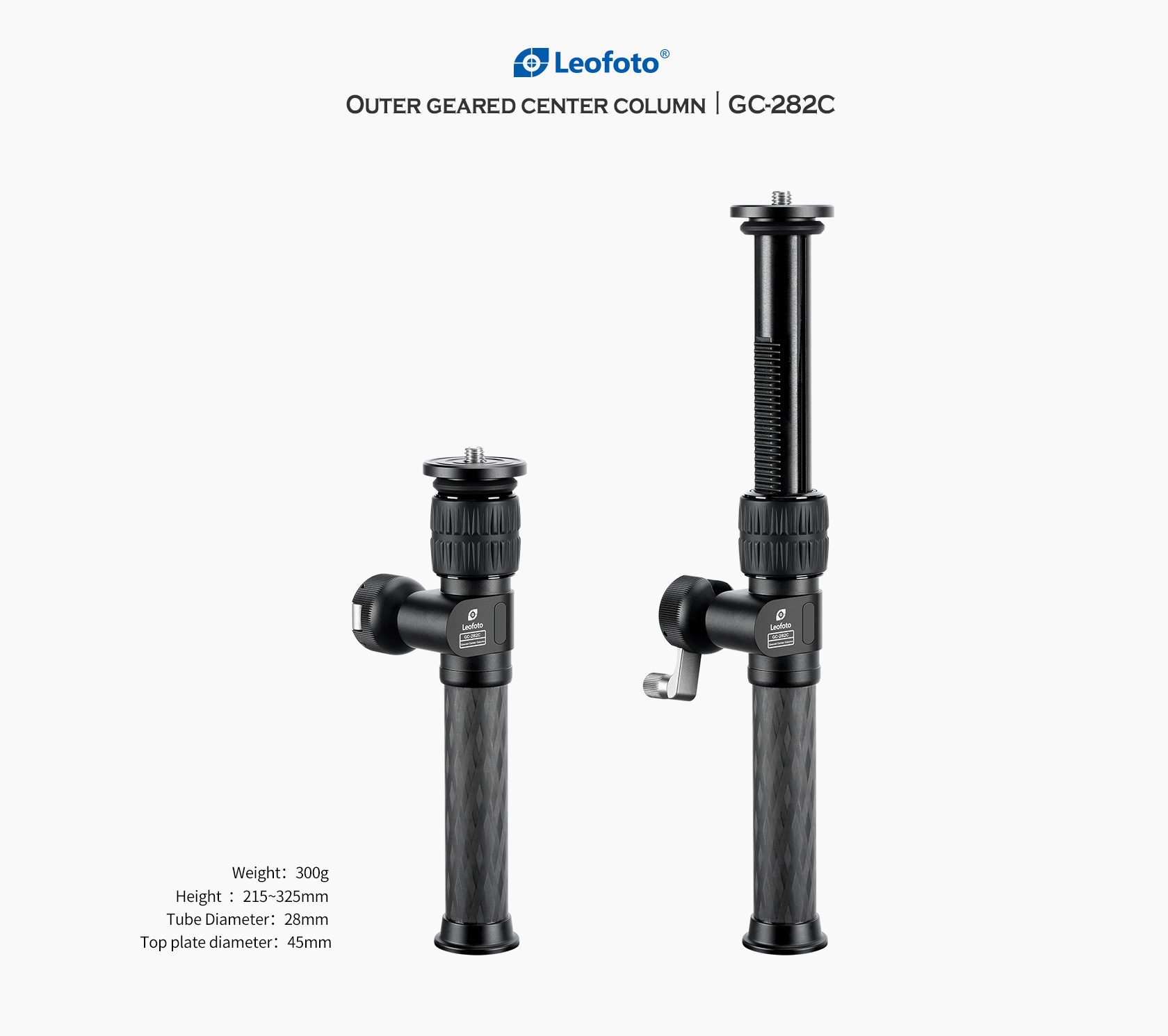 The Leofoto GC-282C Geared Add-On Center Column is an adjustable, two-section center column extension for tripods and monopods. Made up of two lightweight yet durable 10-layer carbon fiber tubes, the GC Center Column adds height to the setup featuring the same high quality rubber grip twist leg lock and anodized aluminum hardware that come standard on Leofoto tripods. This center column add-on features a geared extension crank handle for precise vertical movement. The column base has a 3/8″-16 threaded mounting socket while the top features a spring-loaded, convertible 3/8″-16 threaded mounting stud that can be slid down to reveal a 1/4″-20 threaded mounting stud, making it compatible with virtually any head.