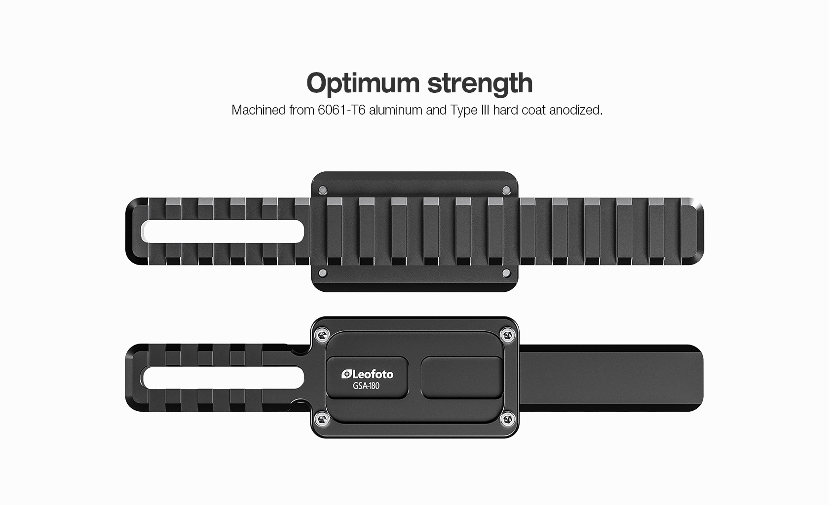 The Leofoto GSA Series Arca-Picatinny Rail is an Arca-type to Picatinny compatible plate and allows for the attachment of various picatinny rail-mounted accessories such as flashlights, bipods, vertical grips, etc. The rail is CNC machined from aircraft-grade 6061-T6 aluminum and hard anodized for optimal strength and durability.