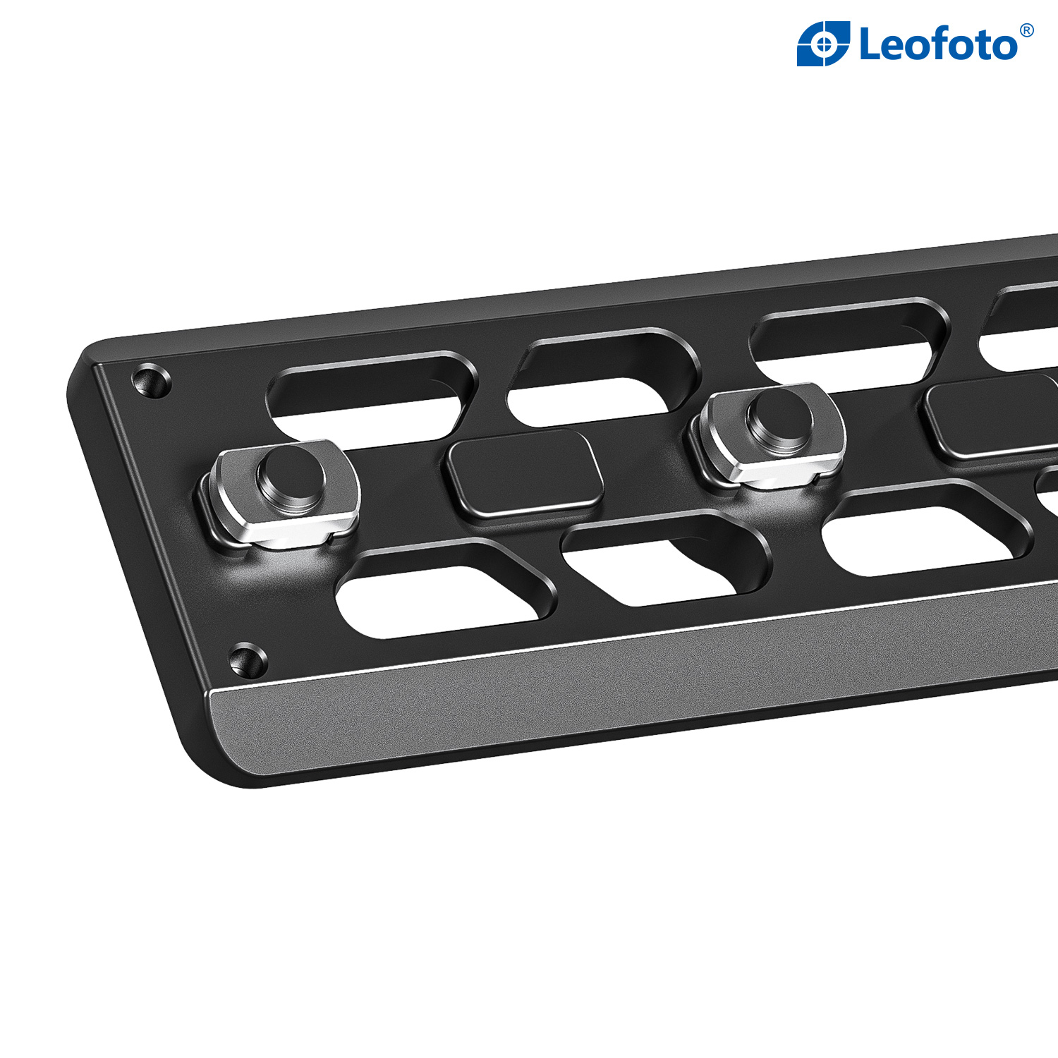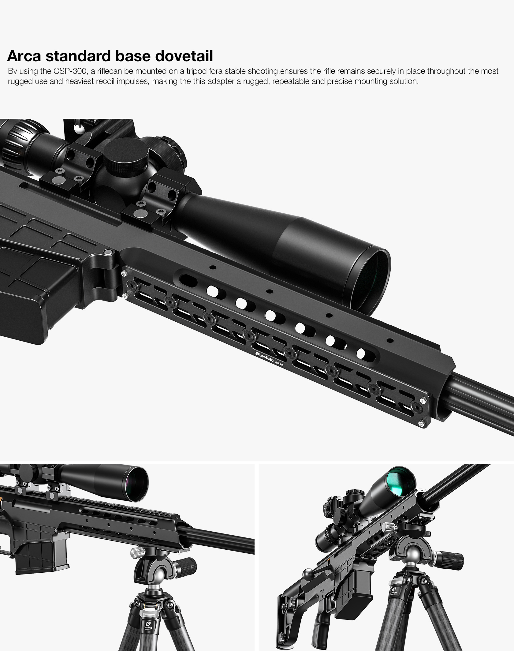 The Leofoto GSP Series M-LOK Quick Release Plate is Arca-type compatible and features several removable safety-stops to assure the rifle stays stable when shooting. The safety-stops and screws are all stainless steel and the plate is CNC machined from T6061 and hard anodized for durability. A hollowed out design makes the plate relatively lightweight and via the threads and included screws, the plate can be secured to the M-LOK handguard of compatible rifles. You can then mount the rifle on Arca-type ball heads and other supports.