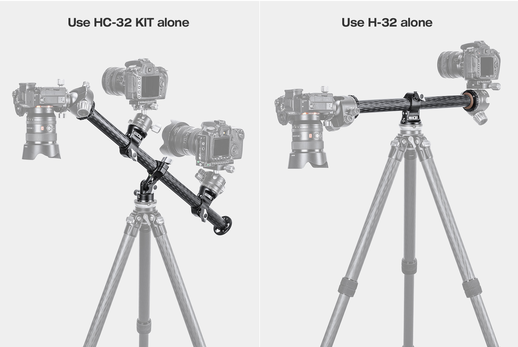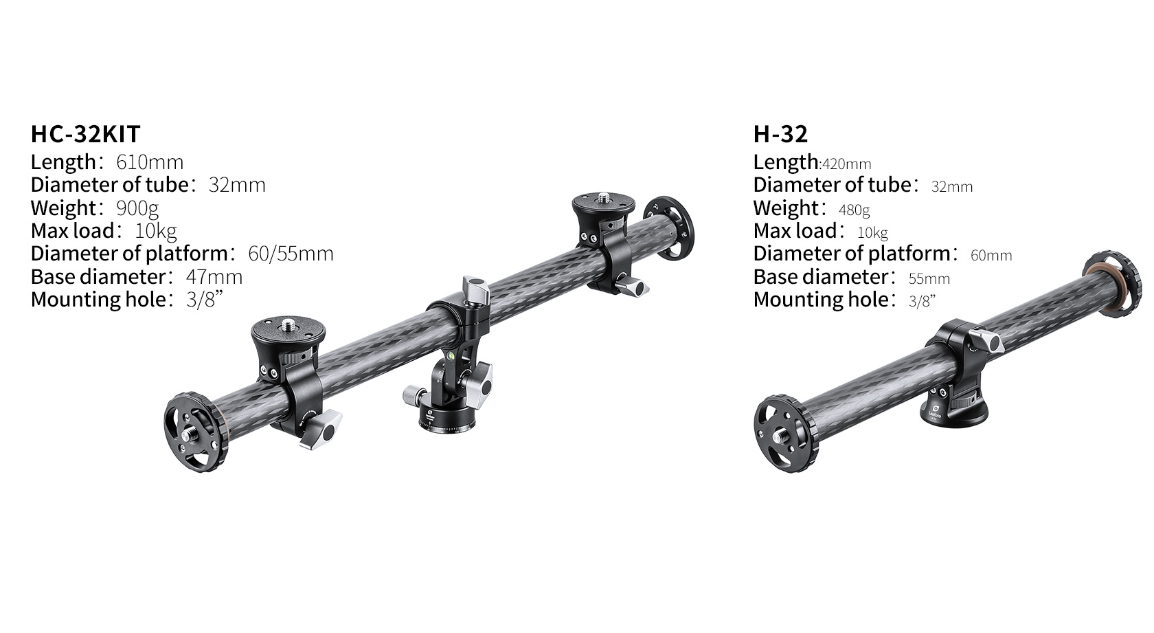 The Leofoto HC-32 Kit is a carbon fiber extension set that allows an adjustable center column to be added to a tripod without a center column. The rugged but lightweight carbon-fiber column can be rotated a full 360° and tilted 180° from horizontal to fully vertical in either a standard or inverted orientation. The HC-32 kit also comes with two Leofoto C-32 camera tube mount attachments with 3/8″-16 mounting studs to allow for more devices to be attached.