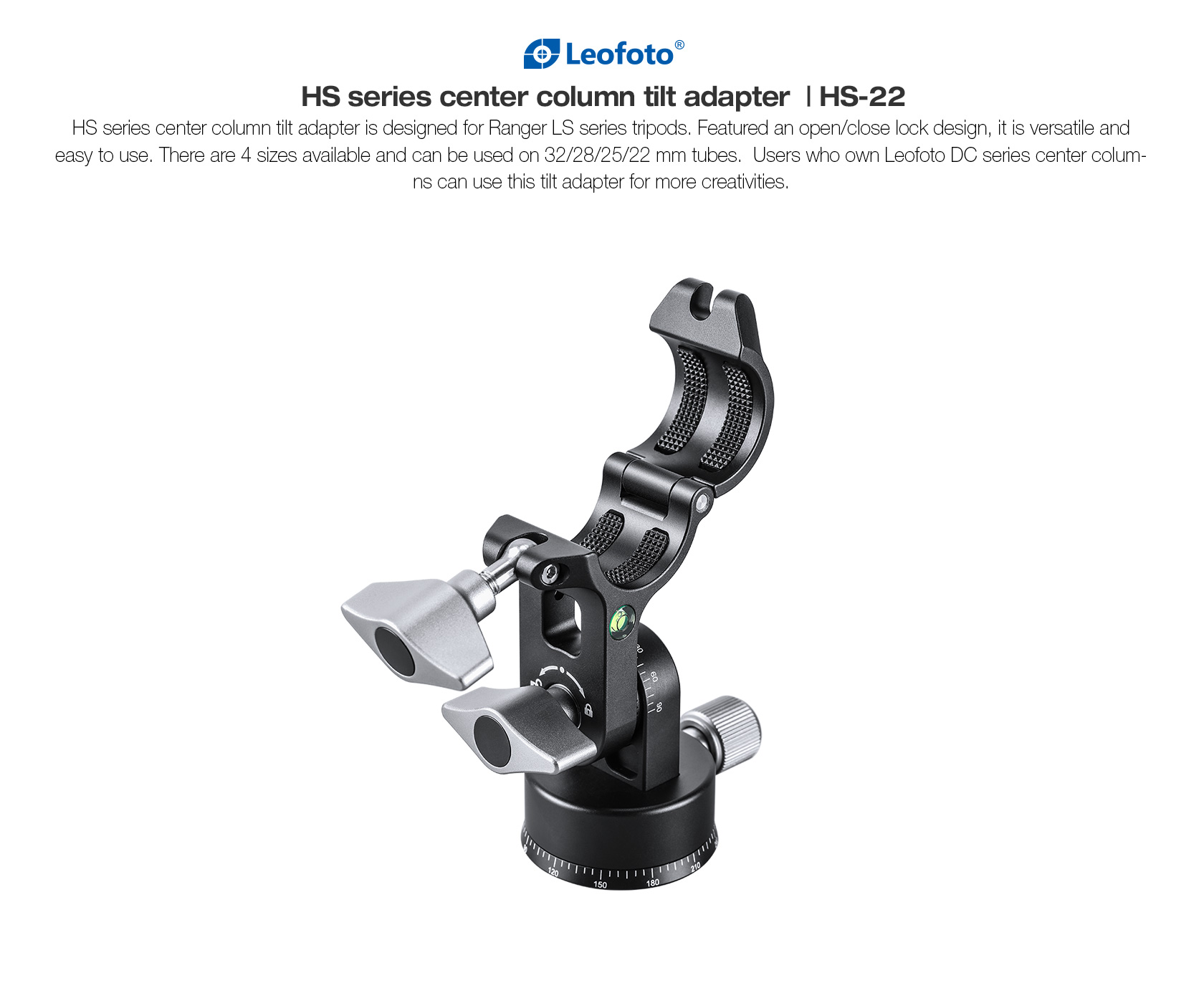 The Leofoto HS Series Center Column Tilt Adapter is designed for Leofoto Ranger LS Series tripods. It is CNC machined from aluminum alloy and hard anodized for durability. This tilt adapter features ±90° tilting, a 360° panning base and a toothed lock system and has a 3/8″ mounting socket on the base.