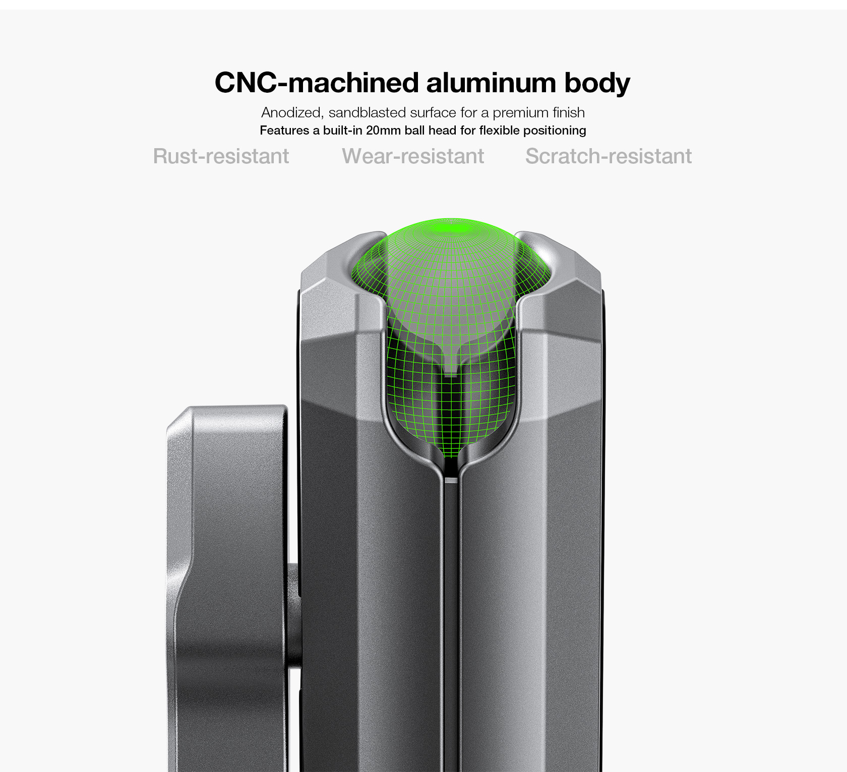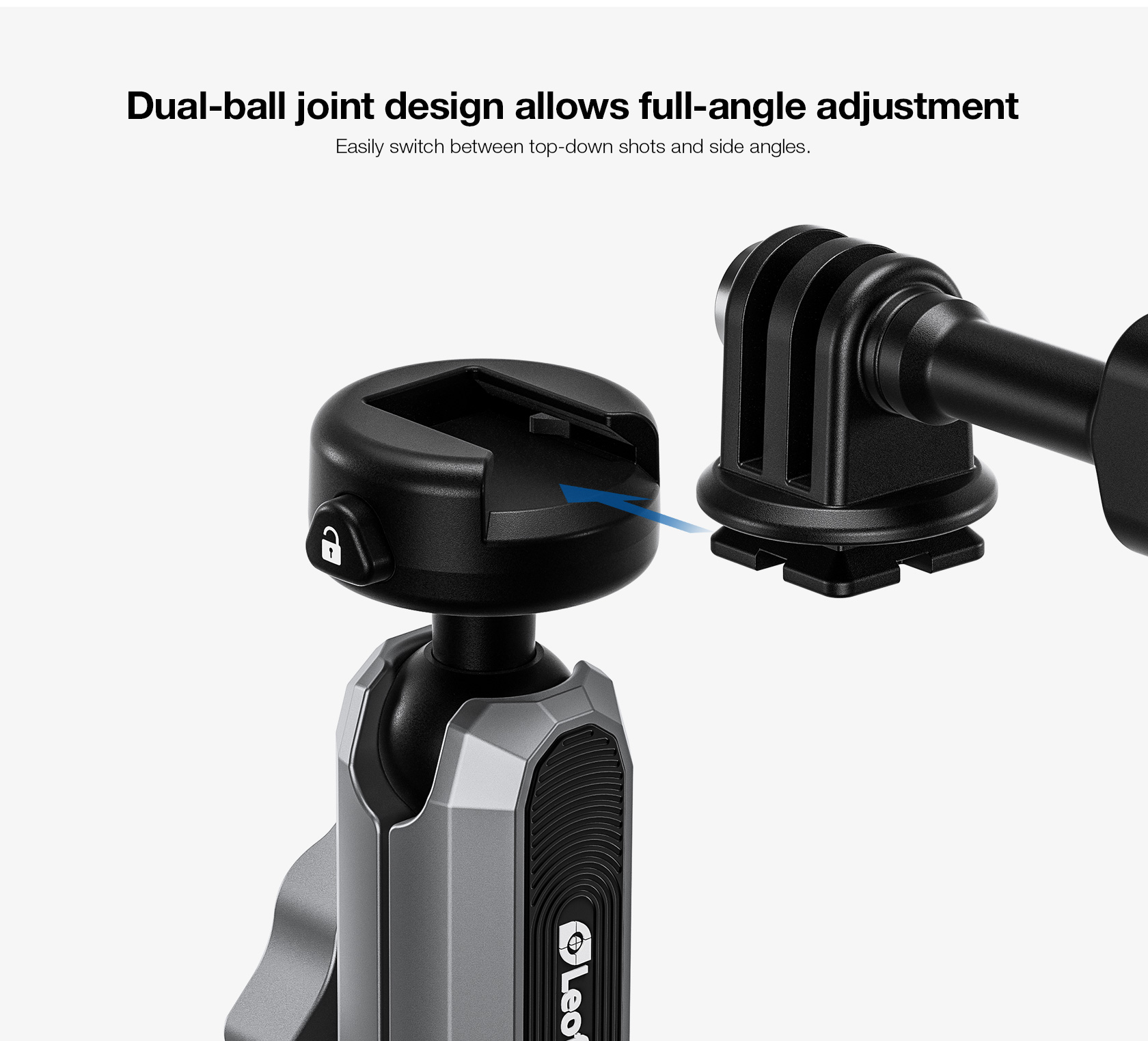 The mount includes a built-in 20mm (0.79 in) ball head for flexible camera positioning, allowing easy adjustment to capture top-down, side, or angled shots. It can securely hold cameras weighing up to 2 kg (4.4 lbs), with a recommended load under 400 g (0.88 lbs) for bumpy conditions.