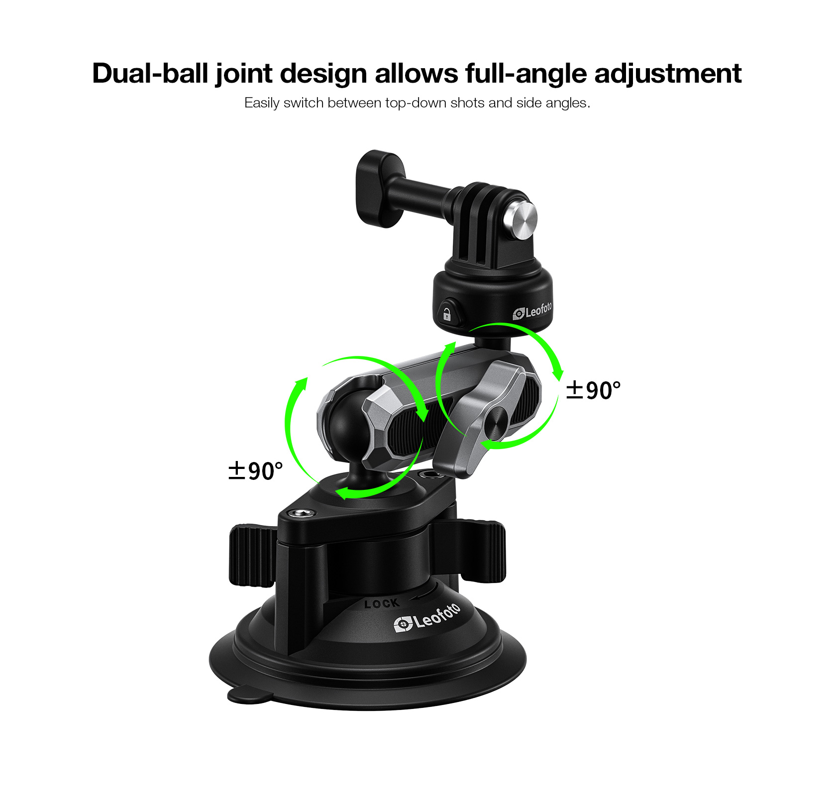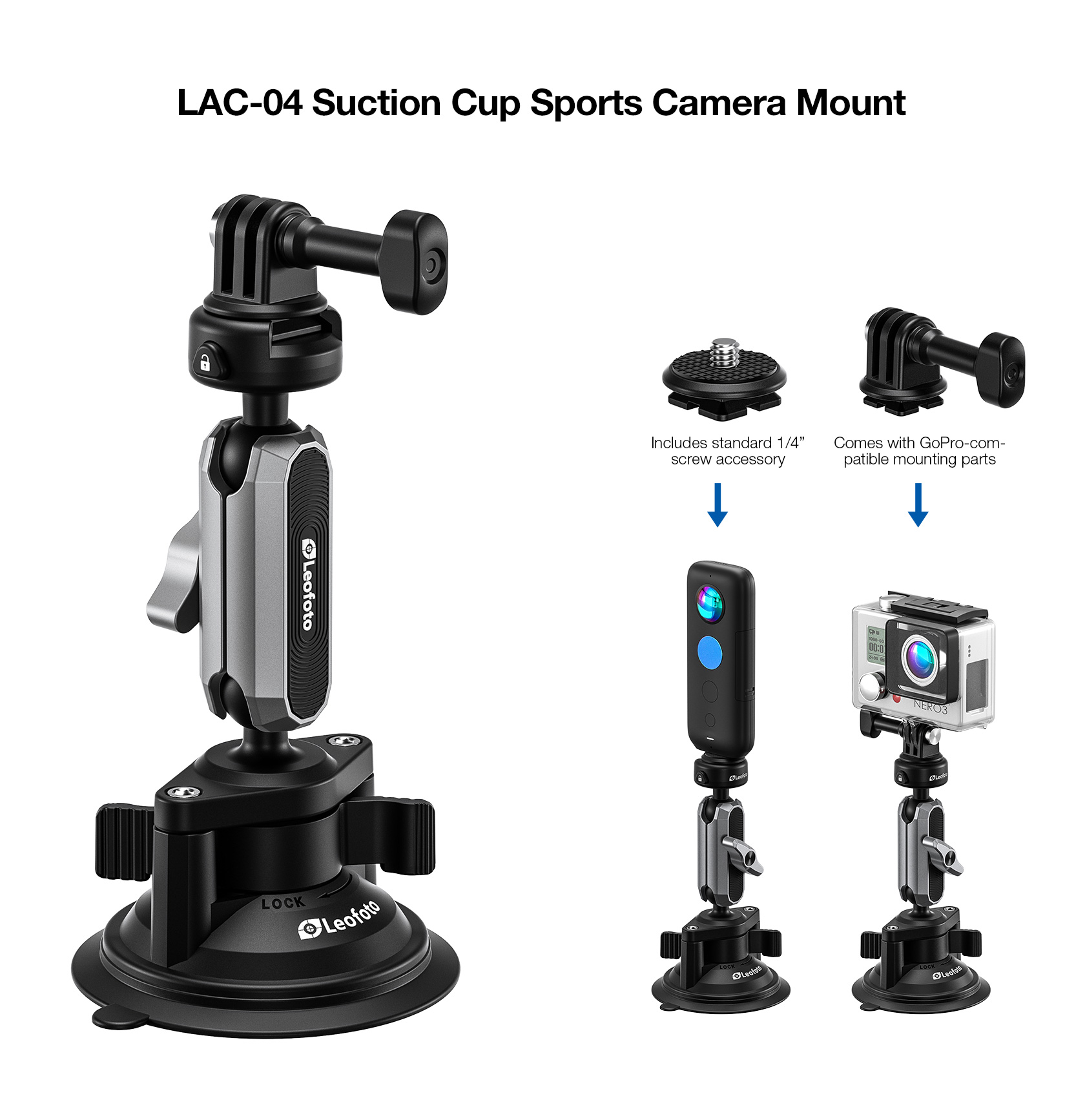 The Leofoto LAC-04 Suction Cup Sports Camera Mount features a reinforced vacuum suction system with knob control, providing strong and reliable suction on a wide range of smooth surfaces. Its highly flexible design makes it suitable for various scenarios, from cars and boats to other flat surfaces.