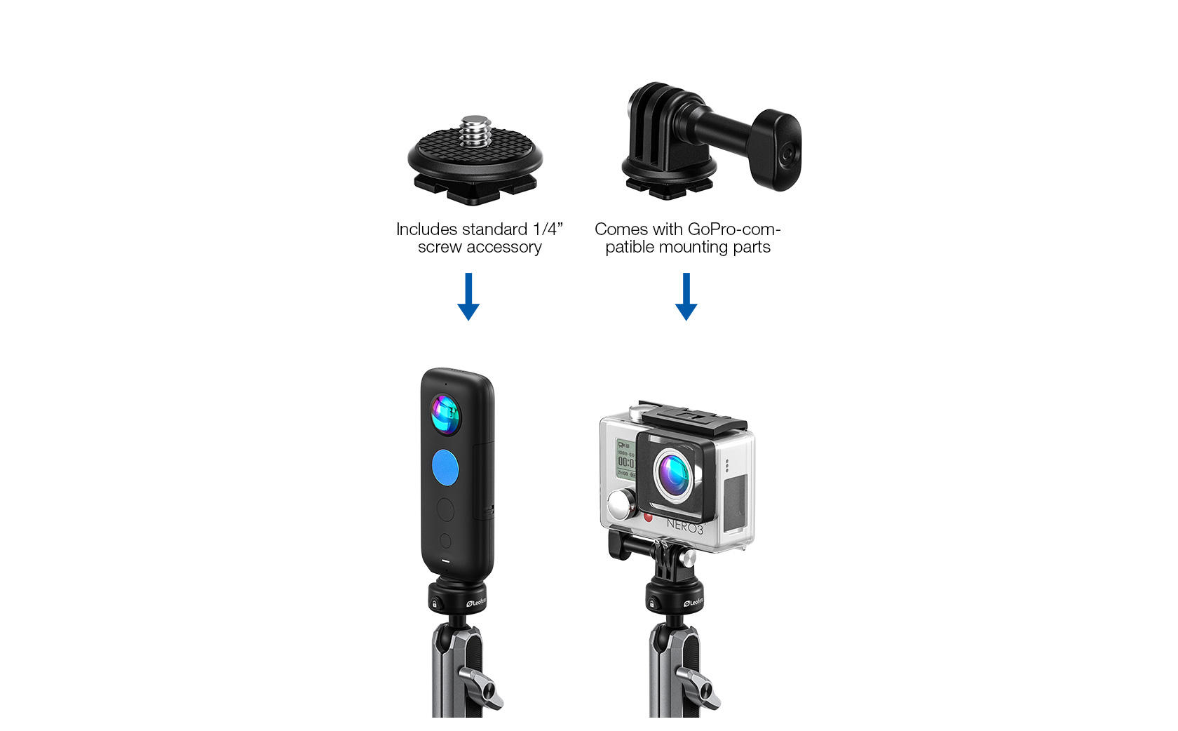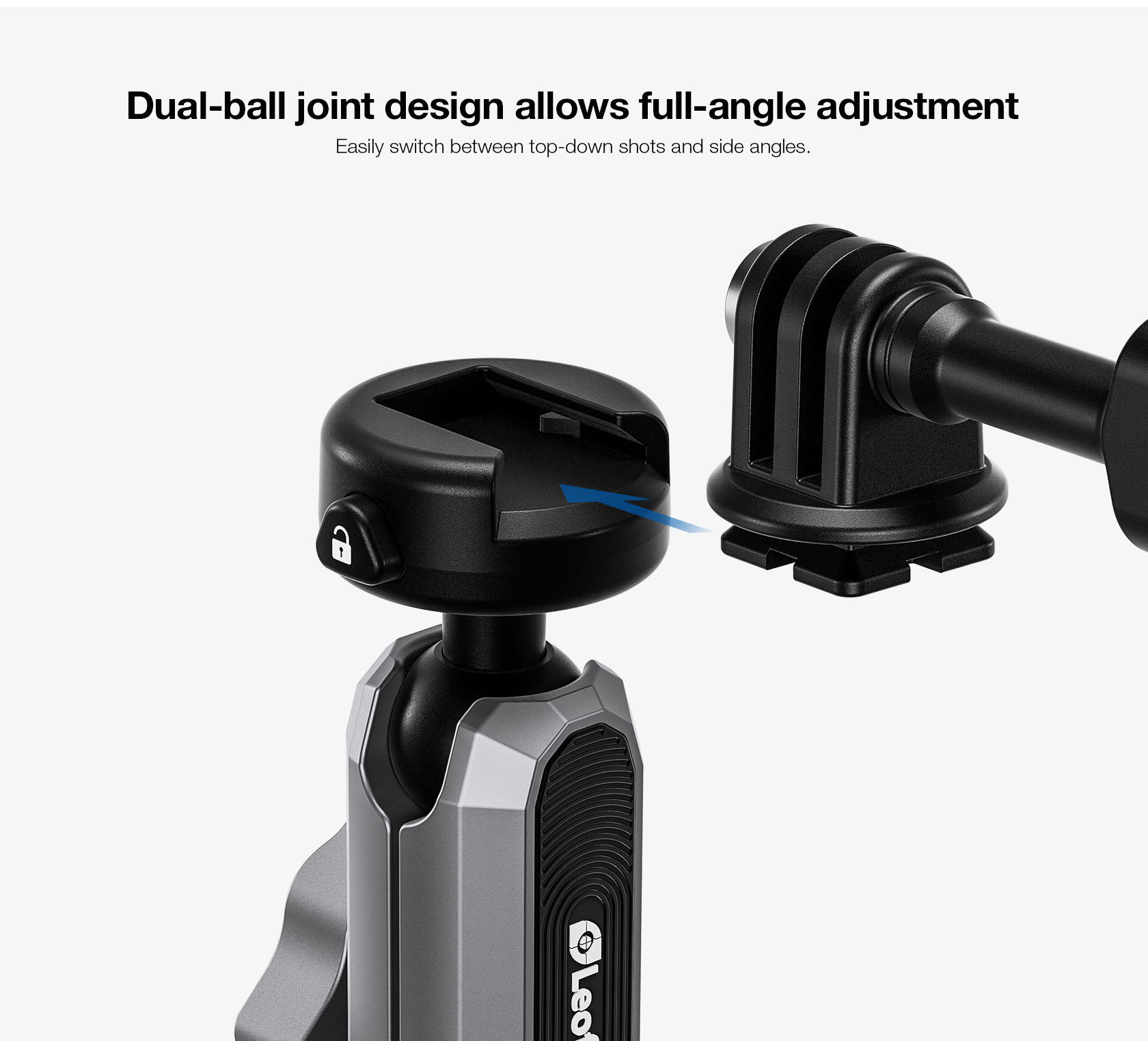 It includes a built-in 20mm (0.79 in) ball head for flexible camera positioning and can securely hold cameras weighing up to 5 kg (11 lbs), with a recommended load under 1 kg (2.2 lbs) for bumpy conditions.