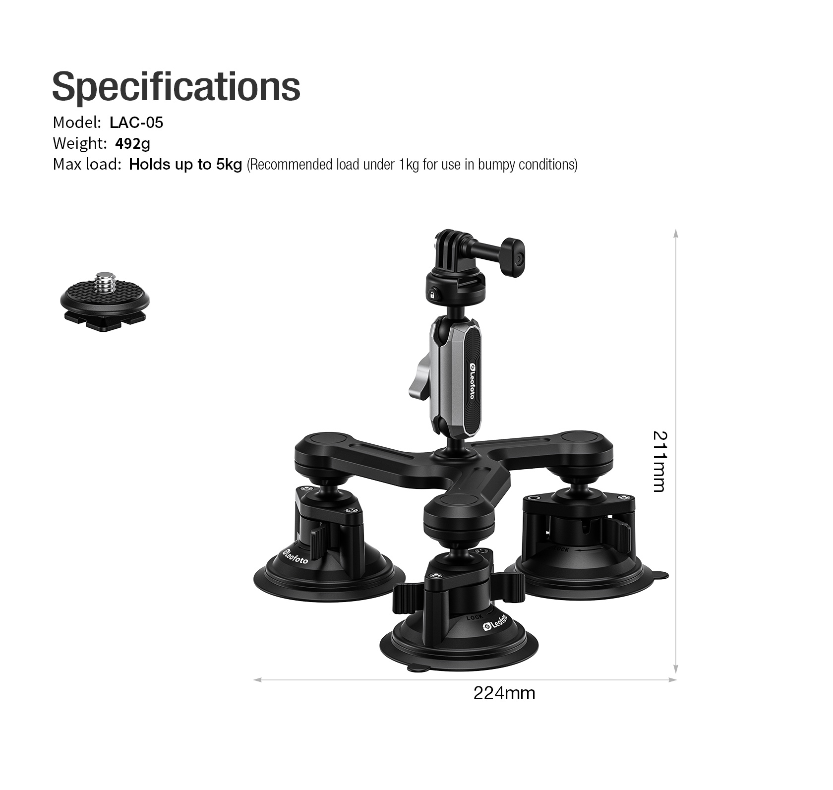 The Leofoto LAC-05 Triple Suction Cup Sports Camera Mount is built for maximum stability, featuring a three-cup suction design that delivers a rock-solid hold on smooth, non-porous surfaces. Perfect for vehicles, glass, or polished metal, this mount keeps your camera steady even in high-motion scenarios.