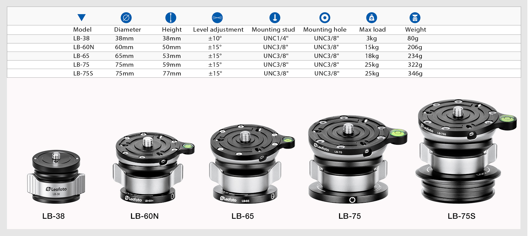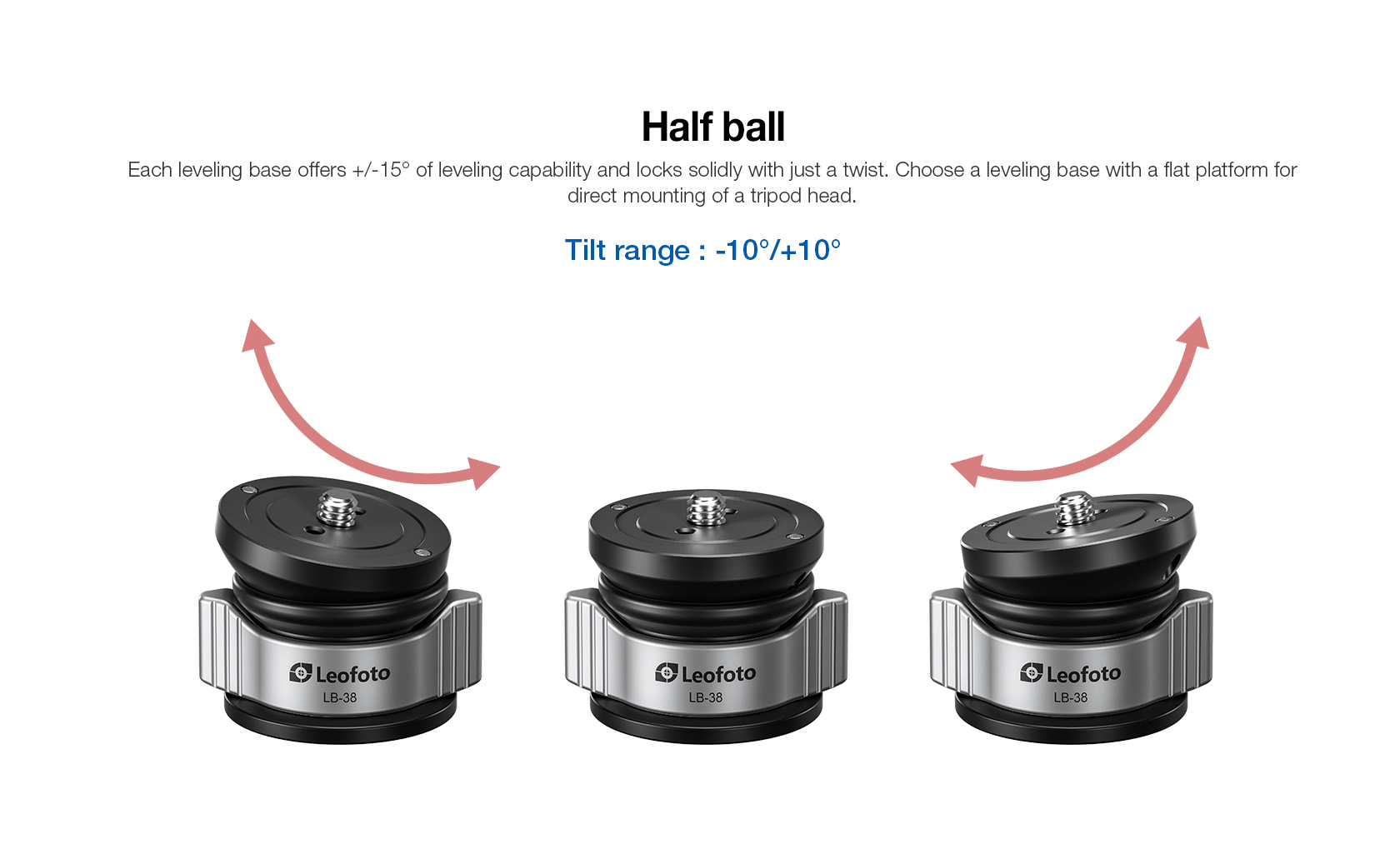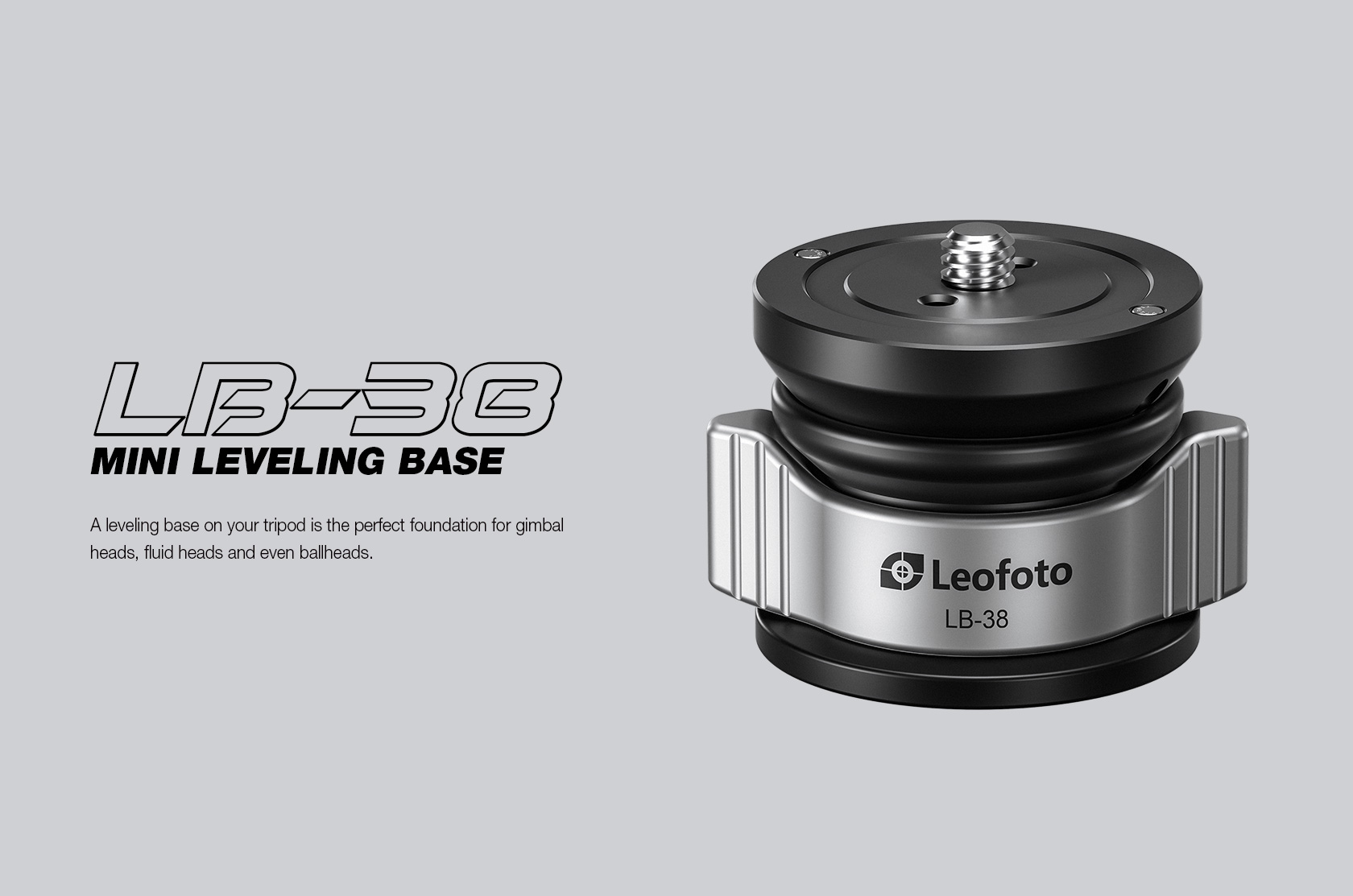 The Leofoto LB Series Leveling Base with Butterfly Handle acts like a half ball, with the LB-38 mini providing a leveling range of +/-10°, while the other models in the series offer a range of +/-15°. It locks easily and securely in position with a twist of the large butterfly handle at the base of the ball. This leveling base installs on any tripod with a 3/8″ mounting stud.