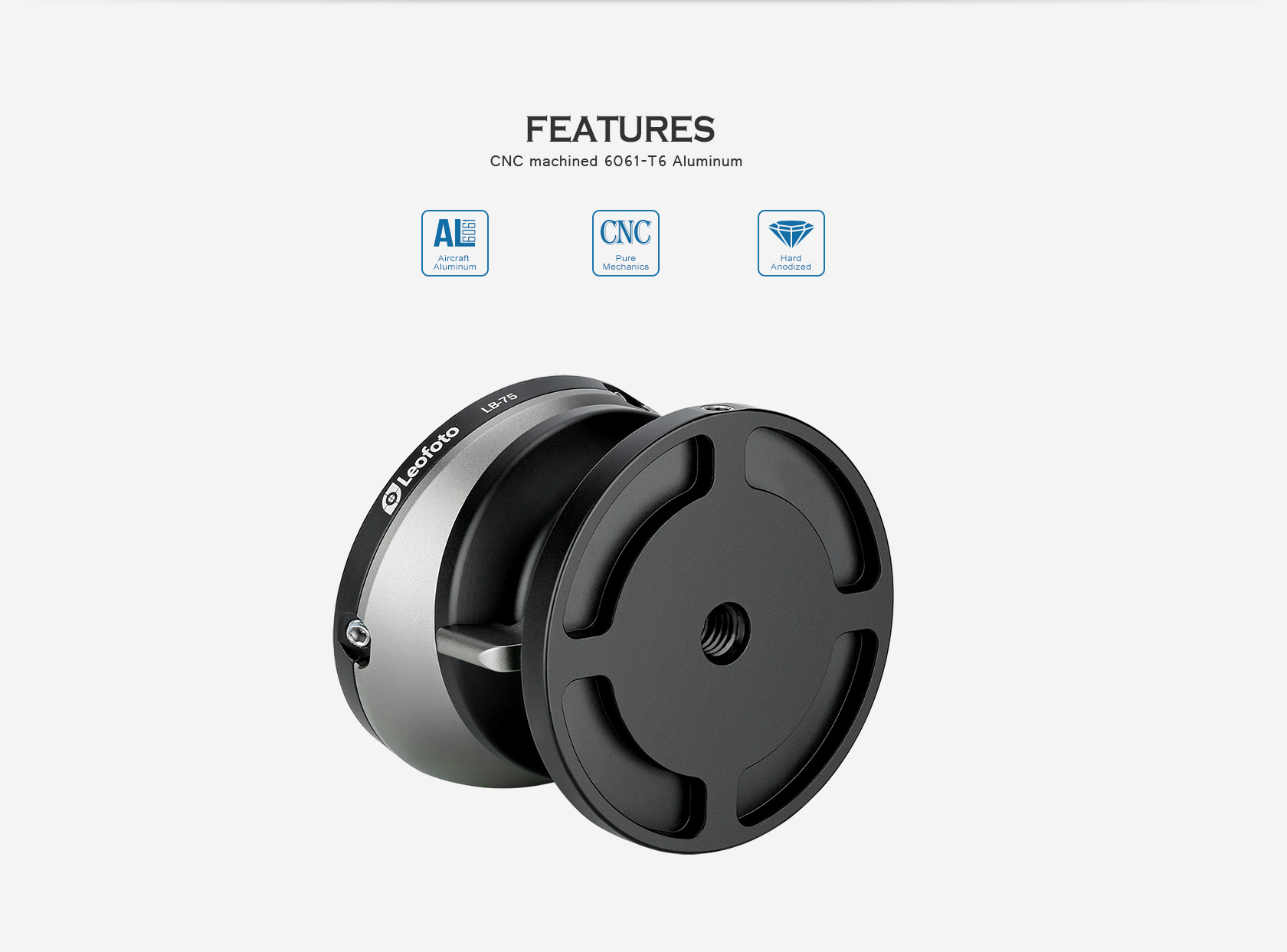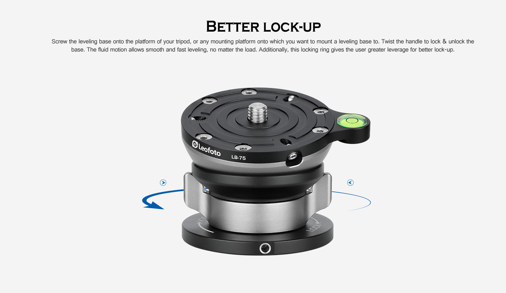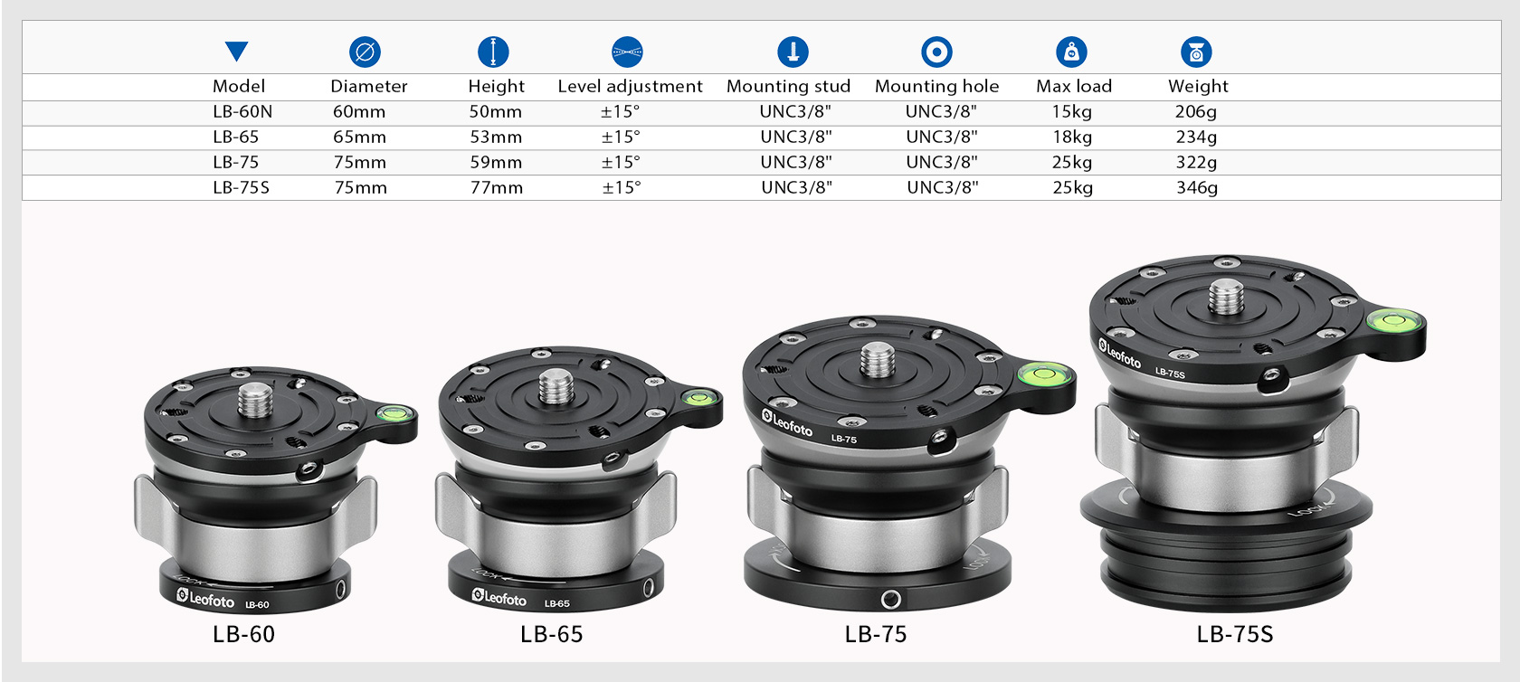 The Leofoto LB Series Leveling Base with Butterfly Handle acts like a half ball, with the LB-38 mini providing a leveling range of +/-10°, while the other models in the series offer a range of +/-15°. It locks easily and securely in position with a twist of the large butterfly handle at the base of the ball. This leveling base installs on any tripod with a 3/8″ mounting stud.