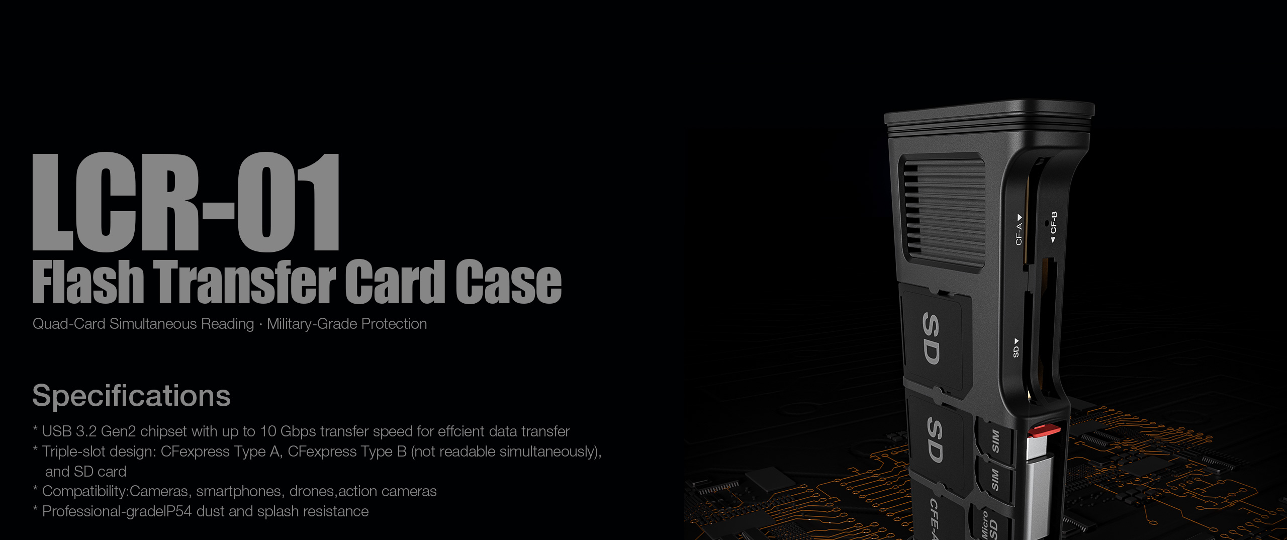 The LCR-01 Flash Transfer Card Case is a professional-grade card reader and protective storage solution designed for fast data access and secure card management. Supporting multiple high-speed card formats and built with rugged, travel-ready protection, it is ideal for photographers, videographers, and mobile professionals working in demanding environments.