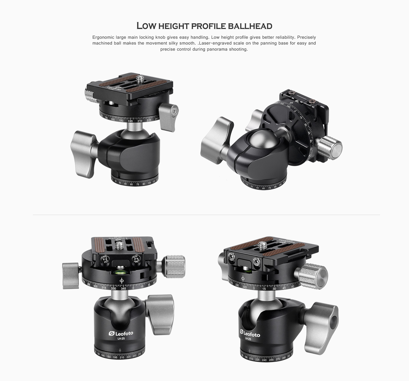 The Leofoto LH Series Ball Head is a great support solution in a small form factor for all general photography, and will give you fast and accurate control and solid support of your camera or lens. Aiming and horizon leveling can be accomplished as one instinctive motion, and rigid lockup takes just a quick twist of one control. Since the ball head profile is smaller and lacks the protruding handles, they are also much easier to carry and pack. These are no-nonsense heads with robust capacity, offering minimal weight and elegant simplicity. They excel as ground-level macro tools, but also as super light heads for backpacking, travel, and table top use. The head features a single ball locking knob while the panning base has a separate lock and is laser-engraved in 2.5-degree increments from 0-360 degrees for accurate repeatability.