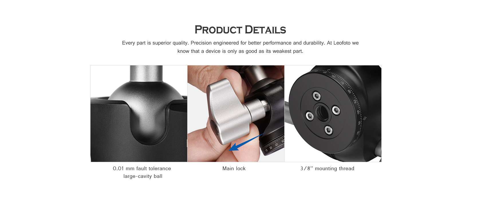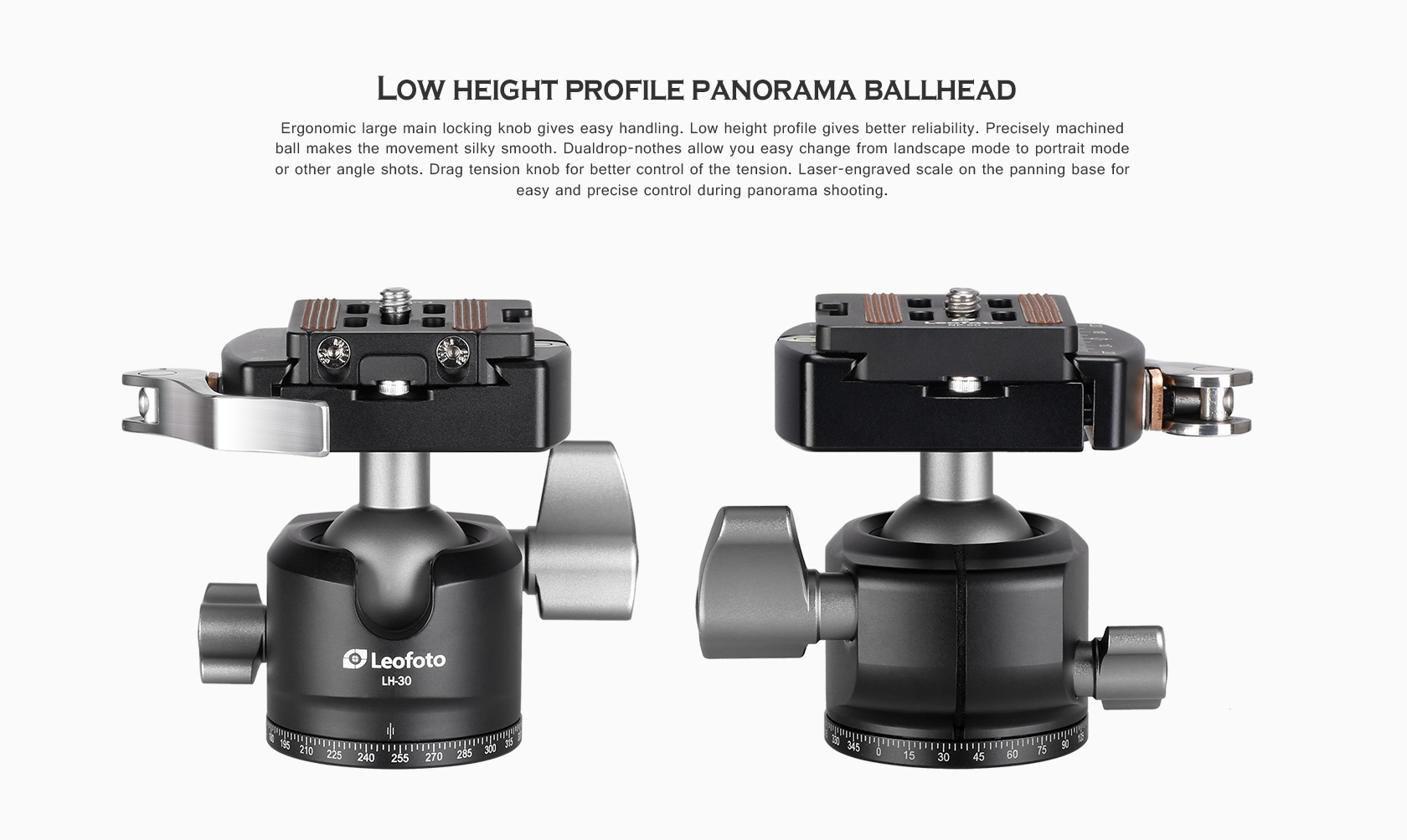 The Leofoto LH Series Ball Head is a great support solution in a small form factor for all general photography, and will give you fast and accurate control and solid support of your camera or lens. Aiming and horizon leveling can be accomplished as one instinctive motion, and rigid lockup takes just a quick twist of one control. Since the ball head profile is smaller and lacks the protruding handles, they are also much easier to carry and pack. These are no-nonsense heads with robust capacity, offering minimal weight and elegant simplicity. They excel as ground-level macro tools, but also as super light heads for backpacking, travel, and table top use. The head features a single ball locking knob while the panning base has a separate lock and is laser-engraved in 2.5-degree increments from 0-360 degrees for accurate repeatability.