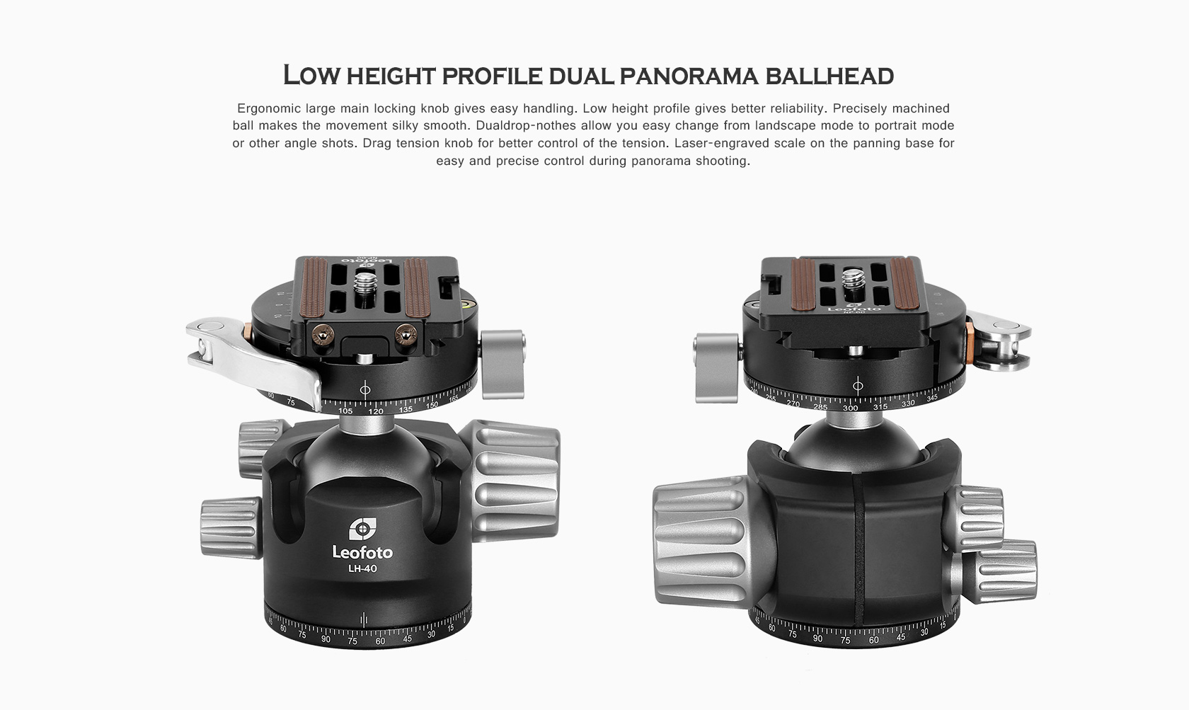 The Leofoto LH Series Ball Head is a great support solution in a small form factor for all general photography, and will give you fast and accurate control and solid support of your camera or lens. Aiming and horizon leveling can be accomplished as one instinctive motion, and rigid lockup takes just a quick twist of one control. Since the ball head profile is smaller and lacks the protruding handles, they are also much easier to carry and pack. These are no-nonsense heads with robust capacity, offering minimal weight and elegant simplicity. They excel as ground-level macro tools, but also as super light heads for backpacking, travel, and table top use. The head features a single ball locking knob while the panning base has a separate lock and is laser-engraved in 2.5-degree increments from 0-360 degrees for accurate repeatability.