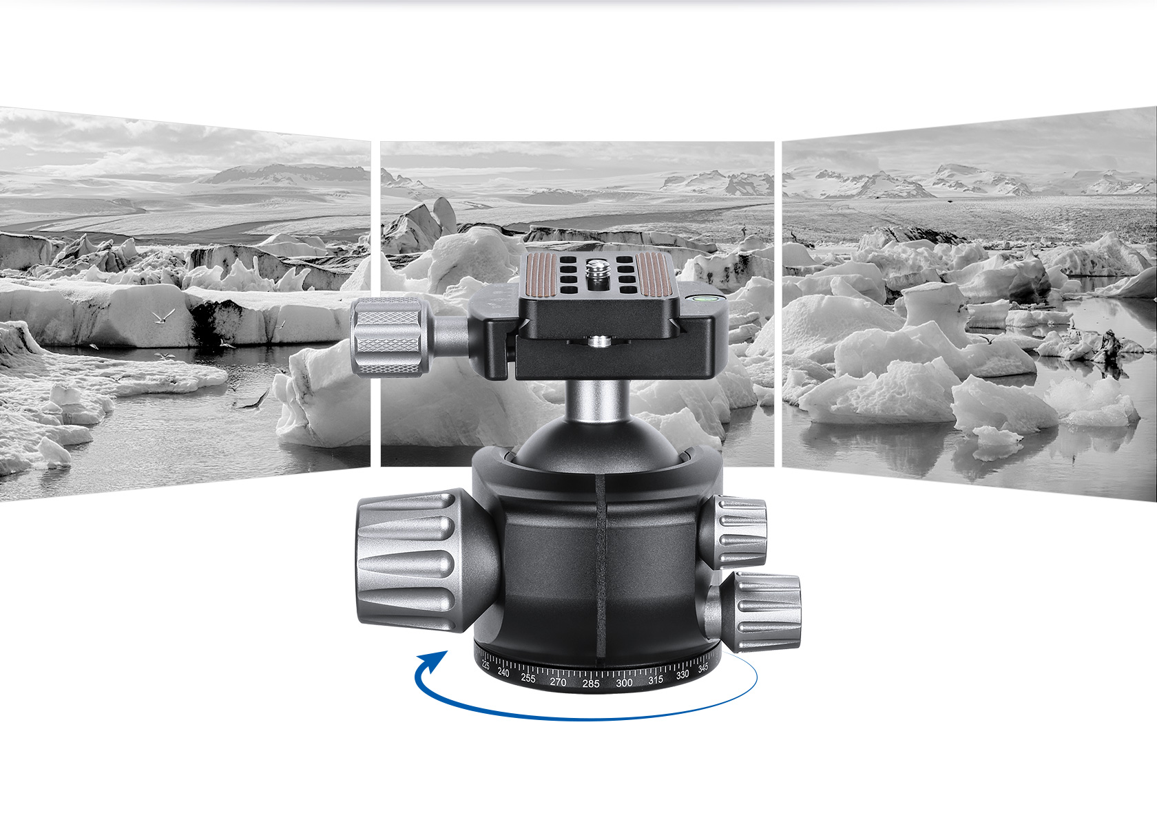 The Leofoto LH Series Ball Head is a great support solution in a small form factor for all general photography, and will give you fast and accurate control and solid support of your camera or lens. Aiming and horizon leveling can be accomplished as one instinctive motion, and rigid lockup takes just a quick twist of one control. Since the ball head profile is smaller and lacks the protruding handles, they are also much easier to carry and pack. These are no-nonsense heads with robust capacity, offering minimal weight and elegant simplicity. They excel as ground-level macro tools, but also as super light heads for backpacking, travel, and table top use. The head features a single ball locking knob while the panning base has a separate lock and is laser-engraved in 2.5-degree increments from 0-360 degrees for accurate repeatability.