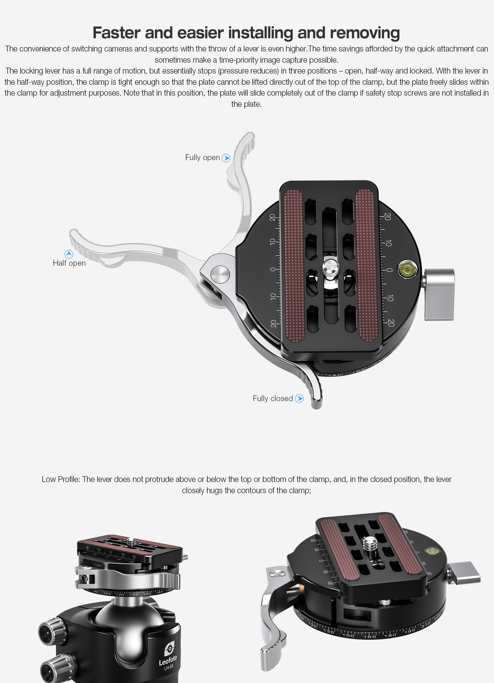 * Low profile keeps the camera closer to the tripod apex for more stability