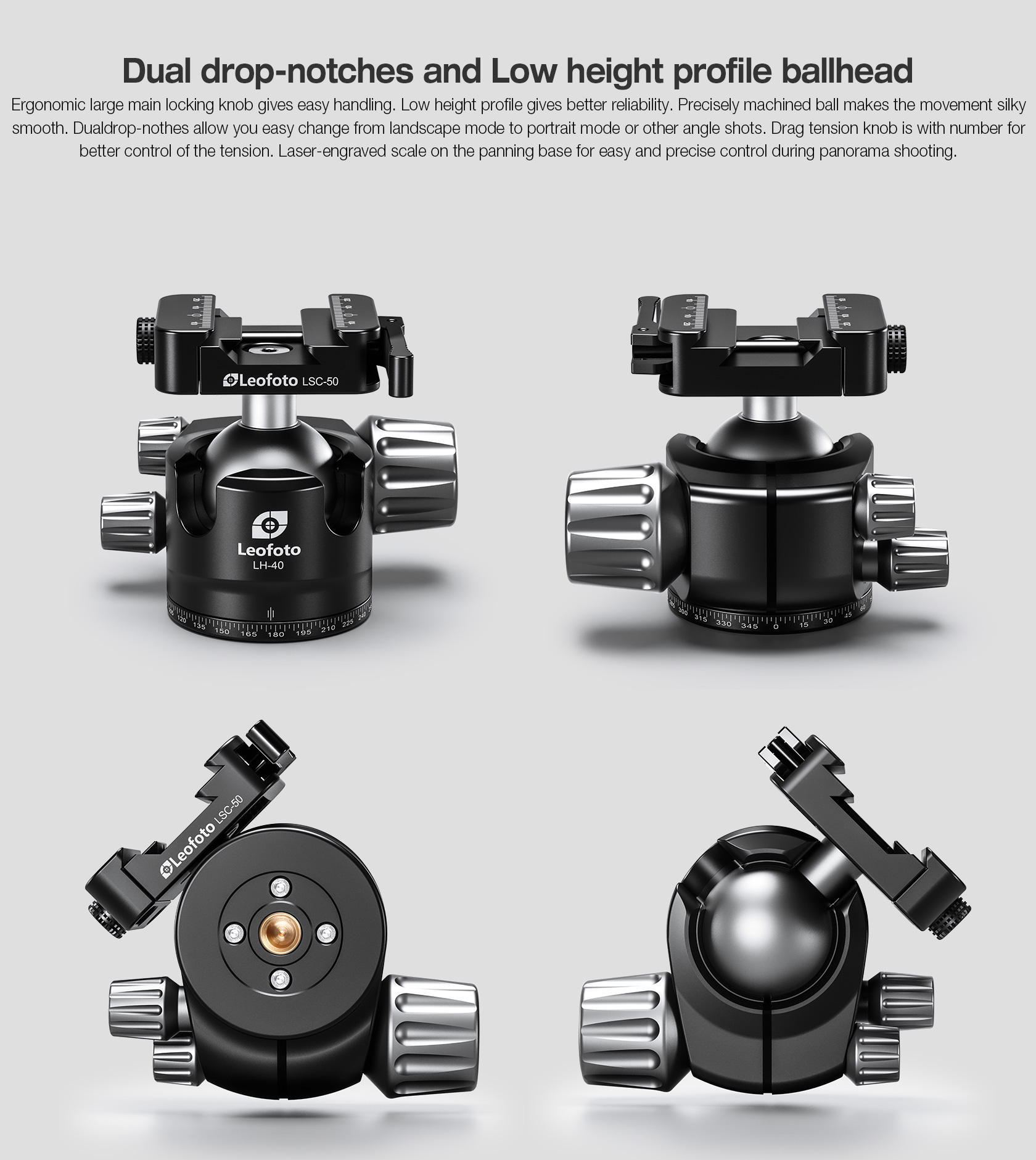 Crafted from high-grade aircraft aluminum and featuring a durable hard-anodized finish, the Leofoto LH-SC Ball Head Series for Shooting/Hunting is designed to meet the stringent demands of professional shooting and hunting. An over-sized, ergonomic locking knob allows 45-degree tilting in all directions and a 90-degree drop-notch facilitates quick and accurate switching from the horizontal to vertical orientation. A separate tension knob is provided to apply the appropriate pressure that safely corresponds to the weight of your firearm. A third knob loosens and locks the panning base which is laser-engraved with markers every 2.5 degrees from 0 to 360 degrees.