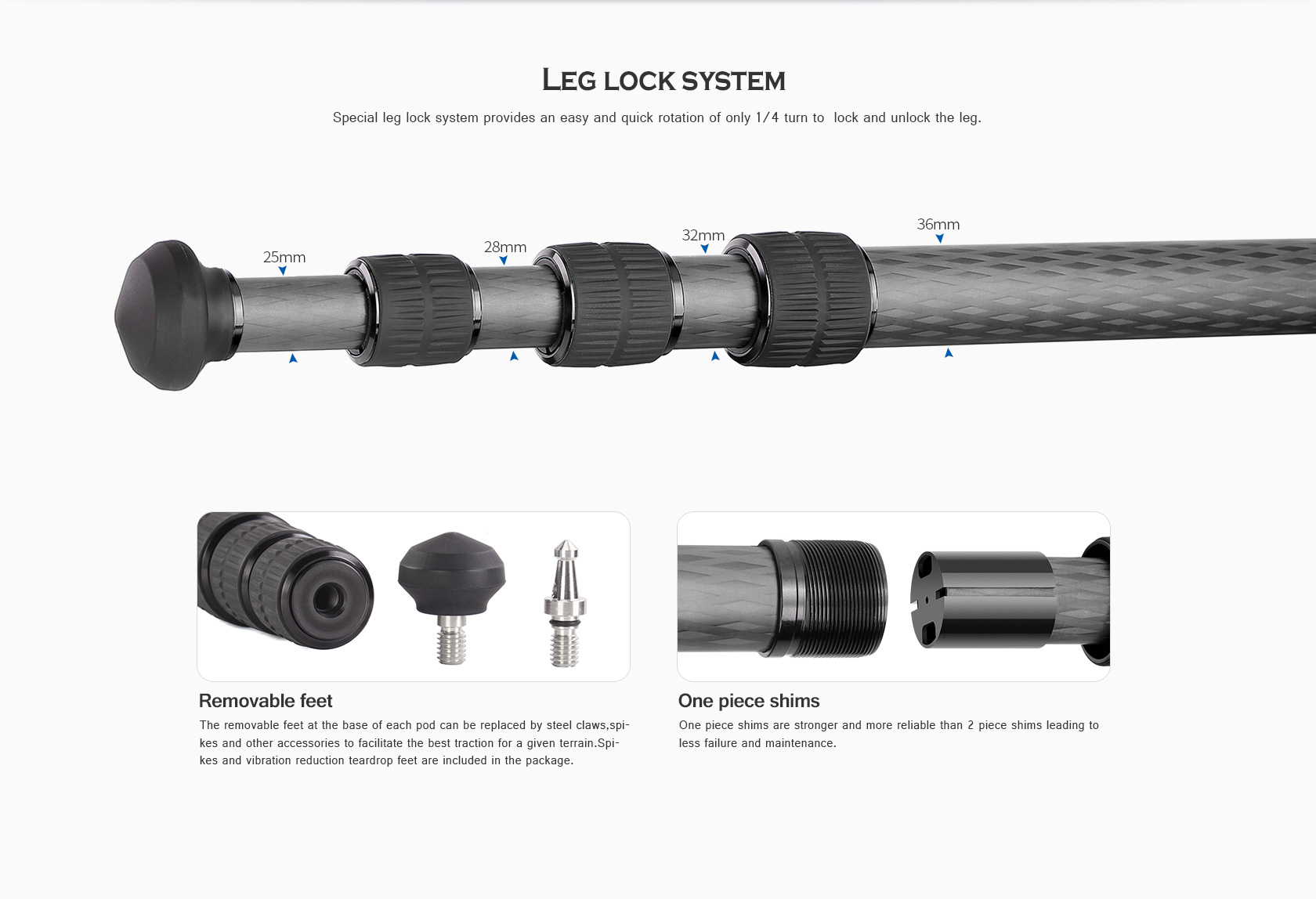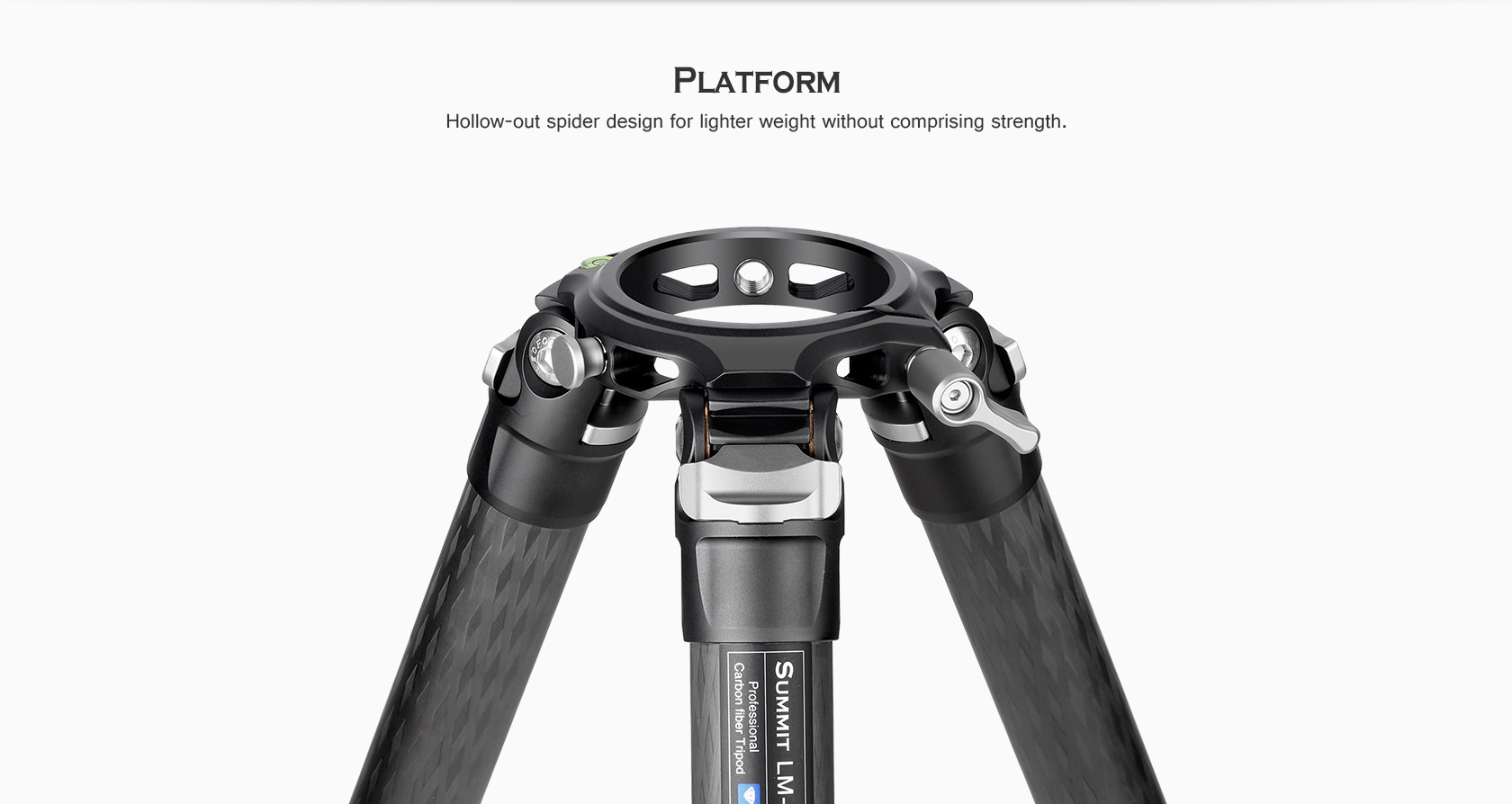 With the tripod’s three variable leg angle stops, it allows you to splay the legs completely out. At the tripod’s apex, the spider has been hollowed out, which adds to the relevance of the tripod’s light weight. Additionally, the mounting platform is removable, so it can be exchanged with the included 75mm video bowl to install a fluid head. An integrated 3/8″-16 socket is made available on the side of the spider for photo or video accessories. Leofoto tripods come with a carrying case to store or travel with the support system.