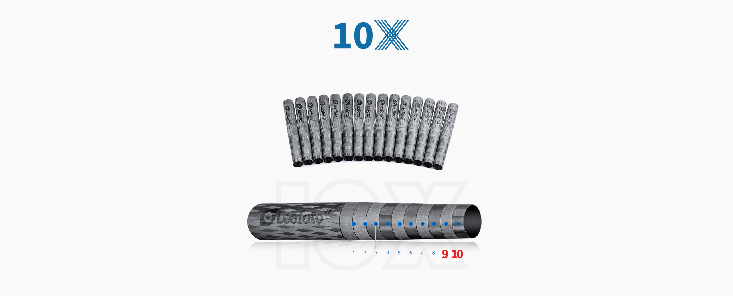 Toray 100% 10-layer carbon fiber leg tubes feature cross rhombus structure for greater strength, stability and less vibration.
