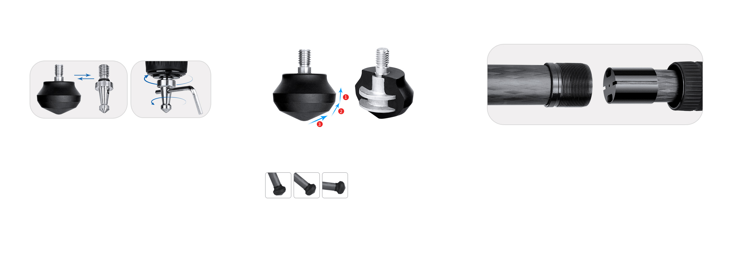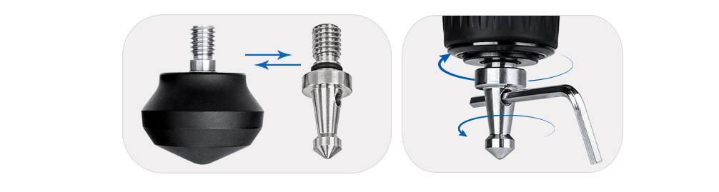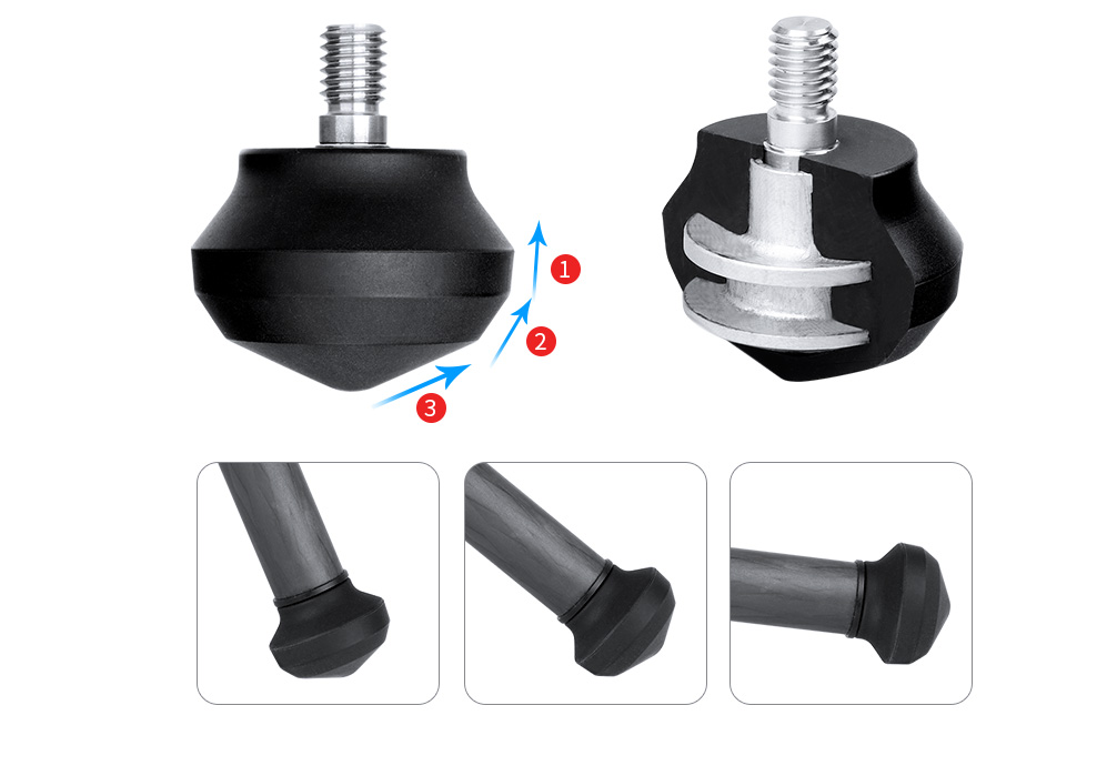 Standard rubber feet protects indoor surfaces, Spiked feet is useful for softer ground like mud, gravel, sand or loose terrain
