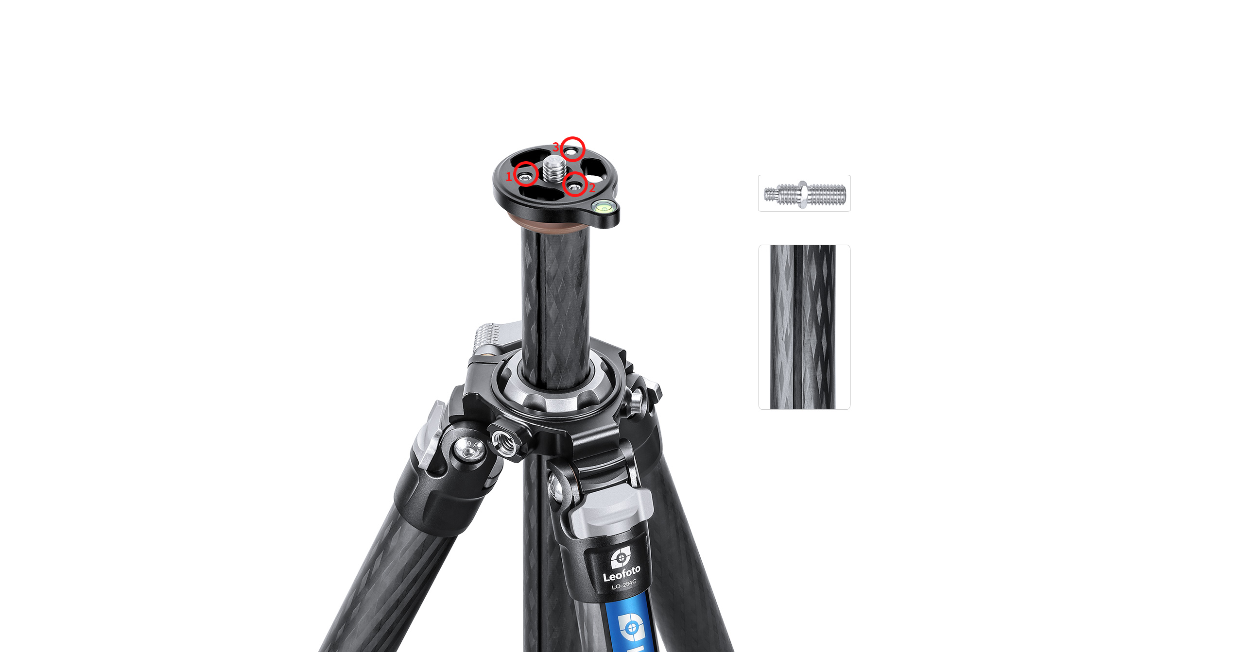On the center column, there are 2 Allen screws (#1,2) to prevent the mounting base from twisting and 1 Allen screw (#3) to prevent the ballhead from twisting.