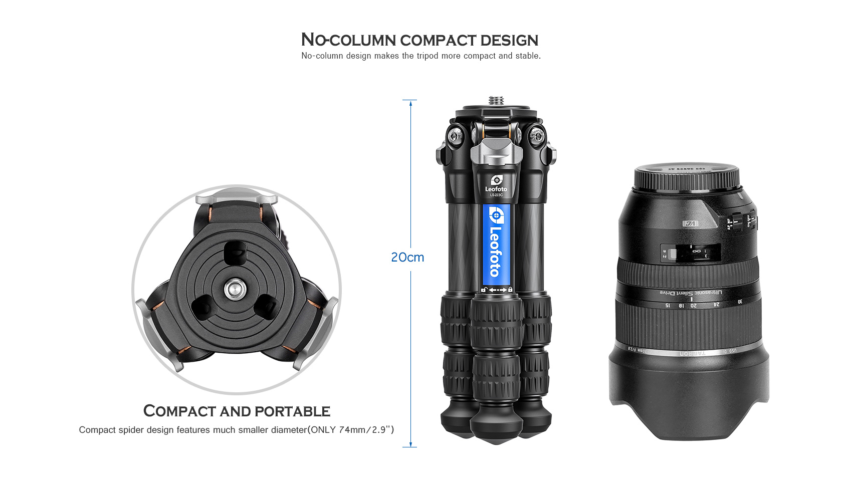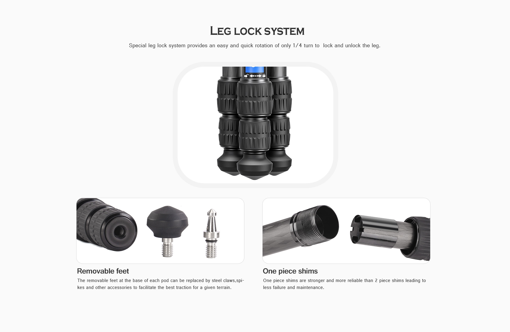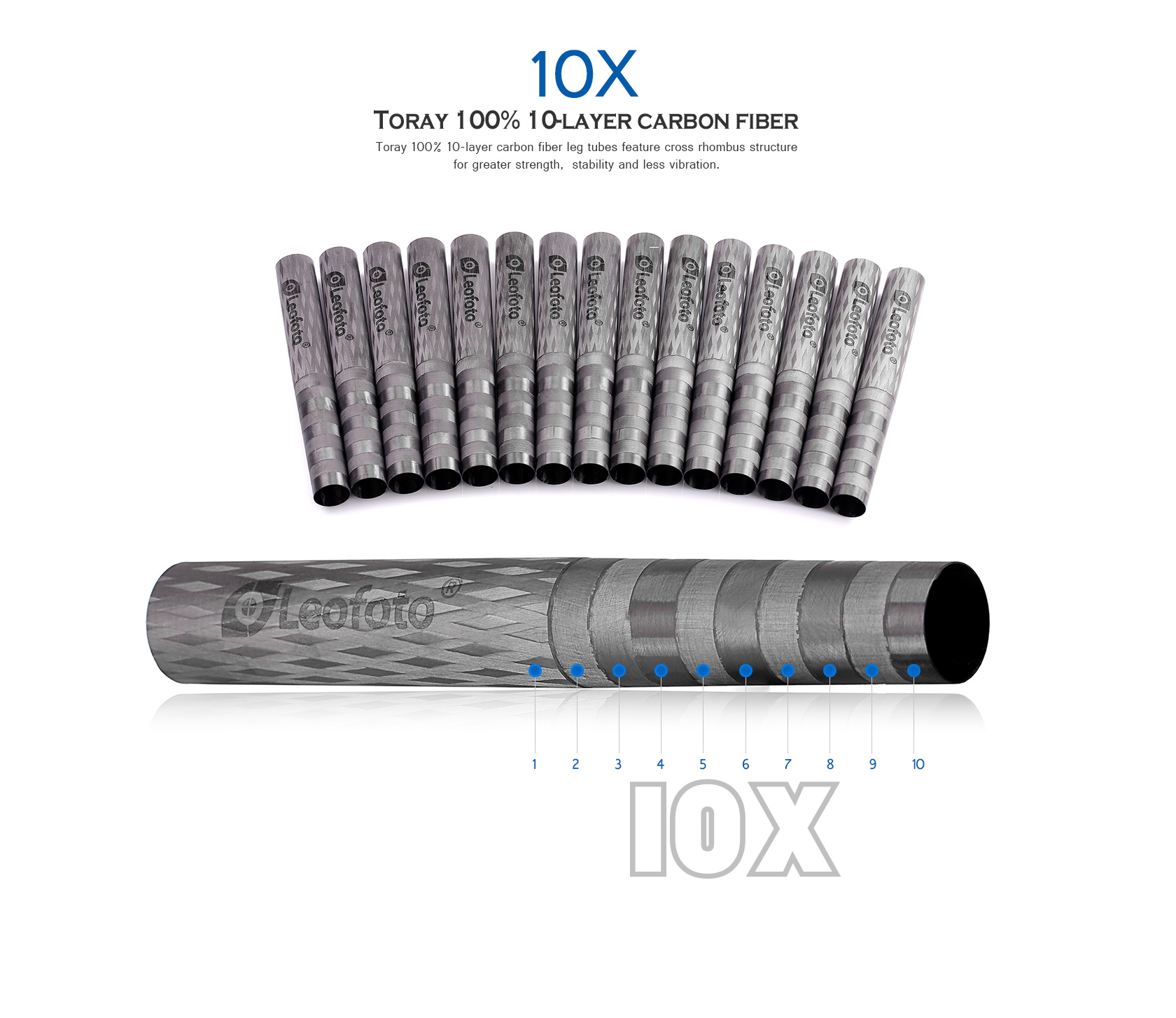 Toray 100% 10-layer carbon fiber leg tubes feature cross rhombus structure for greater strength, stability and less vibration.