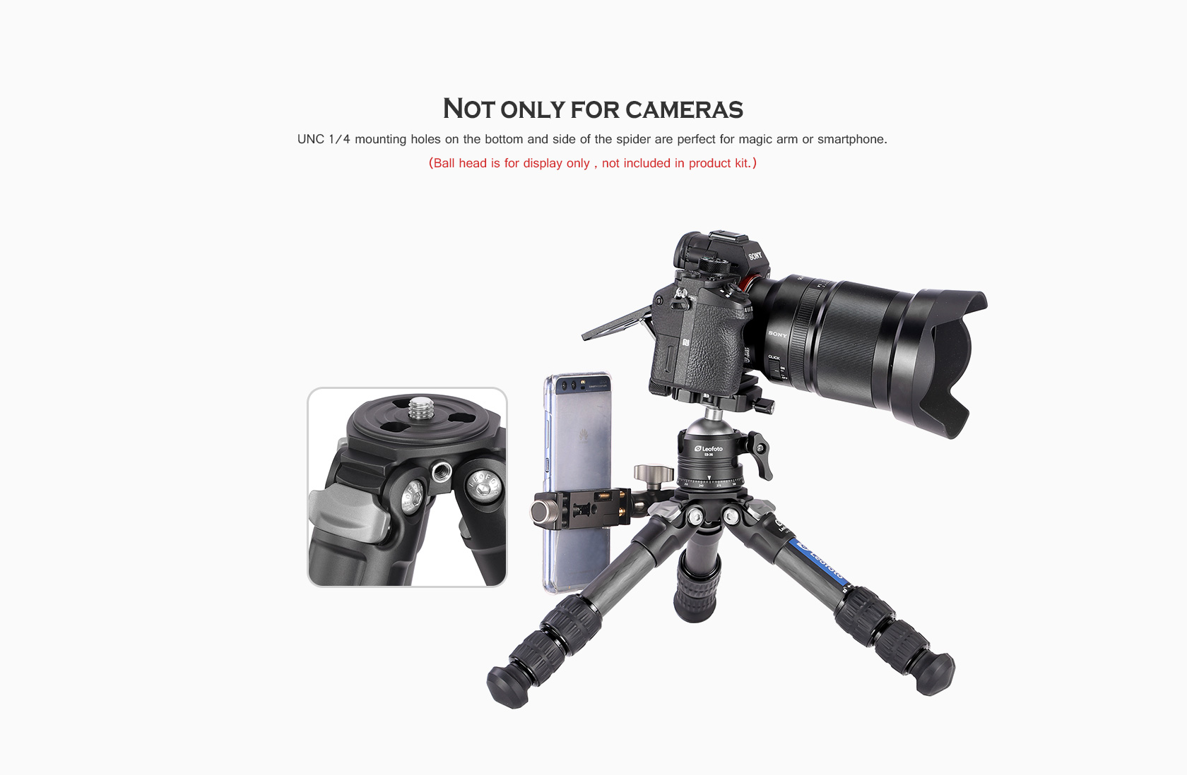 UNC 1/4 mounting holes on the bottom and side of the spider are perfect for magic arm or smartphone.