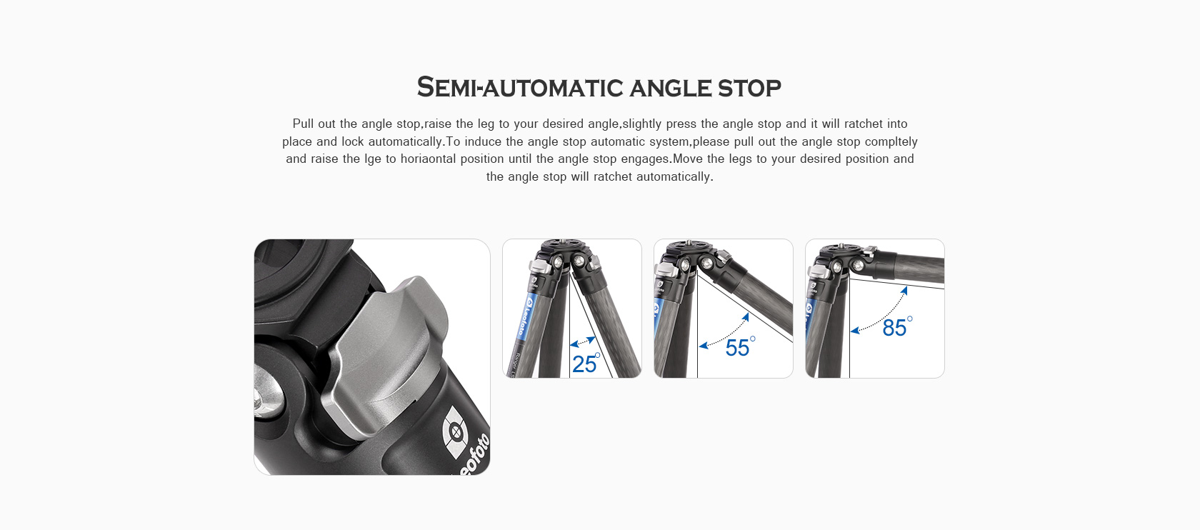 Pull out the angle stop,raise the leg to your desired angle,slightly press the angle stop and it will ratchet into place and lock automatically.To induce the angle stop automatic system,please pull out the angle stop compltely and raise the lge to horiaontal position until the angle stop engages.Move the legs to your desired position and the angle stop will ratchet automatically.