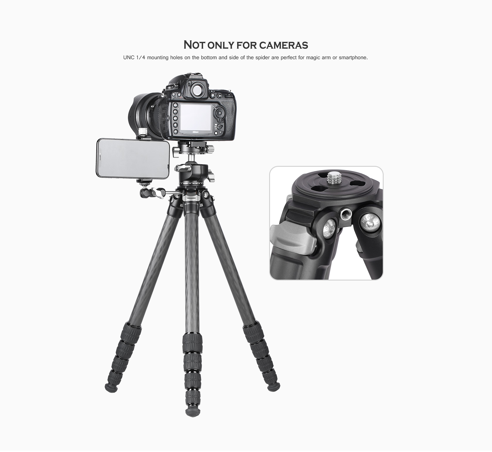 UNC 1/4 mounting holes on the bottom and side of the spider are perfect for magic arm or smartphone.