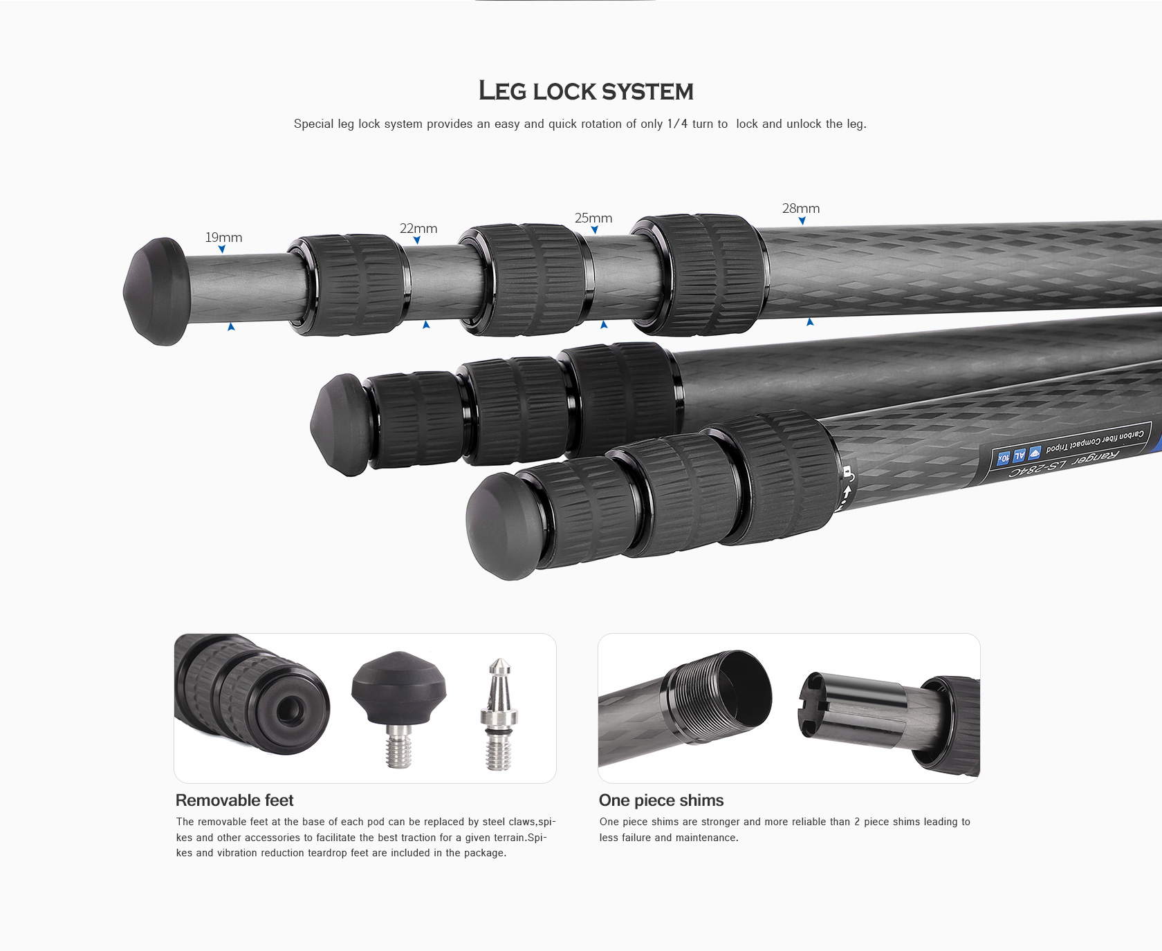 Toray 100% 10-layer carbon fiber leg tubes feature cross rhombus structure for greater strength, stability and less vibration.