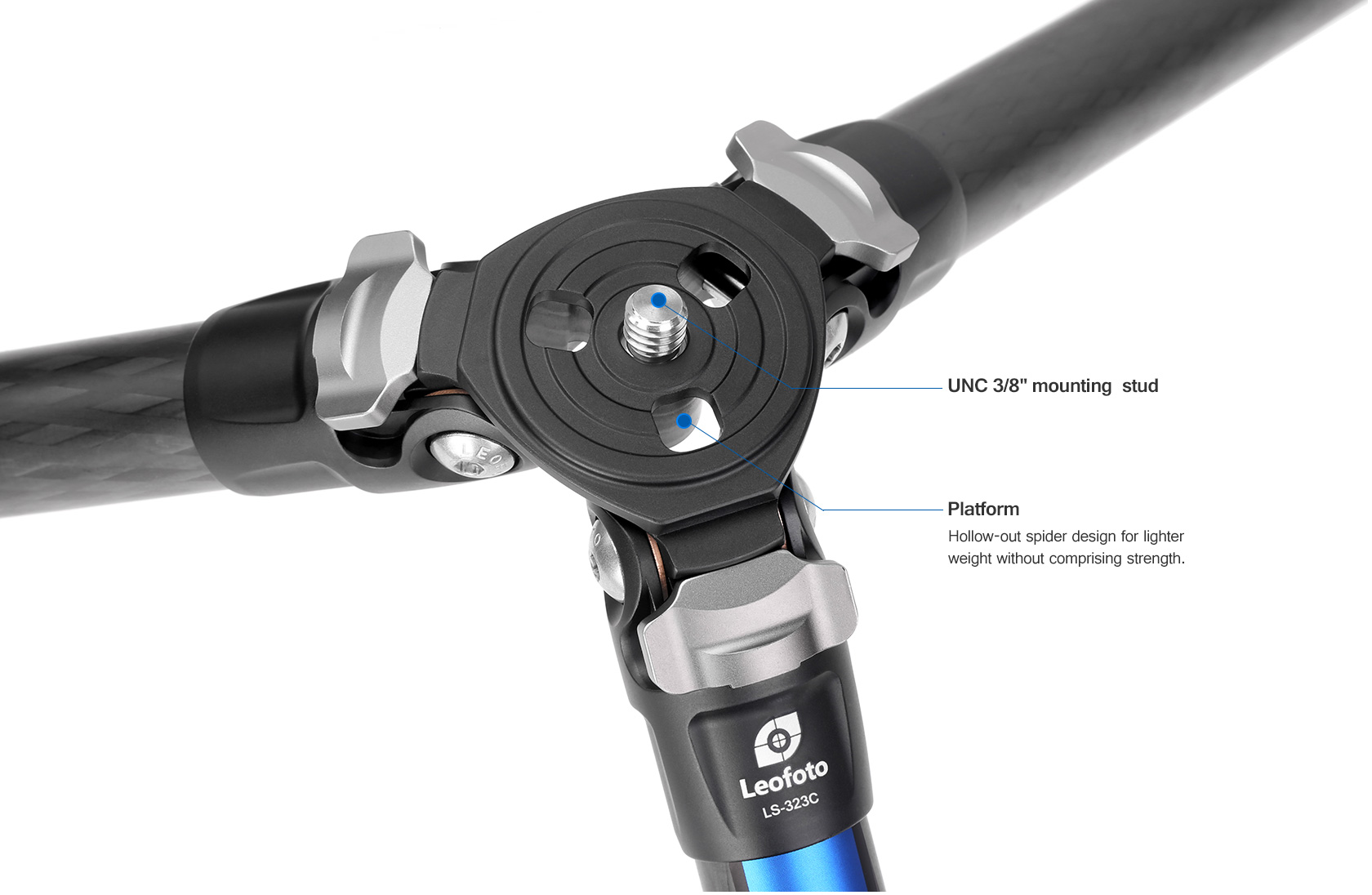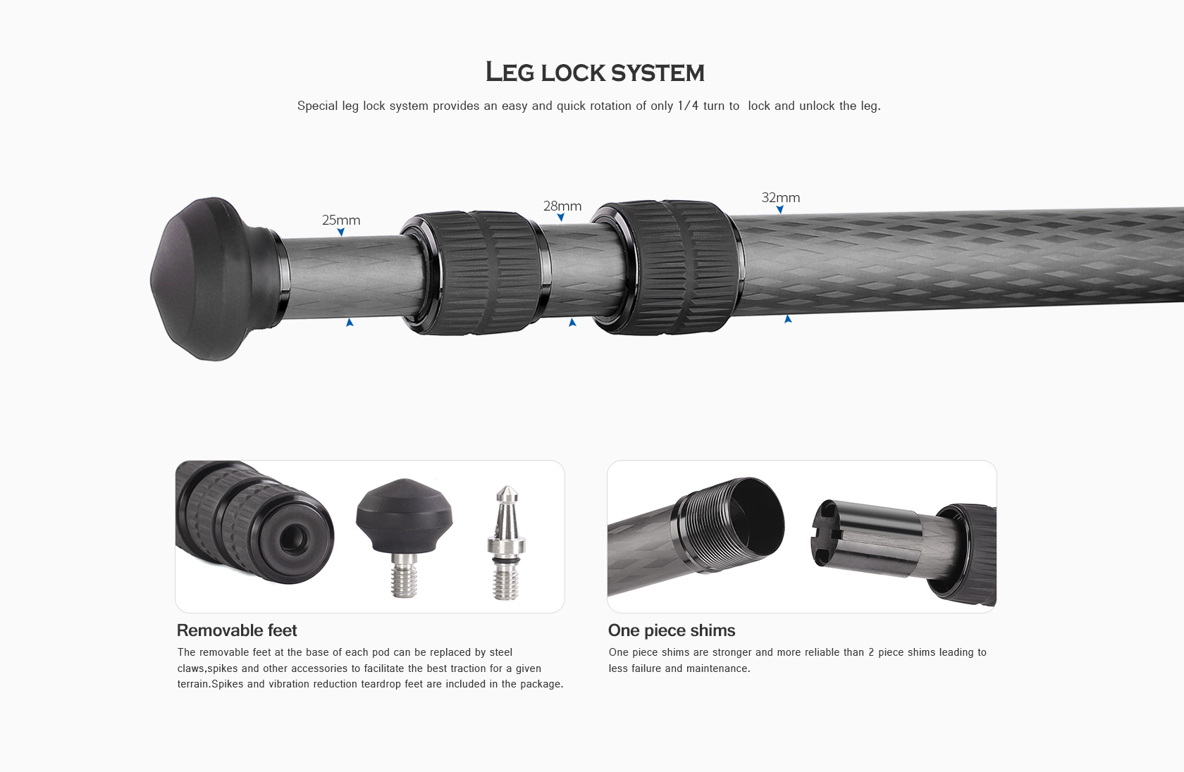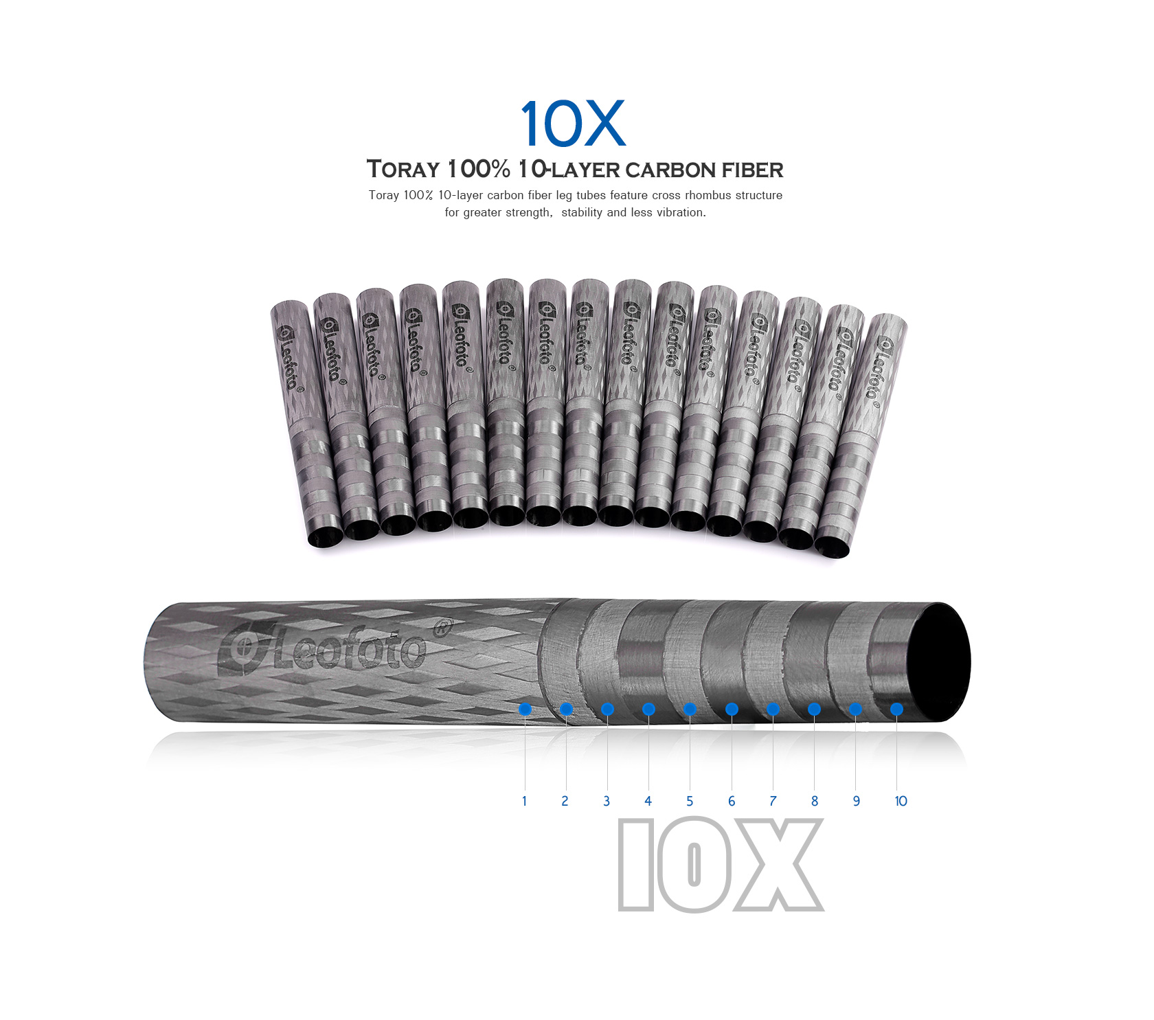 Toray 100% 10-layer carbon fiber leg tubes feature cross rhombus structure for greater strength, stability and less vibration.