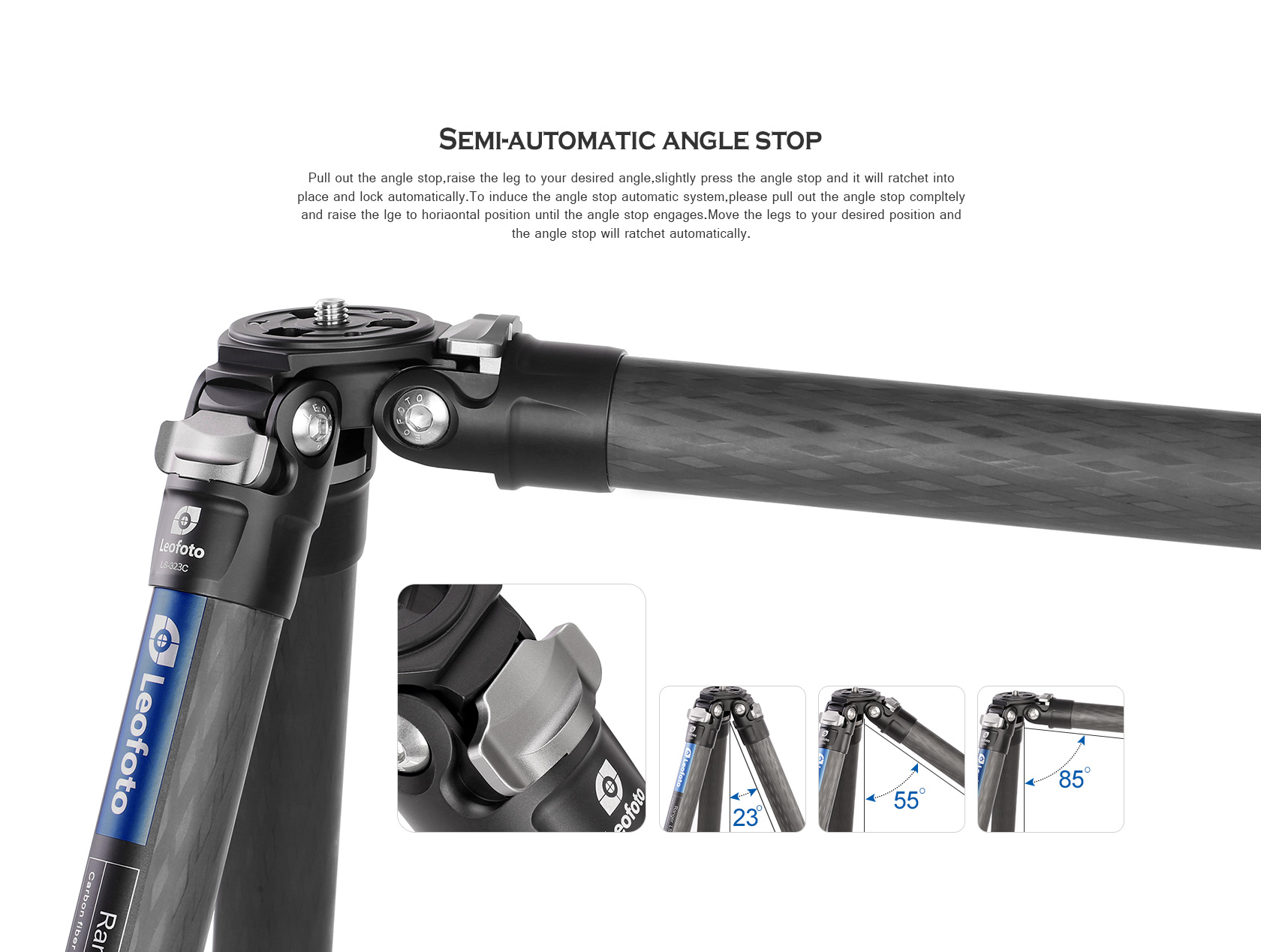 Pull out the angle stop,raise the leg to your desired angle,slightly press the angle stop and it will ratchet into place and lock automatically.To induce the angle stop automatic system,please pull out the angle stop compltely and raise the lge to horiaontal position until the angle stop engages.Move the legs to your desired position and the angle stop will ratchet automatically.
