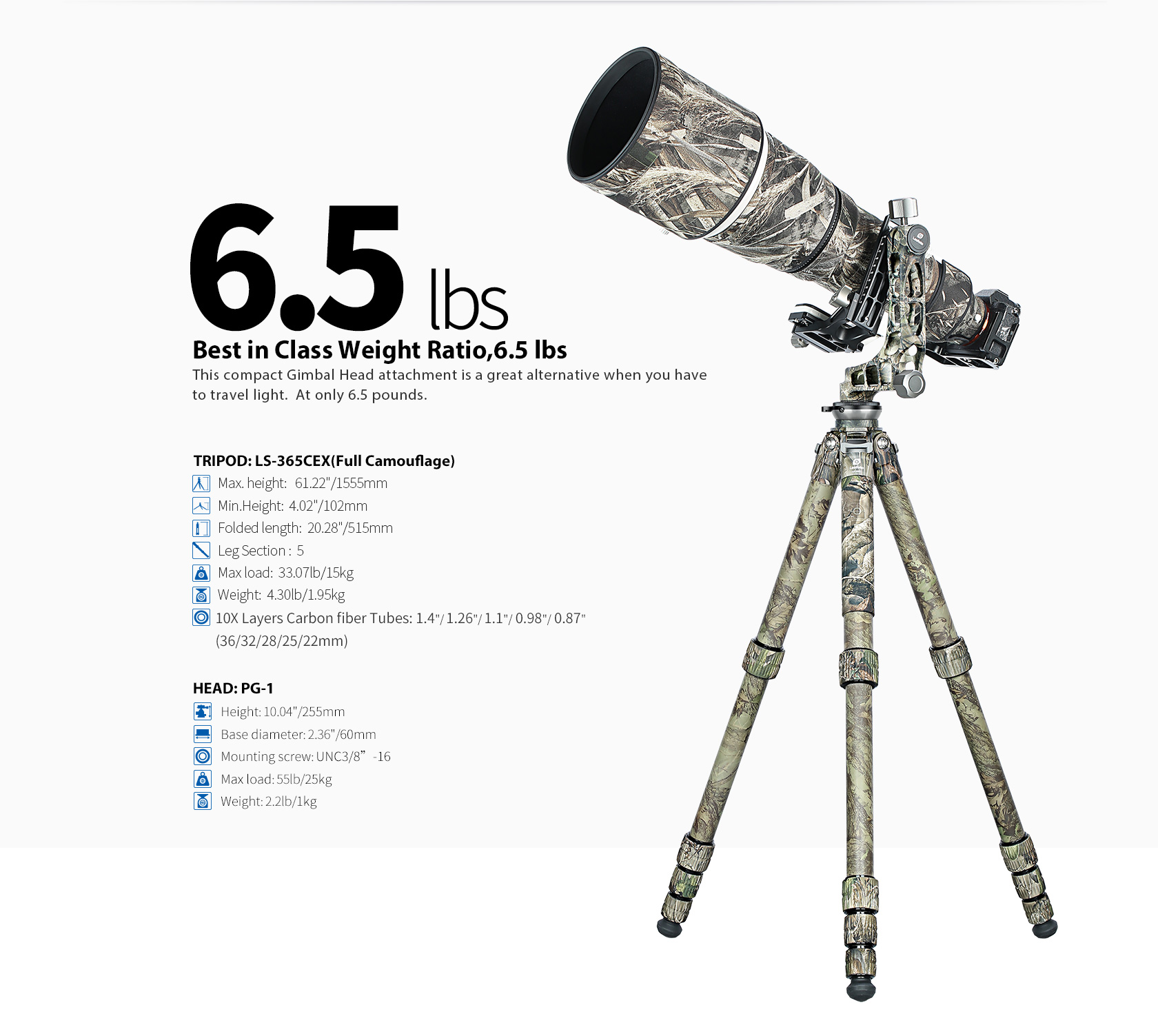Leofoto LS-365CEX+PG-1(Full Camouflage) Professional carbon fiber tripod