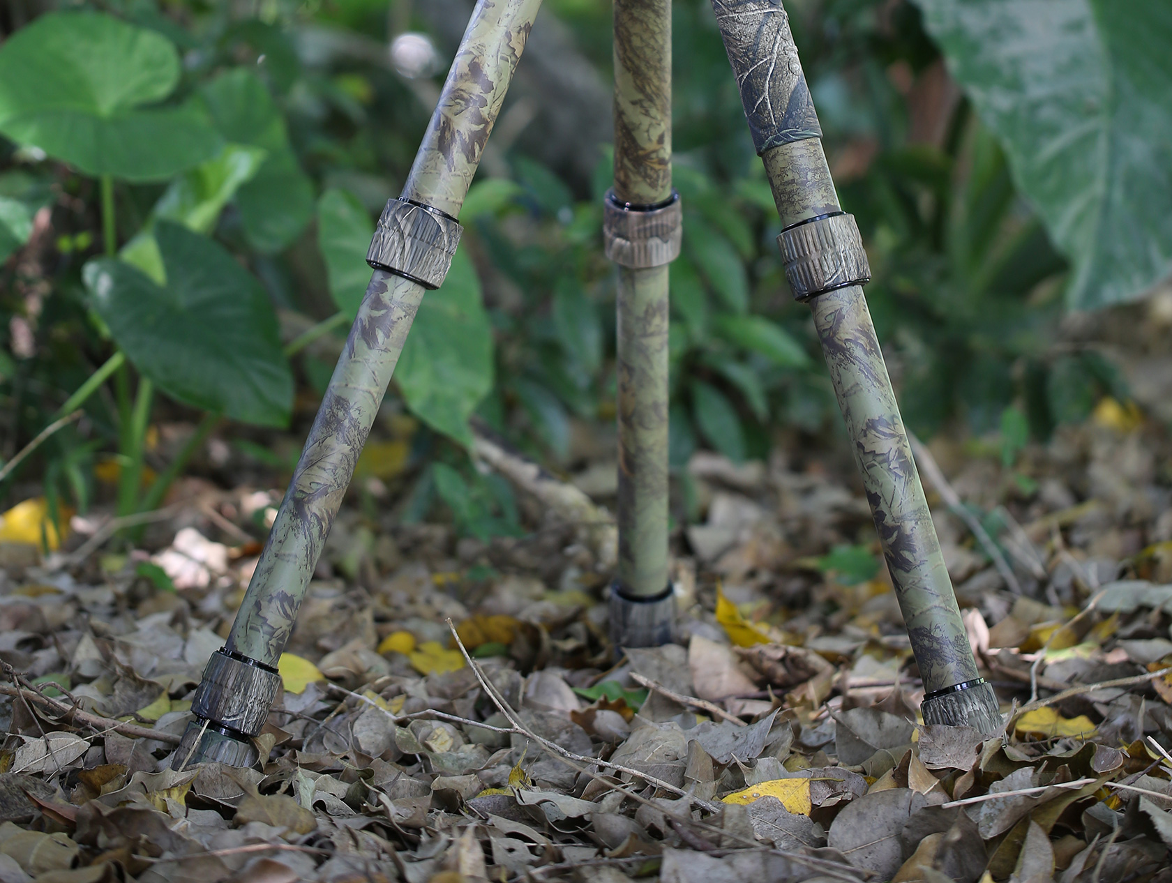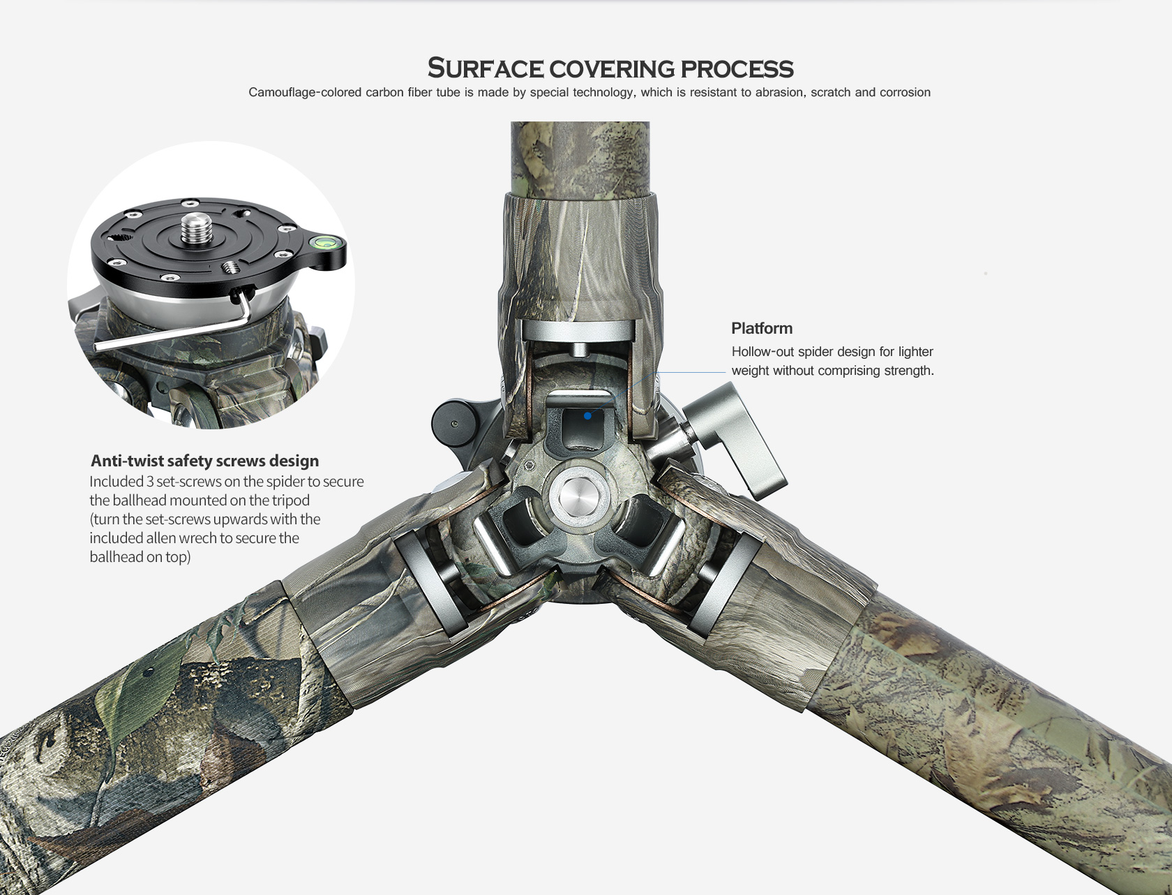 95% of the components including aluminum alloy spider, 10 layers of carbon fiber tube and anti-slip rubber mats are jungle camouflage
